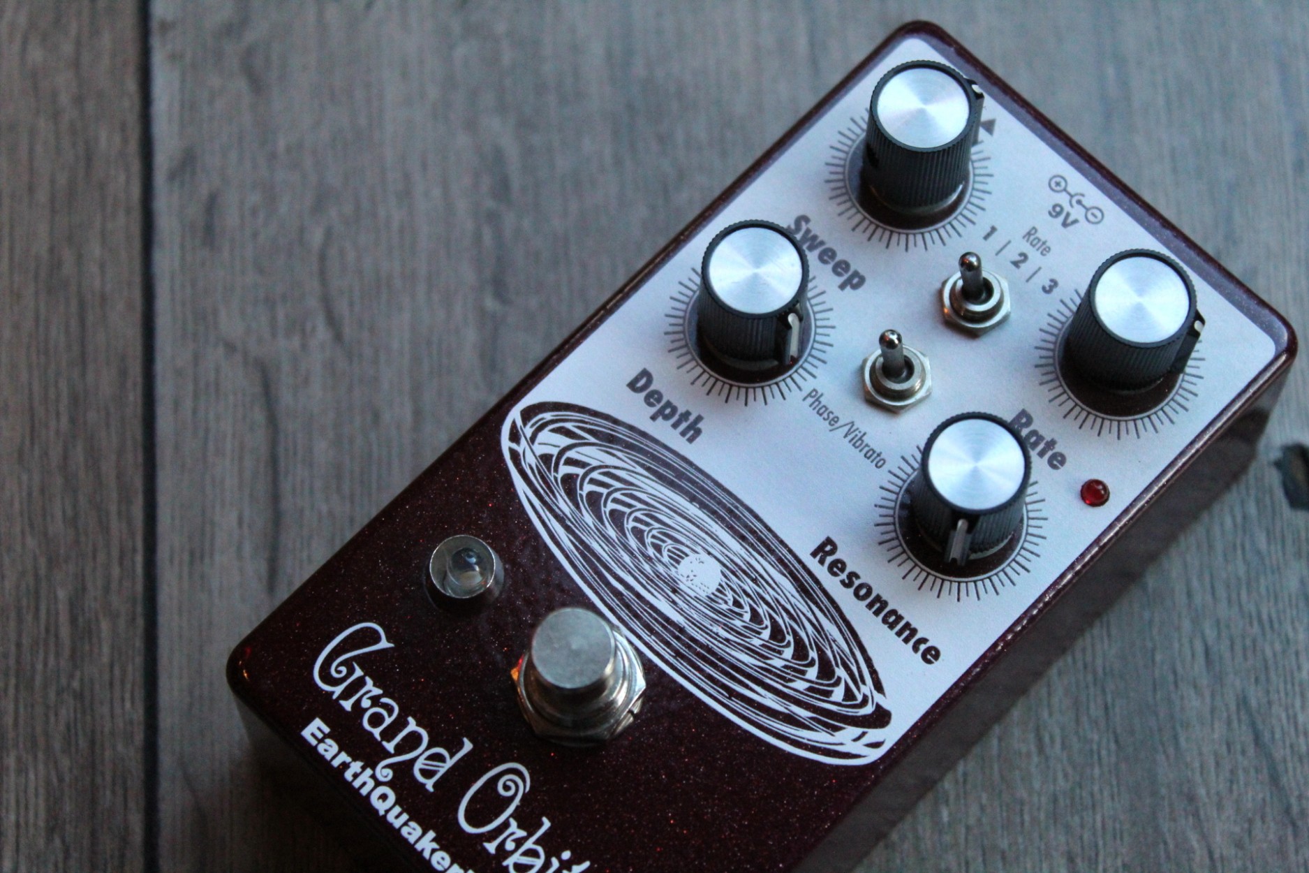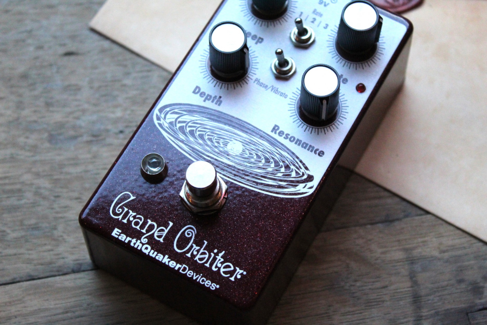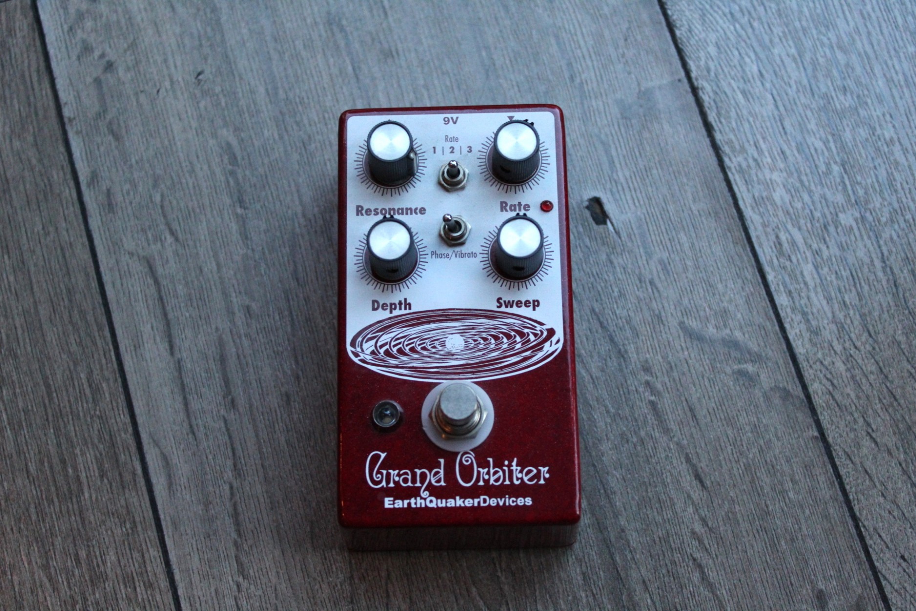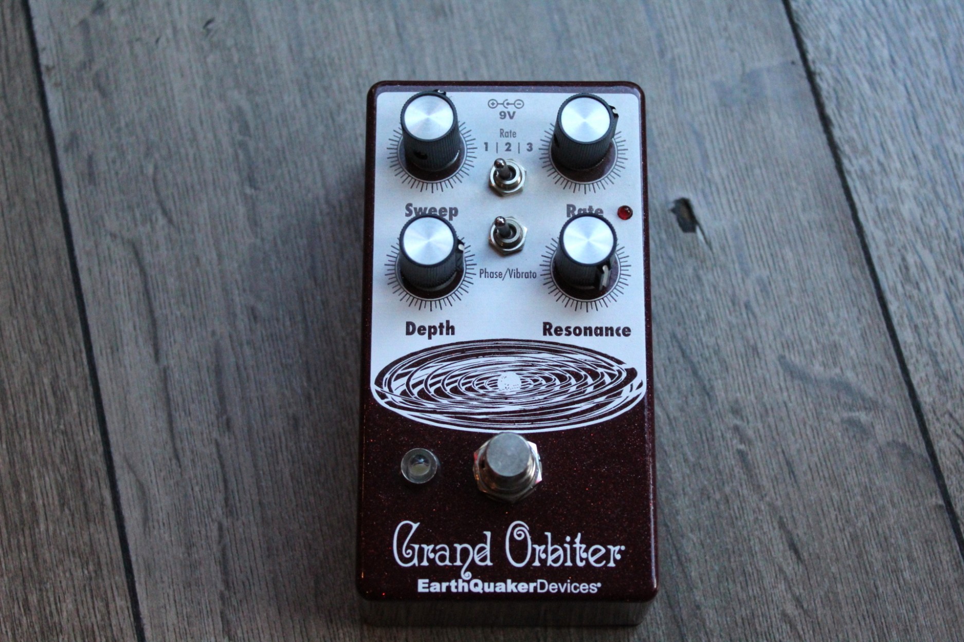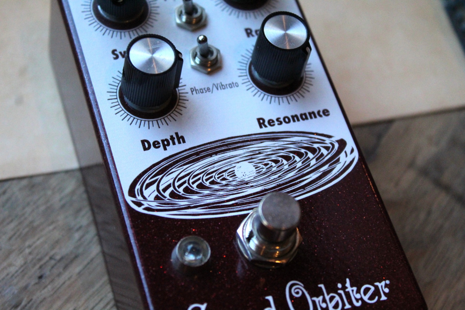resonant to slow and mellow and on through fast and swirly. It has three way toggle switch to select between the ranges of modulation: Rate 1 is slow sweep mode, Rate 2 kills the LFO and allows you to use the Grand Orbiter as a fixed resonant filter and Rate 3 is fast sweep mode. The master Rate control fine tunes the speed of the LFO in each of these modes and the flashing red LED acts as a visual indicator, even when the effect is in bypass mode. The Depth control blends the shifted signal in with the dry signal and controls the intensity of the effect. The Sweep control governs the peak frequency of the phased signal’s tone, turned full clockwise the sweep is lively and intense, whereas turning counter clockwise yields a darker, more laid back peak. The Resonance provides a wide range of control over regeneration and at higher settings adds a more pronounced and resonant tone. You can also use the Grand Orbiter as a true pitch vibrato with the “Phase/Vibrato” switch. When in “Vibrato” mode, the dry signal is removed and the Depth controls acts as a volume control. This pedal is 100% analog, true bypass and built by entirely by hand in beachy Akron, Ohio.