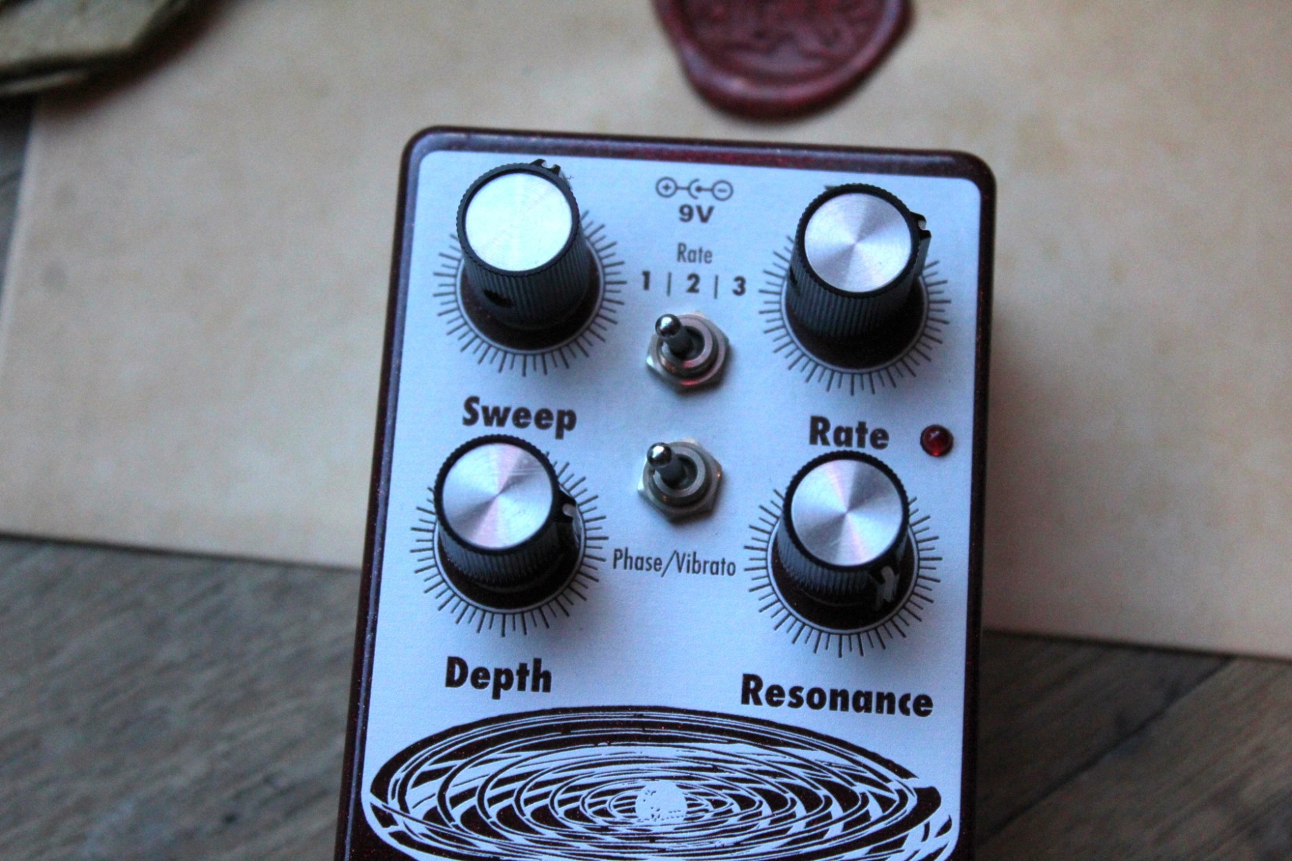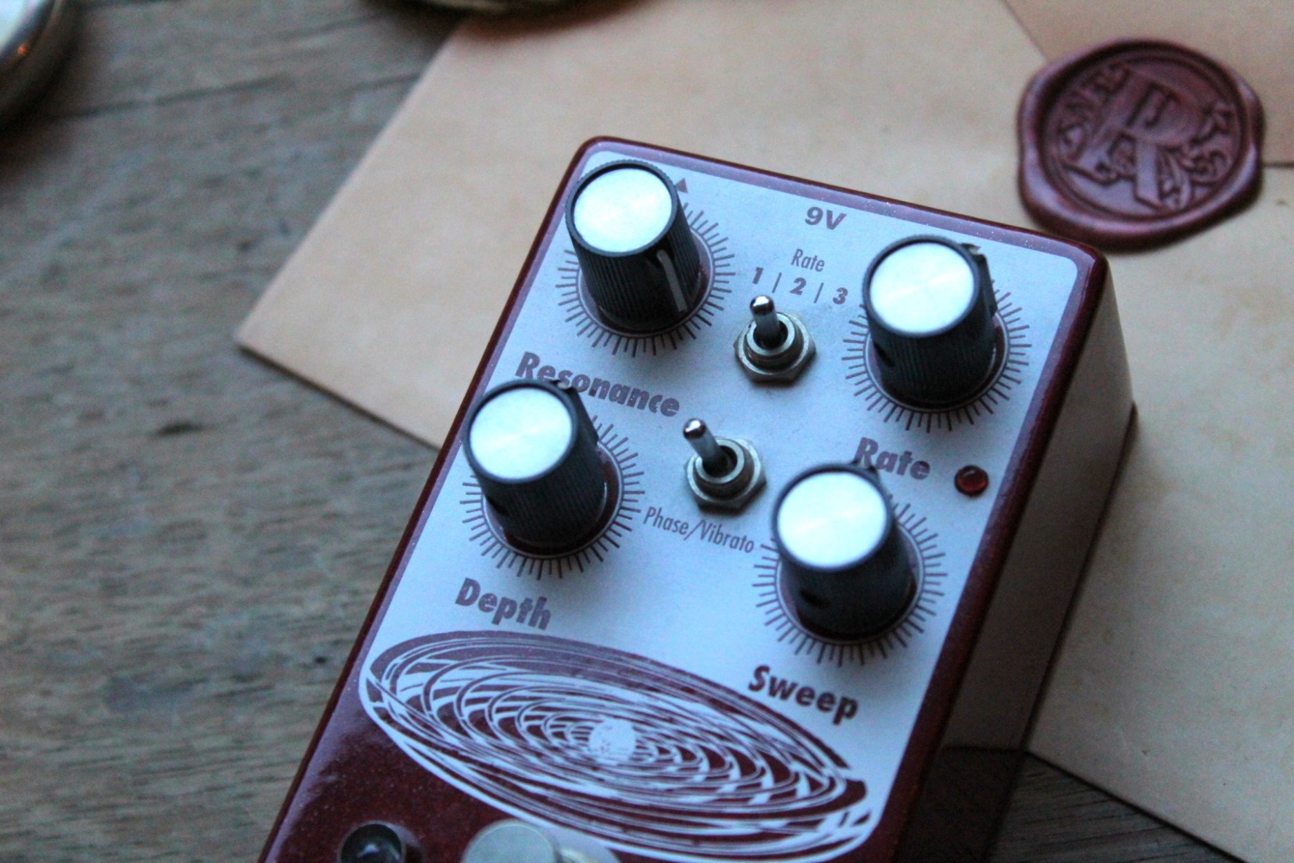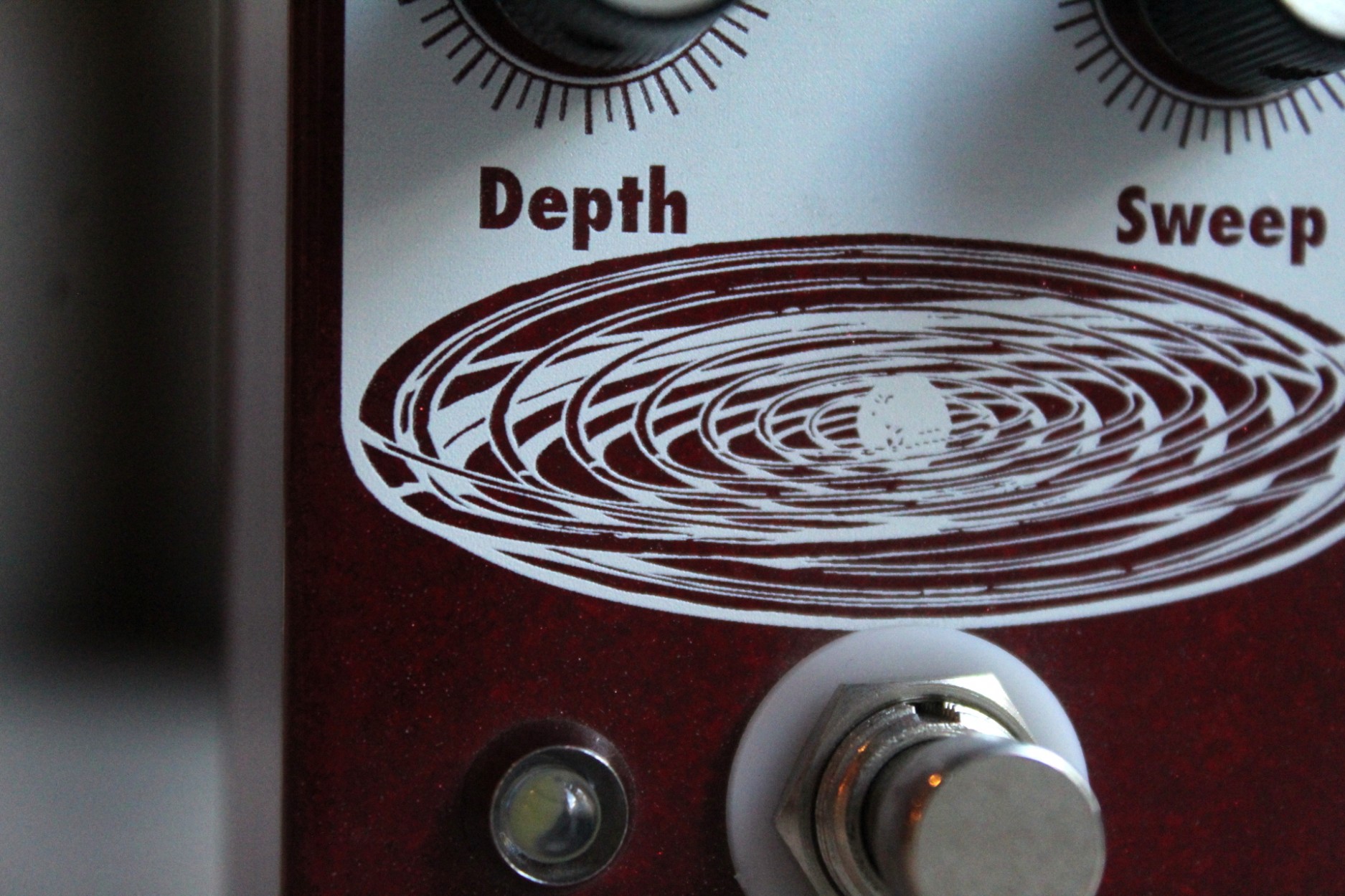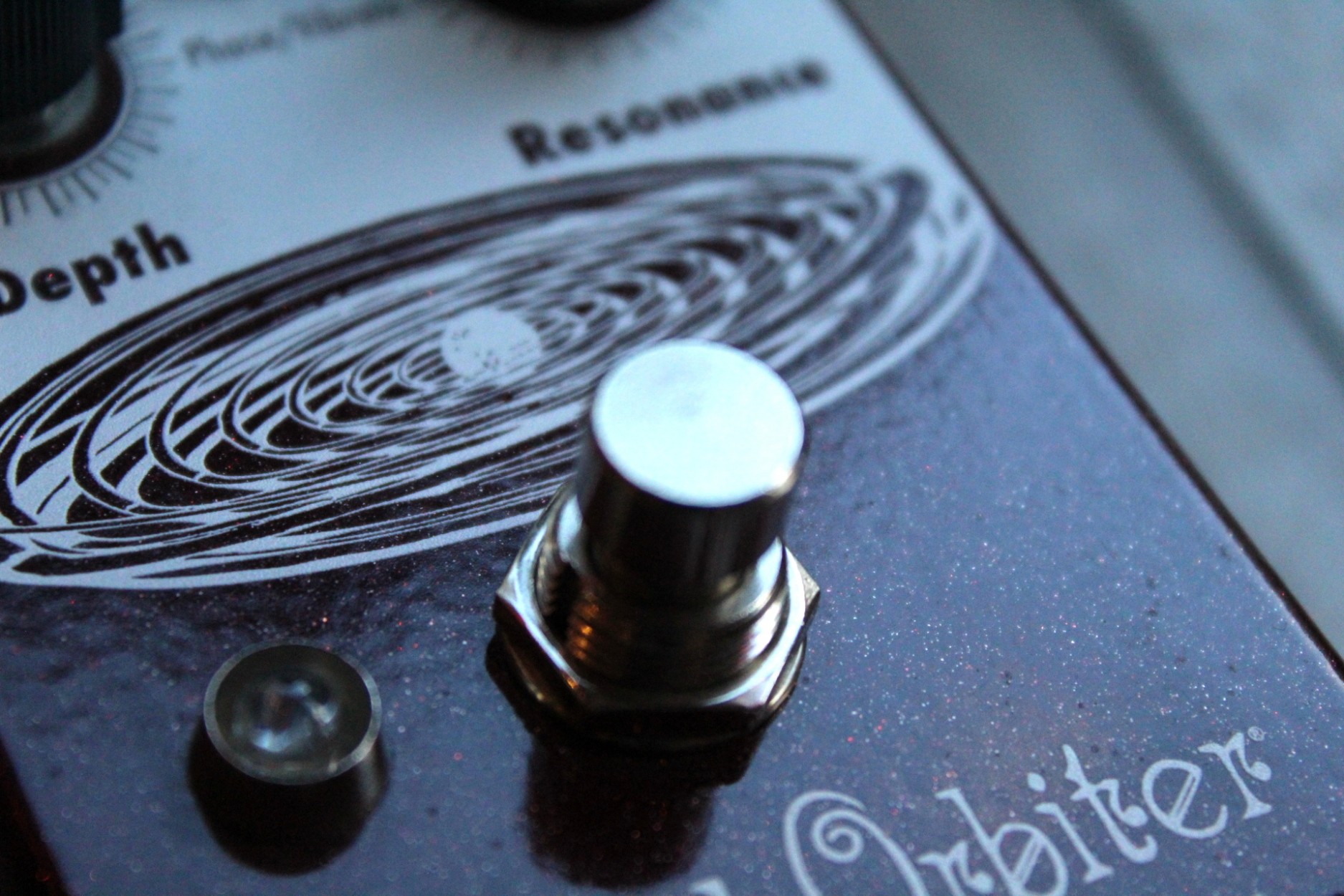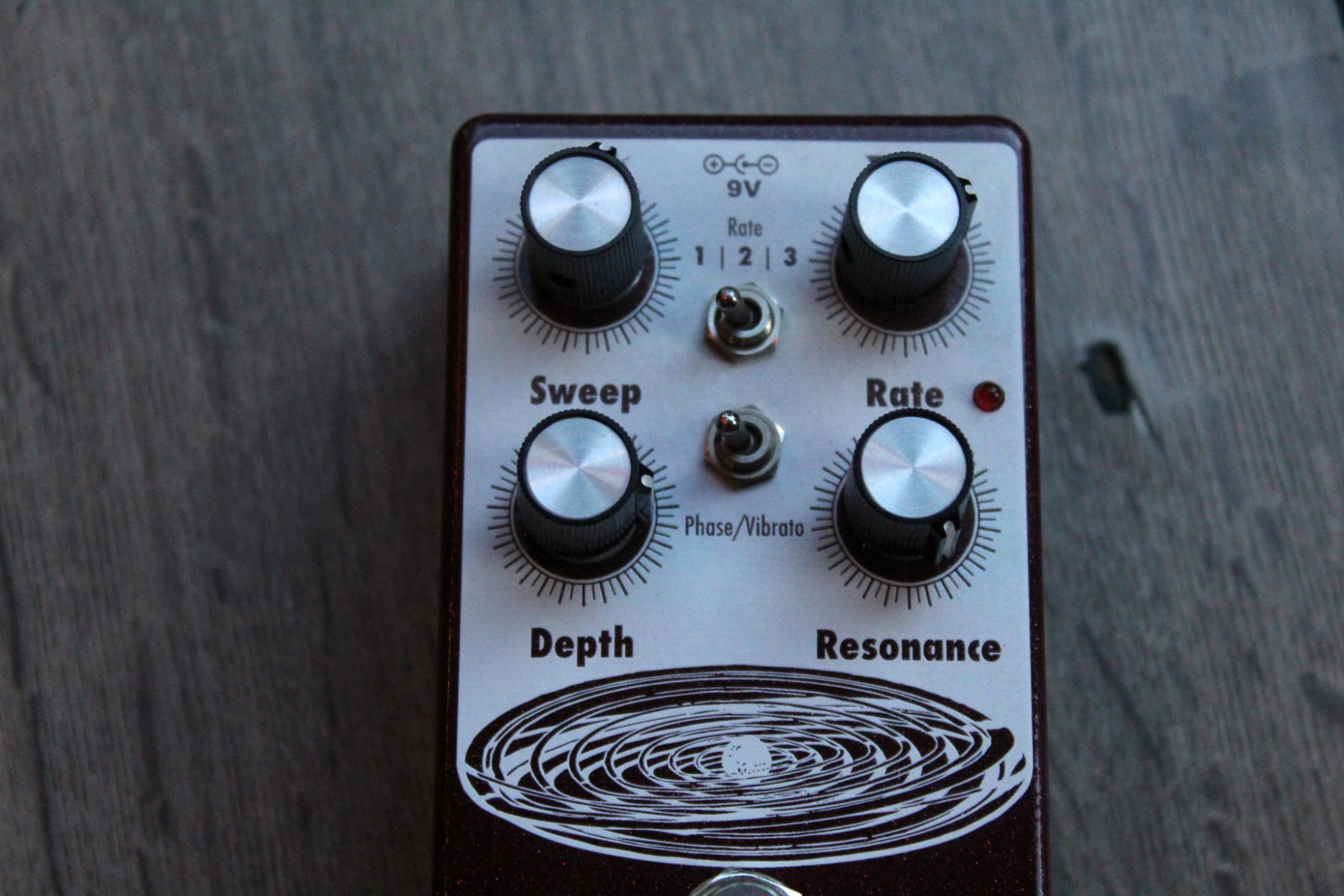 resonant to slow and mellow and on through fast and swirly. It has three way toggle switch to select between the ranges of modulation: Rate 1 is slow sweep mode, Rate 2 kills the LFO and allows you to use the Grand Orbiter as a fixed resonant filter and Rate 3 is fast sweep mode. The master Rate control fine tunes the speed of the LFO in each of these modes and the flashing red LED acts as a visual indicator, even when the effect is in bypass mode. The Depth control blends the shifted signal in with the dry signal and controls the intensity of the effect. The Sweep control governs the peak frequency of the phased signal’s tone, turned full clockwise the sweep is lively and intense, whereas turning counter clockwise yields a darker, more laid back peak. The Resonance provides a wide range of control over regeneration and at higher settings adds a more pronounced and resonant tone. You can also use the Grand Orbiter as a true pitch vibrato with the “Phase/Vibrato” switch. When in “Vibrato” mode, the dry signal is removed and the Depth controls acts as a volume control. This pedal is 100% analog, true bypass and built by entirely by hand in beachy Akron, Ohio.