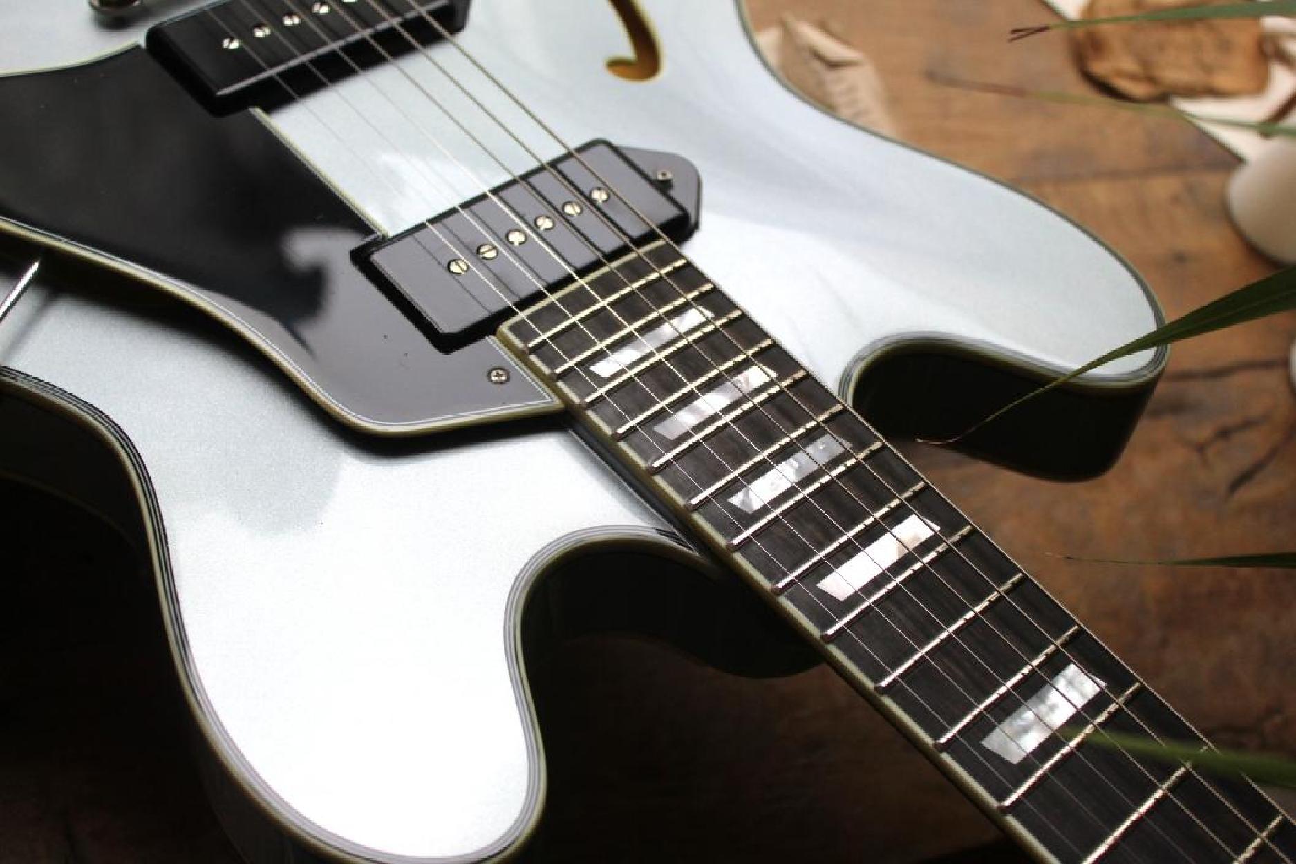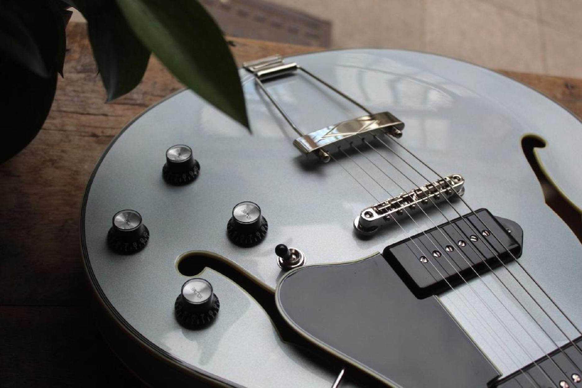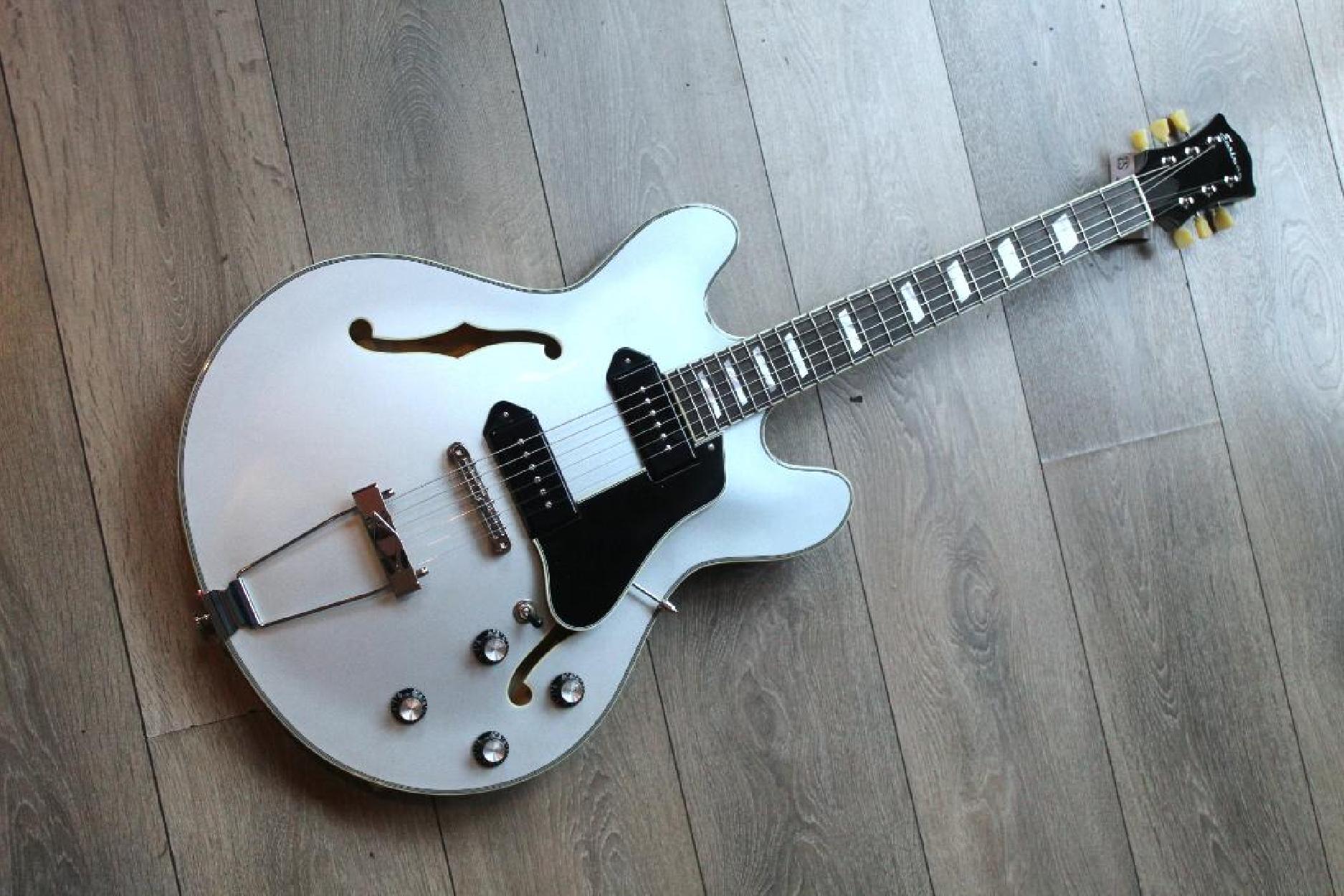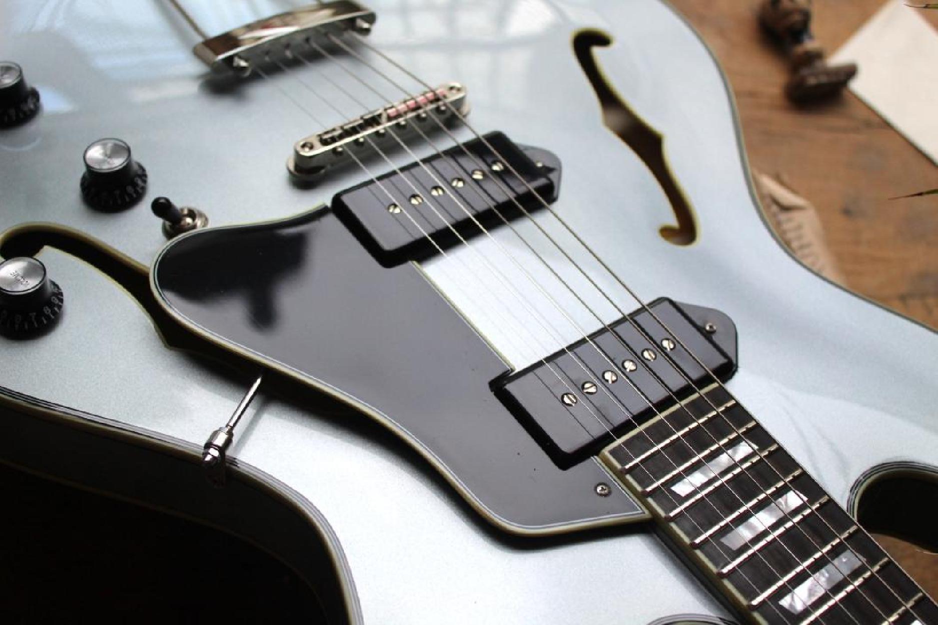 New Model Neck Material:Maple Fingerboard:Ebony Fingerboard Radius:12" Neck Profile:Traditional Even "C" Nut:Bone 1.72" Nut Height:.022" Fretwire:20 Medium Jumbo Jescar 47104-P Scale Length:24.75" Body Style:16" Hollowbody Thinline Body Dimensions:16" x 1 3/4" Body Top:Deluxe Maple Laminate Body Back/Sides:Maple Laminate Truss Rod:Dual Acting Binding:Neck & Body Binding Material:Ivoroid Logo:Pearl Headstock Inlay:Pearl Parallelogram Side Dot Color:Black Finish:Truetone Gloss Hardware Color:Nickel Pickguard:Black Plastic with Ivoroid Binding Tailpiece:Nickel Trapeze Bridge:Gotoh GE104B Tuners:Vintage Style w/ Tulip Buttons Knobs:Top Hats Neck Pickup:Toneride Dog Ear P-90 Bridge Pickup:Toneride Dog Ear P-90 Pickup Height:3/32" bass side, 3/32" treble side Pickup Frame:None 3 way Switch:Toggle Capacitors:0.022μF Potentiometers:CTS 250k Output Jack:Switchcraft L11 Strings:D’Addario NYXL .011 - .049 Action Height:3/32" bass side 12th fret, 2/32" treble side 12th fret Case:Eastman Padded Gigbag Color:IcedBlueMetallic