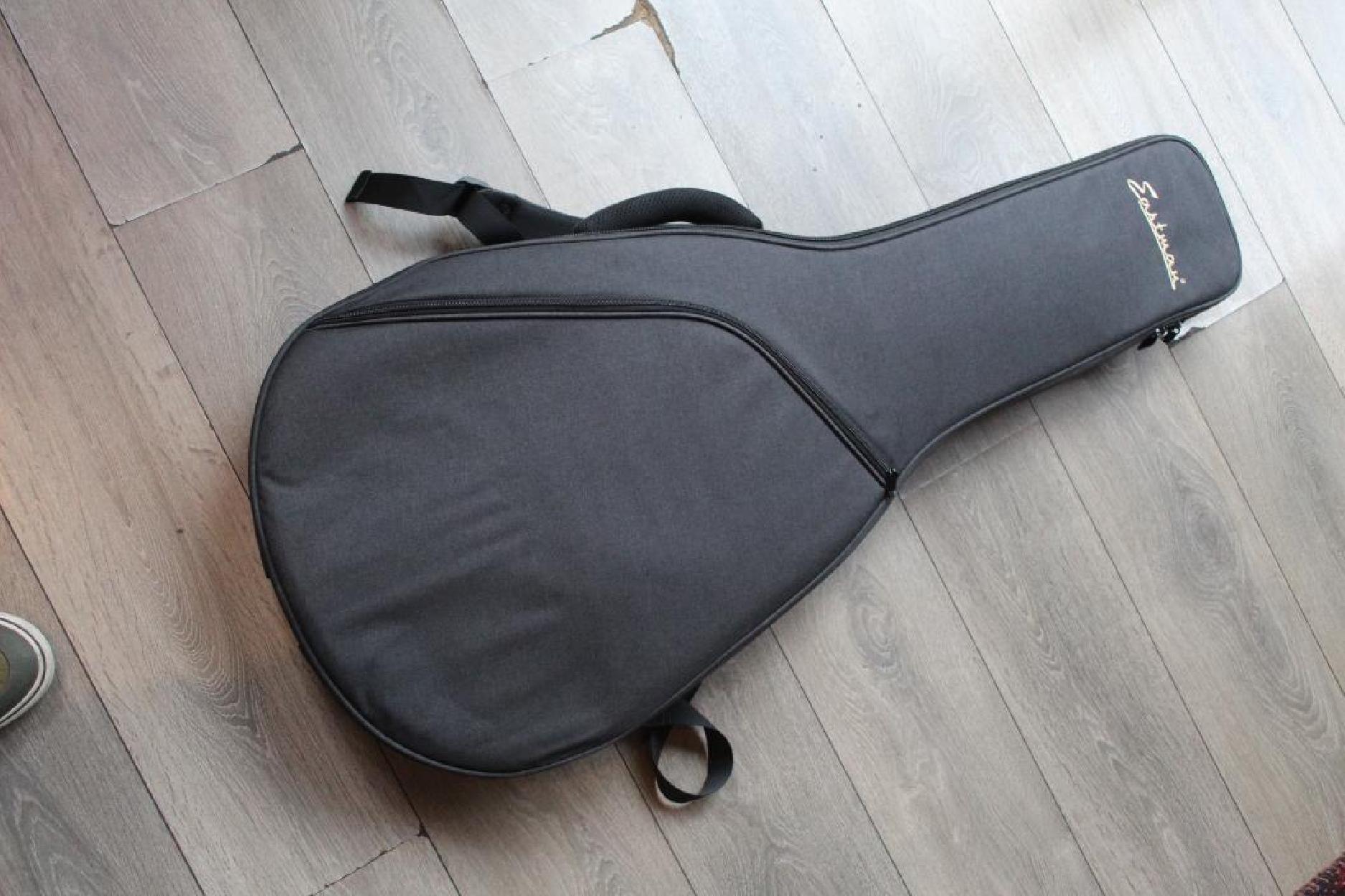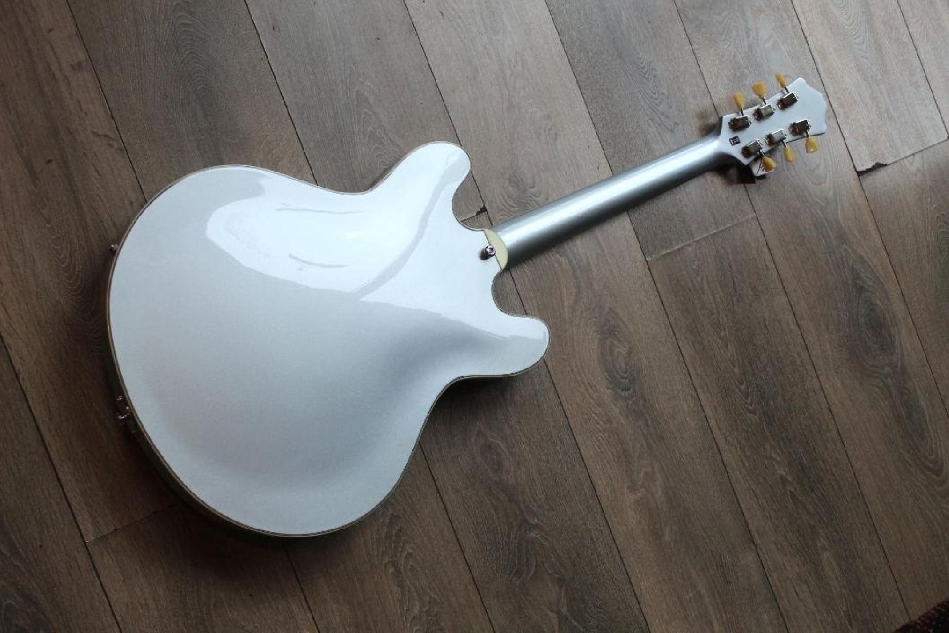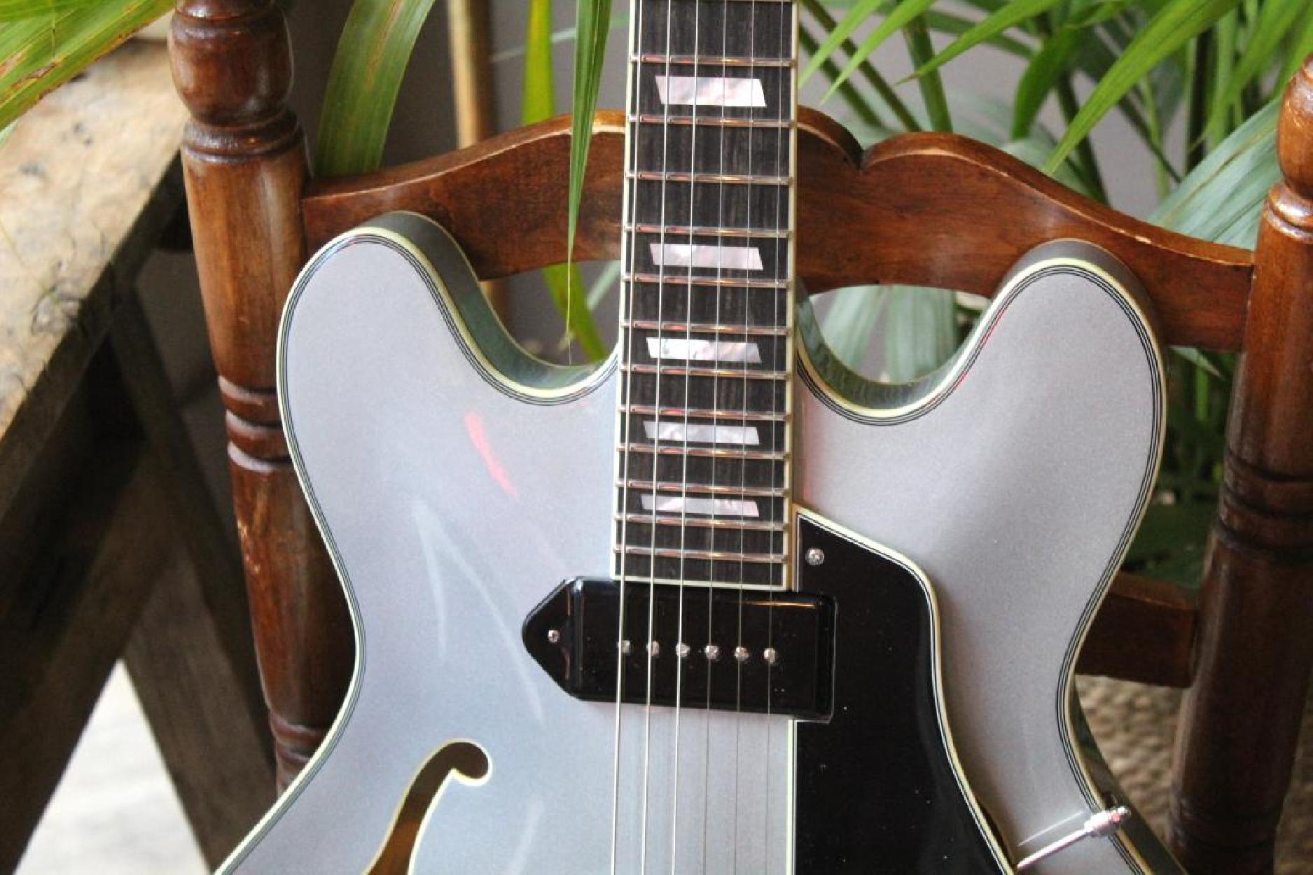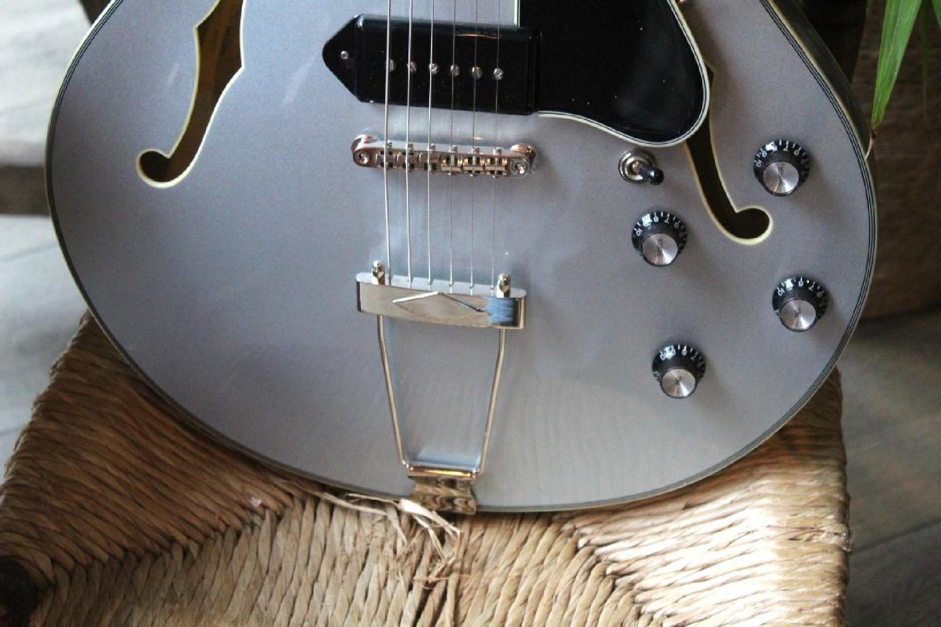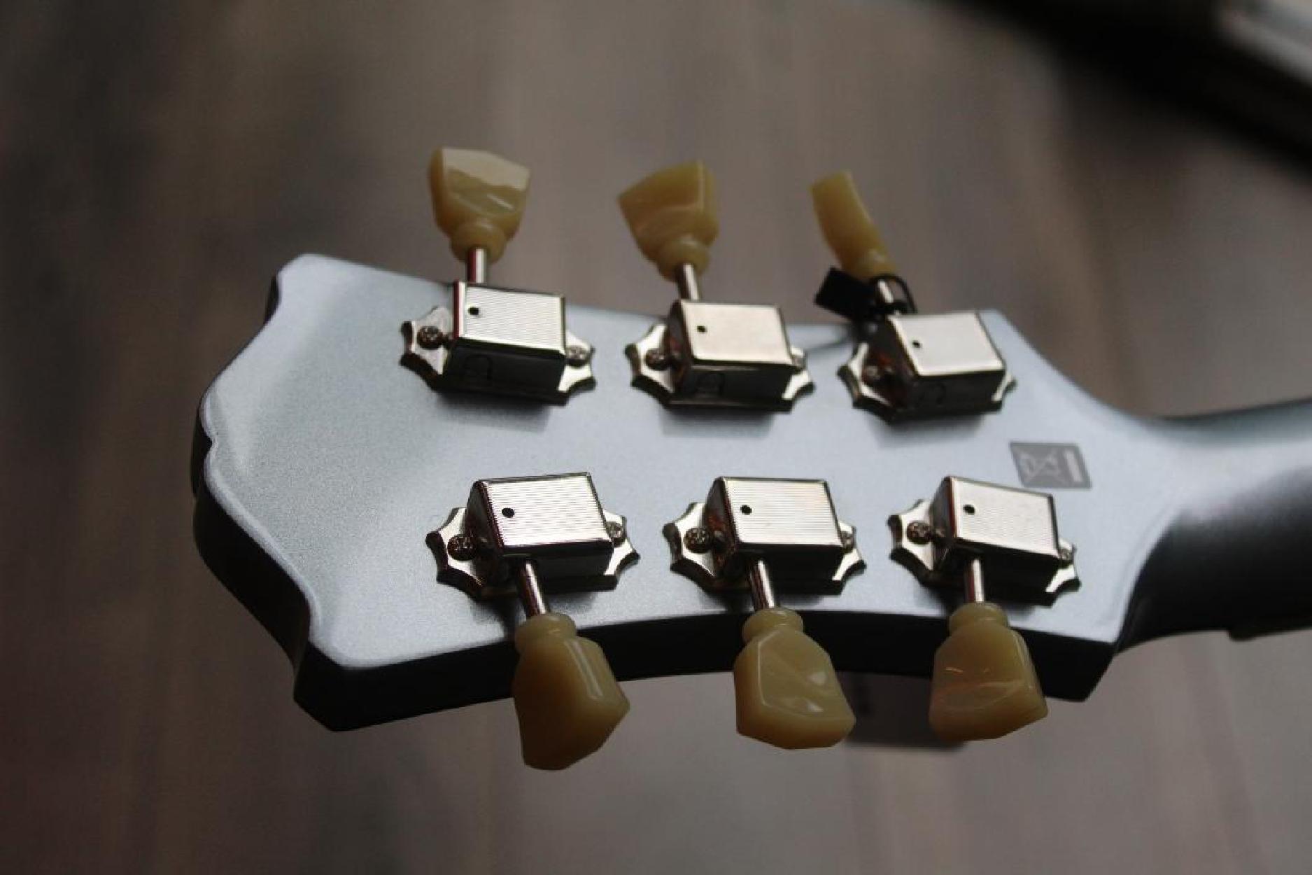 New Model Neck Material:Maple Fingerboard:Ebony Fingerboard Radius:12" Neck Profile:Traditional Even "C" Nut:Bone 1.72" Nut Height:.022" Fretwire:20 Medium Jumbo Jescar 47104-P Scale Length:24.75" Body Style:16" Hollowbody Thinline Body Dimensions:16" x 1 3/4" Body Top:Deluxe Maple Laminate Body Back/Sides:Maple Laminate Truss Rod:Dual Acting Binding:Neck & Body Binding Material:Ivoroid Logo:Pearl Headstock Inlay:Pearl Parallelogram Side Dot Color:Black Finish:Truetone Gloss Hardware Color:Nickel Pickguard:Black Plastic with Ivoroid Binding Tailpiece:Nickel Trapeze Bridge:Gotoh GE104B Tuners:Vintage Style w/ Tulip Buttons Knobs:Top Hats Neck Pickup:Toneride Dog Ear P-90 Bridge Pickup:Toneride Dog Ear P-90 Pickup Height:3/32" bass side, 3/32" treble side Pickup Frame:None 3 way Switch:Toggle Capacitors:0.022μF Potentiometers:CTS 250k Output Jack:Switchcraft L11 Strings:D’Addario NYXL .011 - .049 Action Height:3/32" bass side 12th fret, 2/32" treble side 12th fret Case:Eastman Padded Gigbag Color:IcedBlueMetallic