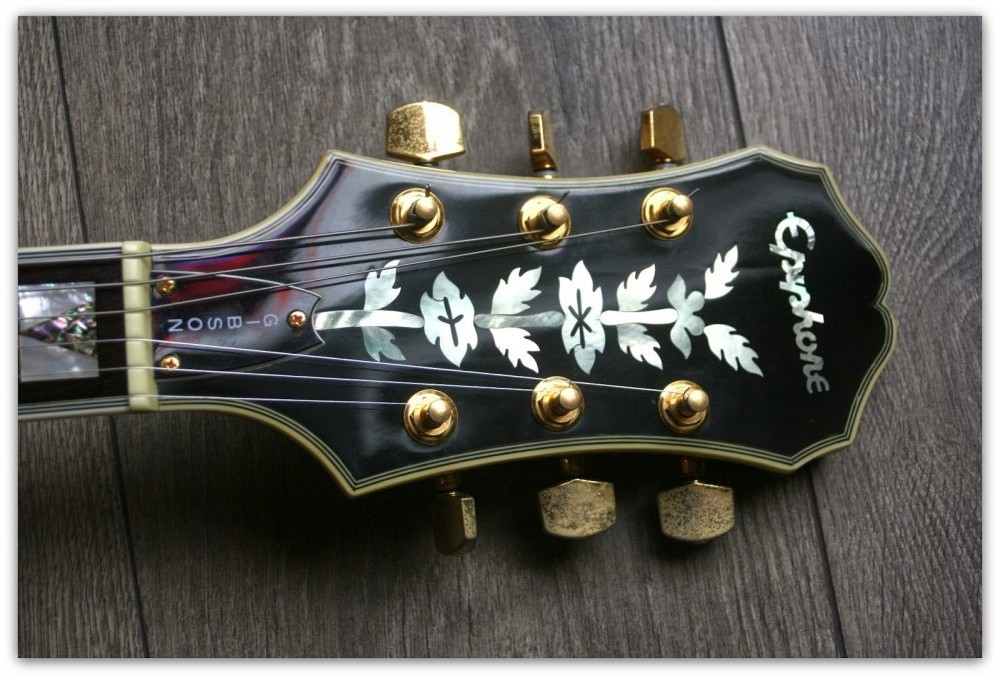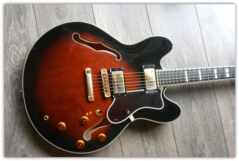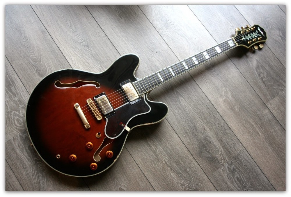 The Epiphone Sheraton II was later introduced and featured only one major difference. The Frequensator tail piece was now replaced by a fixed stop bar. The Sheraton II became much more popular than the original[citation needed]. Epiphone's high end guitars, the elitist line, includes a Sheraton. Unlike the "regular" line Sheraton with its full-size Gibson-style humbuckers, it features the New York mini humbuckers of the original Sheraton (later used on several Gibsons, but originally an Epiphone-specific transducer). Currently original Sheratons are rare[citation needed], but Sheraton II's are still in production and are readily available. The most recently manufactured Sheratons were John Lee Hooker signature models.[1] Recently the vintage sunburst finish that many Sheratons are made in has changed colour from a black on deep red colour (shown right) to a black on orange-yellow colour.[1]