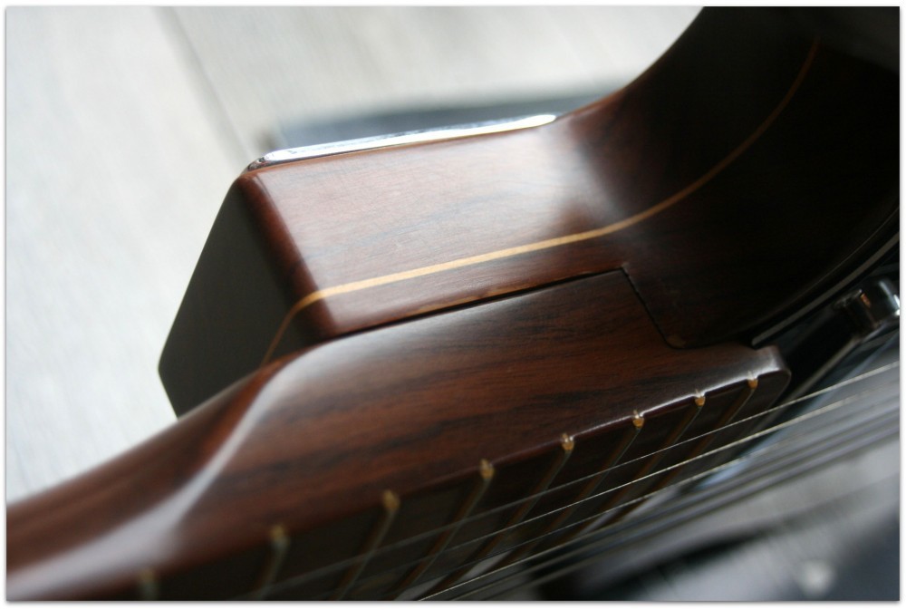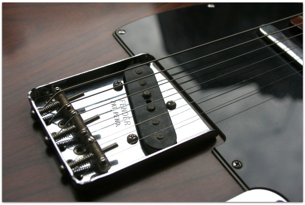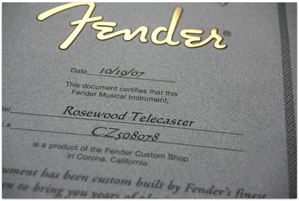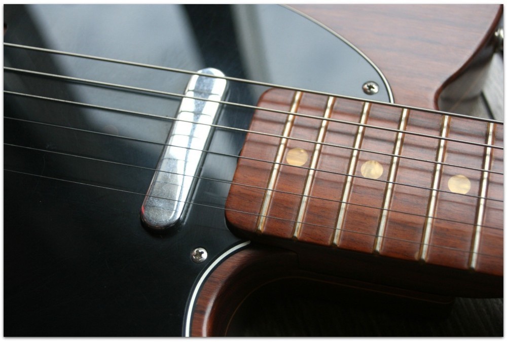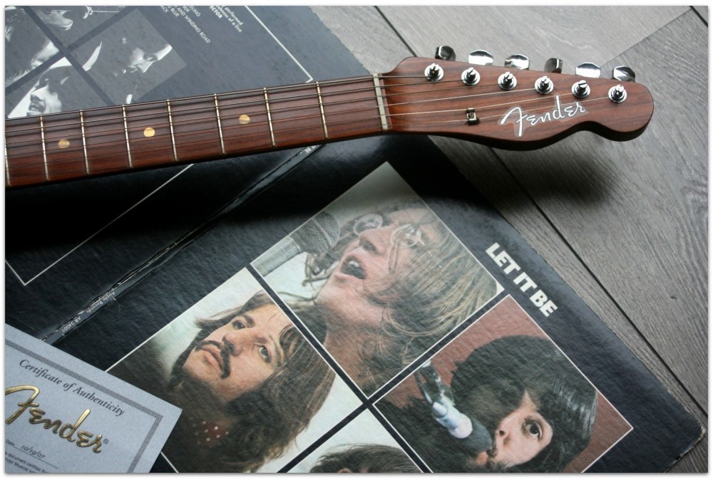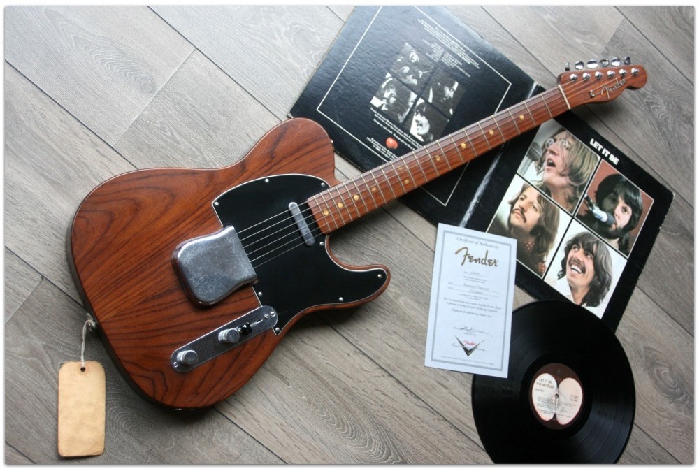 The first Rosewood Telecaster was Fender’s gift to Harrison to be used in the movie Let It Be. Rossmeisl and Philip Kubicki made two prototypes and chose the best one for Harrison. The guitar’s body was made with a thin layer of maple wood sandwiched between a solid rosewood back and top. “I spent hours sanding the bodies to perfection,” recalls Kubicki. The rosewood neck was built with a separate rosewood fingerboard glued to it. The whole guitar had a special satin polyurethane finish. Historians say that Harrison’s guitar was flown to England (in its own seat) accompanied by a courier, and hand-delivered to the Apple offices in December 1968.