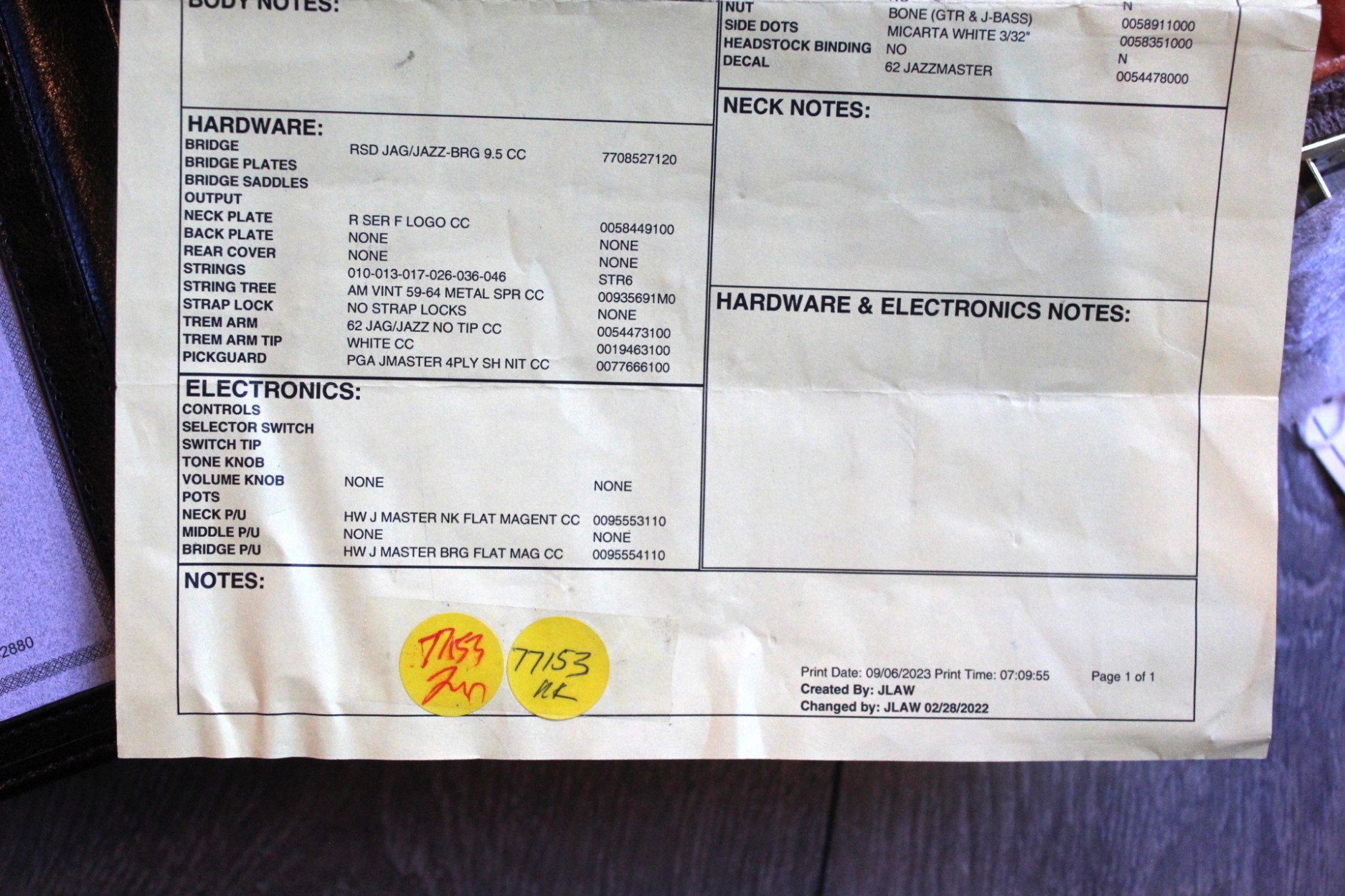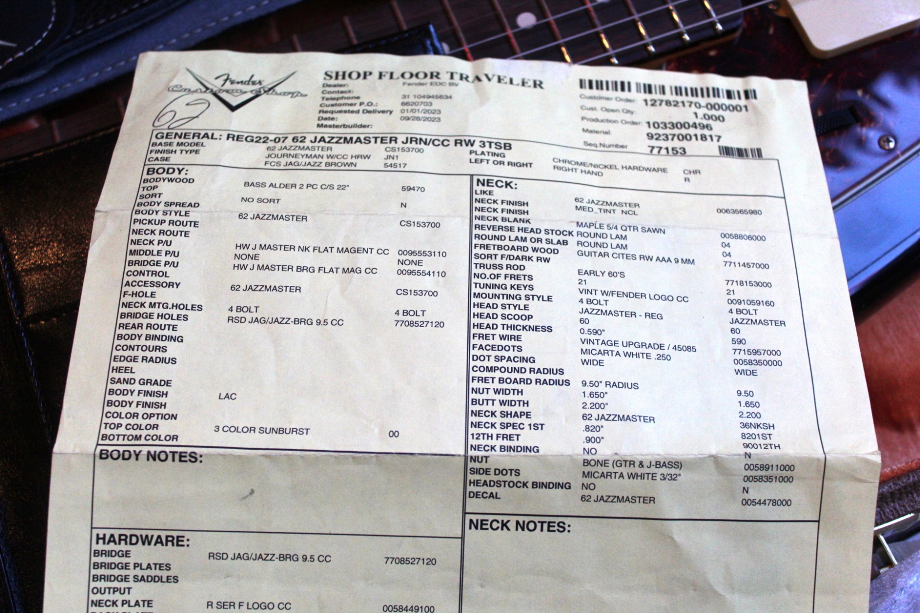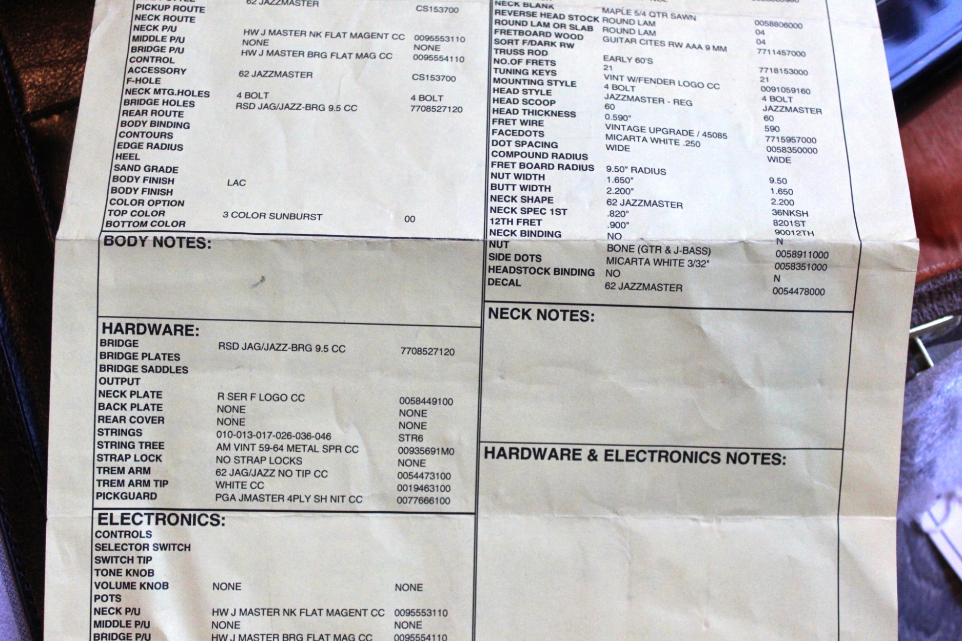 See Shop Floor Paper Photos for full specifications, thanks The Jazzmaster®—the first Fender® guitar with a rosewood fingerboard—was designed for the jazz market, but while jazz guitarists never adopted it, it was soon a hit with surf guitarists. The Custom Shop ’62 Jazzmaster Journeyman Relic is a cool nod to the offset original and all the surf, rock, punk, postpunk and alt/indie music it has contributed to on stages far and wide. It wears a perfectly worn Journeyman Relic® lacquer finish on its two-piece select alder body, and the rift-sawn maple neck features a ’62 “Jazzmaster C” profile, 9.5”-radius round-lam rosewood fingerboard and 21 medium vintage (47095) frets. The Custom Shop hand-wound Jazzmaster pickups are wound to vintage spec and produce a distinct mellow tone. Vintage wiring includes a three-way toggle switch and two separate volume/tone controls with a lead/rhythm switch. Other features include a four-ply brown shell pickguard, RSD J-Bridge with compensated brass saddles, vintage-style tuning machines and a bone nut. Also includes deluxe hardshell case, strap and certificate of authenticity.