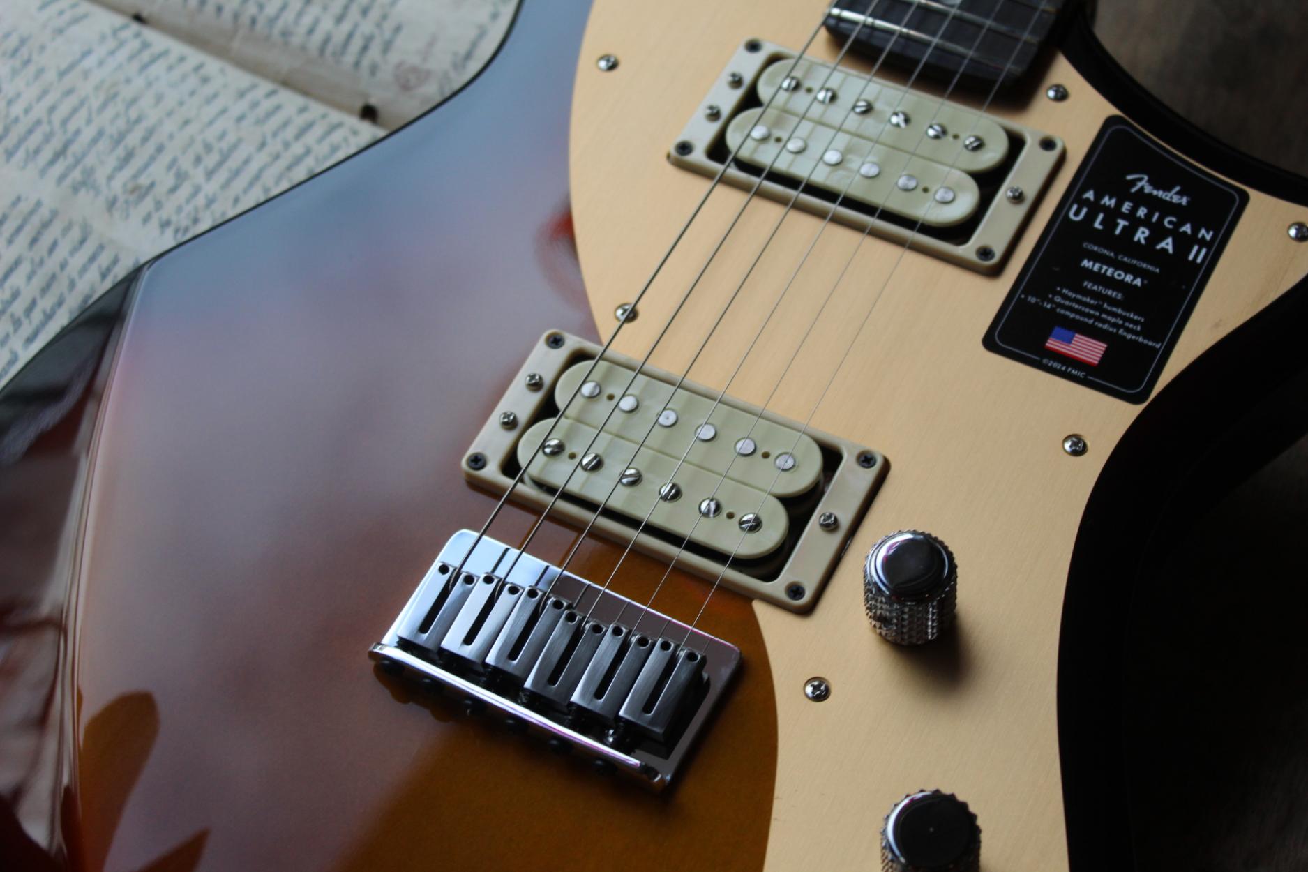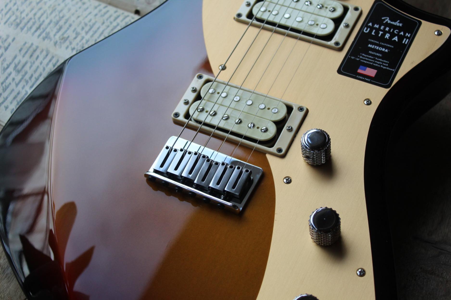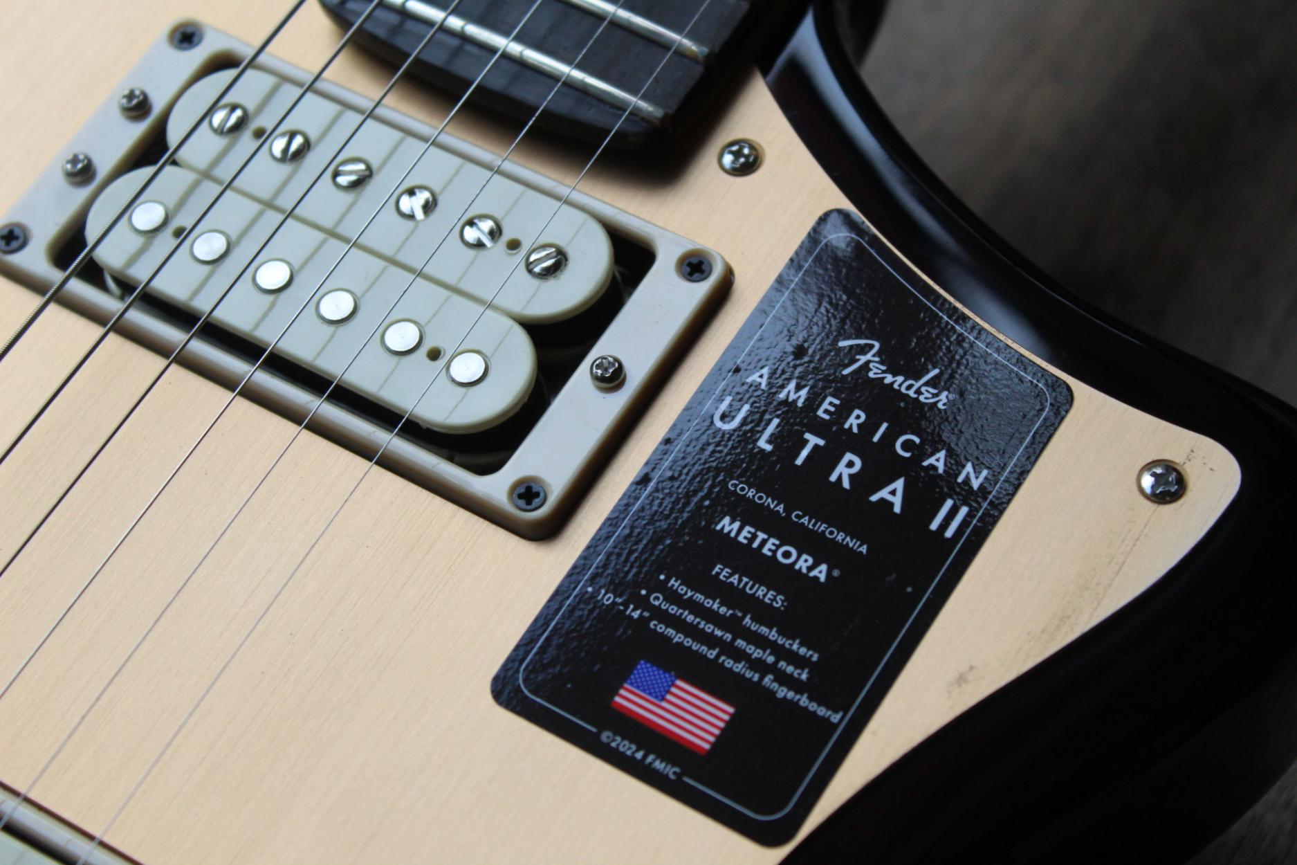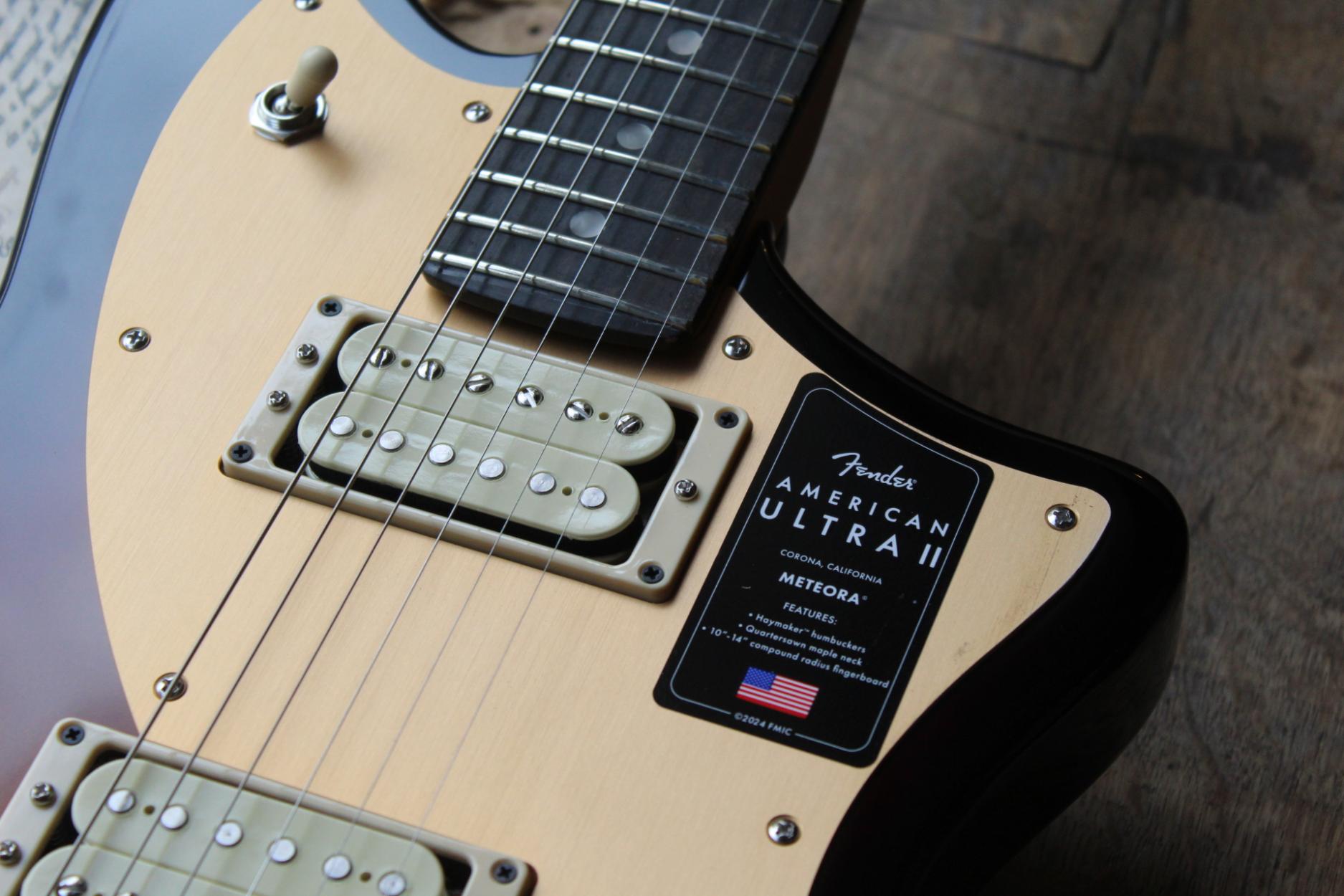 Built for players boldly seeking the best, American Ultra II is our most advanced series of instruments. American Ultra II guitars and basses feature premium materials, precision craftsmanship and cutting-edge design for instruments that both advance the state-of-the-art and stand the test of time. The Fender® American Ultra II Meteora® features a select alder body with sculpted body contours. For effortless playability, the quartersawn maple neck features our Modern D profile and smooth Ultra Satin finish. Ebony or quartersawn maple 10”-14” compound radius fingerboards feature Ultra rolled edges, medium-jumbo frets, Luminlay® side dots and Graph Tech® TUSQ® nuts. The tapered neck heel and sculpted body contours allow unparalleled access to the higher register. Under the hood, a pair of Haymaker™ humbuckers deliver everything from sweet cleans to modern crunch and searing leads, all without a hint of hum. Our patented S-1™ switch cleverly splits the Haymakers for even more tonal variety, and you can further sculpt your tone with both conventional master tone control plus a carefully voiced bass cut knob. Additional road-ready features include 6-saddle string-through-body hardtail with polished stainless steel block saddles, deluxe locking tuners, knurled aluminum knobs and 1-ply anodized aluminum pickguard. The American Ultra II Meteora infuses iconic style with advanced appointments to take your playing to stratospheric new heights. For players who demand flawless tone, infinite versatility and limitless performance, American Ultra II delivers. Features Select Alder Body with Ultra Contours and Sculpted Neck Heel Quartersawn Maple Modern “D” Profile Neck 10"-14" Compound Radius Ebony or Quartersawn Maple Fingerboard with Ultra Rolled Edges and Luminlay Side Dots Haymaker™ Humbuckers, Advanced Electronics and S-1™ Switching 6-Saddle String-Through-Body Hardtail Bridge with Polished Stainless Steel Block Saddles Short Post Locking Tuners Model #: 0119181712