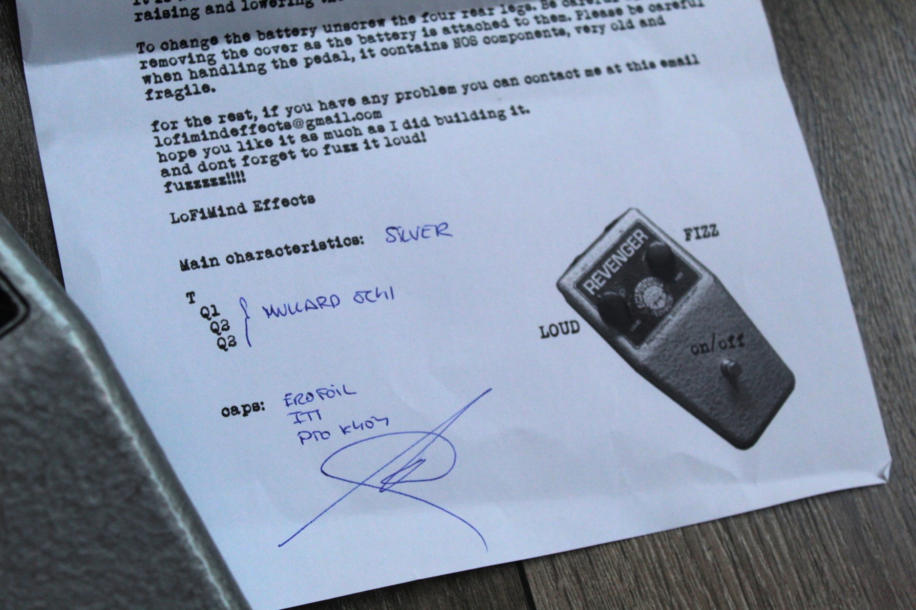 WHO ARE YOU GOING TO TAKE REVENGE ON? The Revenger is a unique take from my vision of the Tone Bender MKII made by Solasound in the 60s. Based on it, it sounds complety different, more gain and gnarly sound, articulate and nice clean up!Perfect for vintage lovers, and it make the taste of modern players who want more gain in their vintage units. All the Revengers are built with vintage Specs, like 60s Mullard metal can transistors, vintage capacitors and vintage resistors, all mounted point to point in a vintage baquelita board