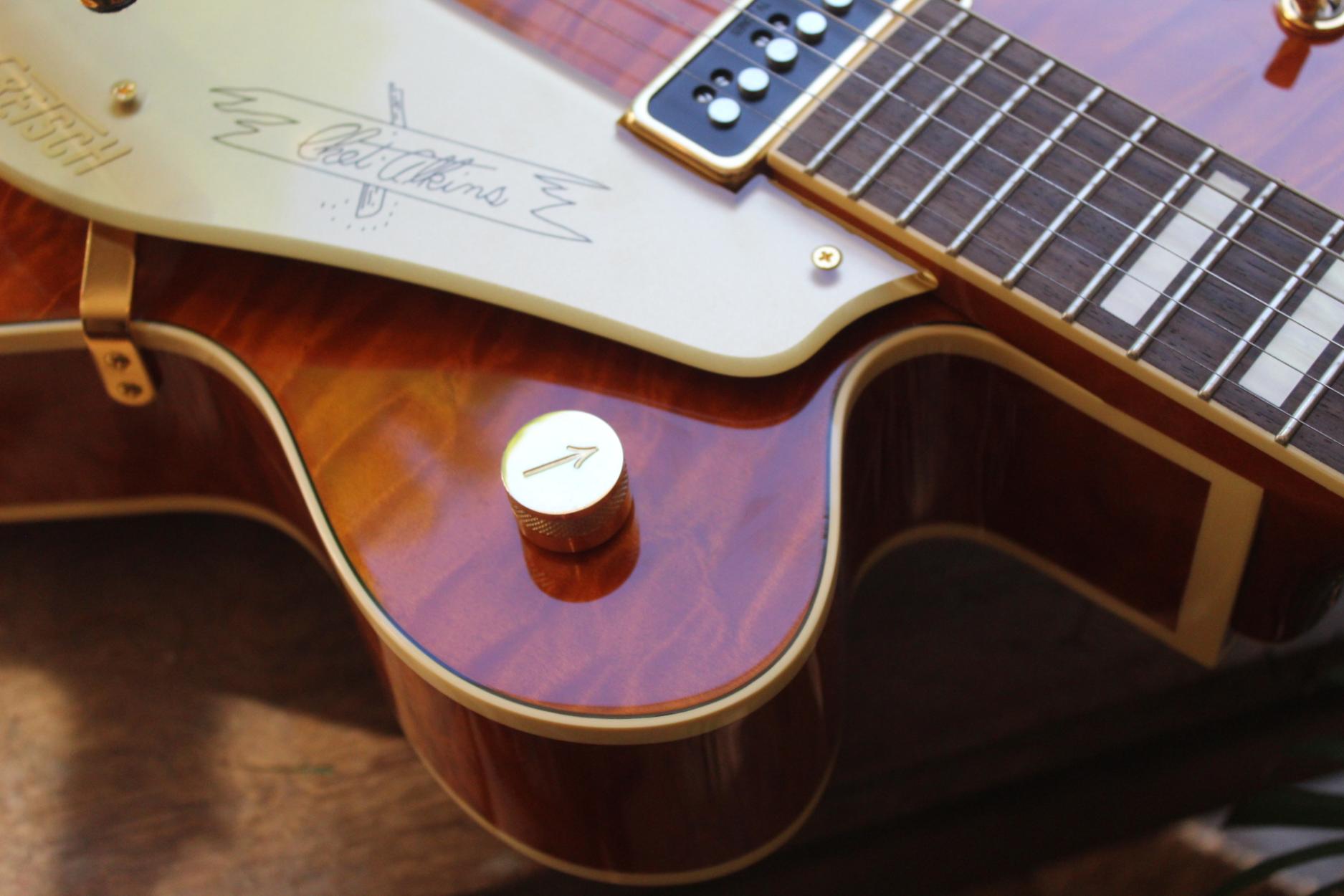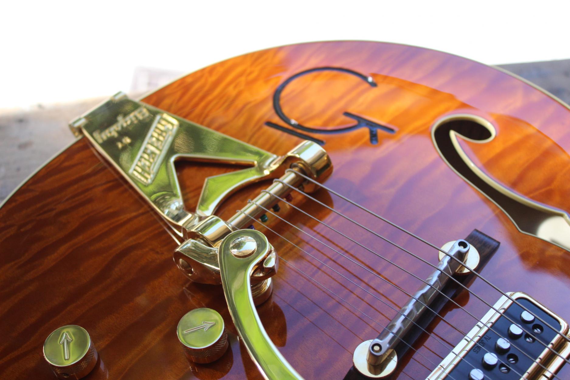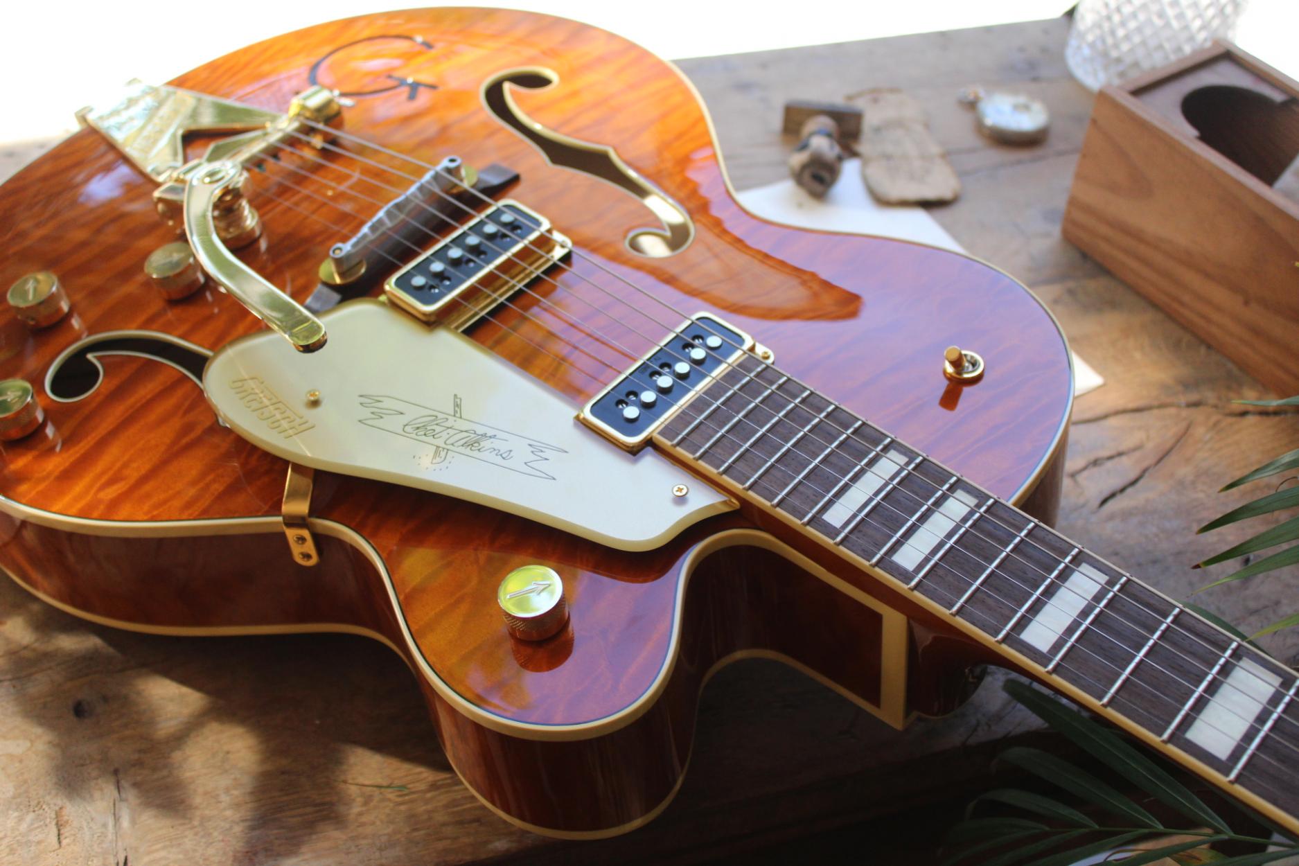 Gretsch Quilt Classics are stylish renditions of classic vintage models, reborn with stunning highly figured quilt maple. Co-designed with the guitarist’s guitarist, Chet Atkins, the venerable 6120 is one of the most widely heard Gretsch instruments. The G6120TGQM-56 Limited Edition Quilt Classic Hollow Body stays true to the early design with classic aesthetics that are further elevated by the use of highly figured quilt maple. A veritable tonal multi-tool, this hollow body has an easy-playing, comfortable feel and rings out proudly with That Great Gretsch Sound! FEATURES: Stunning quilt maple body with black G-brand Standard “U” shaped maple neck with 12”-radius rosewood fingerboard, 22 medium jumbo frets, and pearloid wide-block inlays Nitrocellulose lacquer finish Polished aluminum nut Grover® Sta-Tite tuners TV Jones® T-Armond pickups Compensated aluminum bridge with pinned rosewood base Bigsby® B6CBDE vibrato tailpiece Gold hardware General: Brand Name: Gretsch Case Type: Hardshell Case Hardware Color: Gold Product Color: Roundup Orange Stain Lacquer Series: Gretsch Limited Edition Body: Body Finish: Gloss Nitrocellulose Lacquer Body Material: Laminated Quilt Maple Body Shape: Chet Atkins Hollow Body Top Material: Laminated Quilt Maple Neck: Fingerboard Inlay: Aged Pearloid Wide Blocks Fingerboard Material: Rosewood Headstock Veneer: Quilt Maple Neck Finish: Gloss Nitrocellulose Lacquer Neck Joint: Set Neck Neck Material: Maple Neck Shape: Standard "U" Number of Frets: 22 Frets Nut Material: Polished Aluminum Nut Width: 1.6875" (42.86mm) Electronics: Bridge Pickup: TV Jones T-Armond pickup Controls and Switching: 3-Position Toggle: Position 1. Bridge Pickup, Position 2. Bridge and Neck Pickups, Position 3. Neck Pickup; Volume 1. (Neck Pickup), Volume 2. (Bridge Pickup), Master Volume, Master Tone Neck Pickup: TV Jones T-Armond pickup Pickup Configuration: SS Hardware: Bridge: Compensated aluminum bridge with pinned rosewood base Fret Wire: Medium Jumbo Knobs: Arrow Pickguard: Gold Plexi with Gold Gretsch Logo Saddle Material: Polished Aluminum Switch Cap: Gold Tailpiece: Bigsby B6CBDE vibrato tailpiece Tuning Machines: Grover Sta-Tite tuner