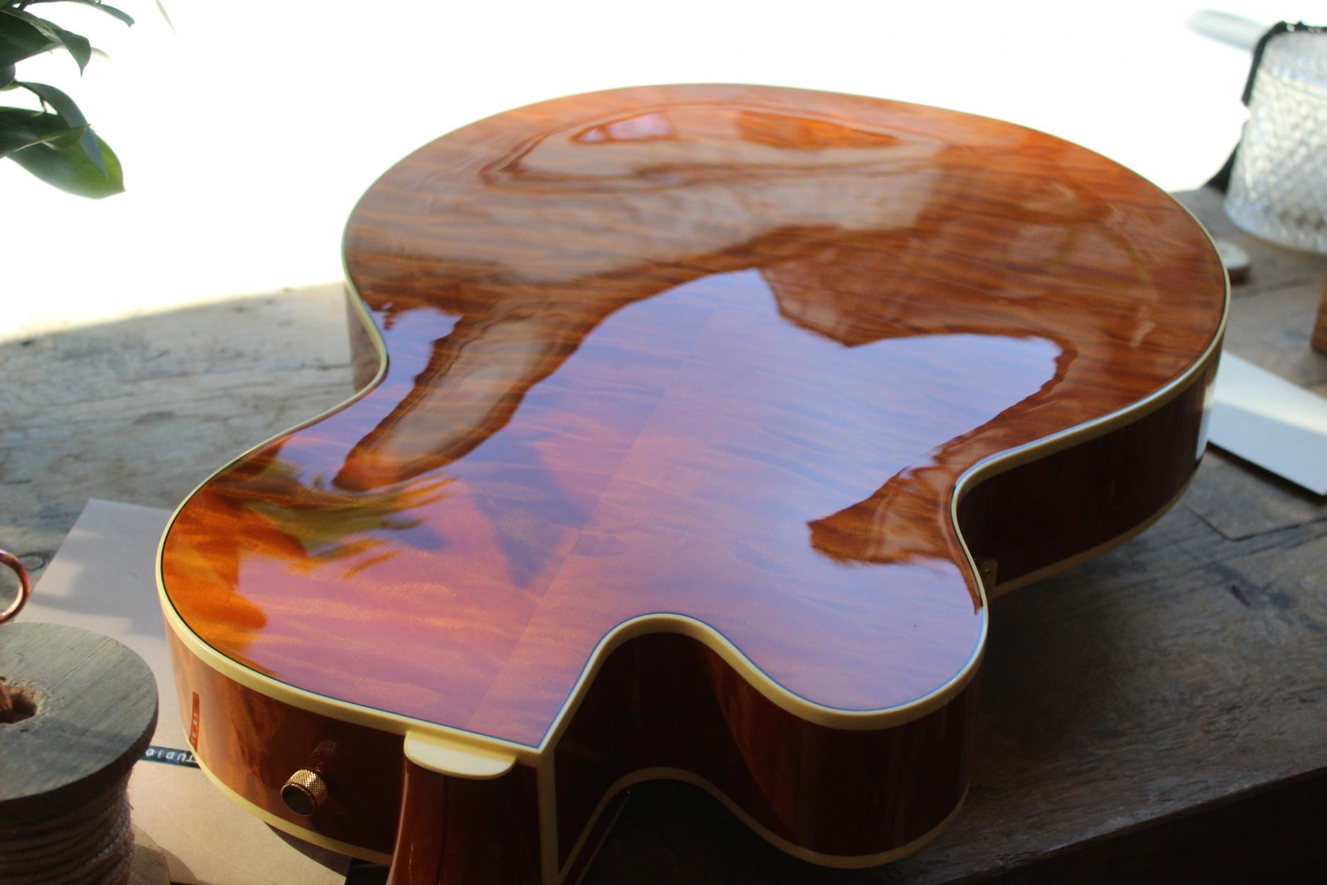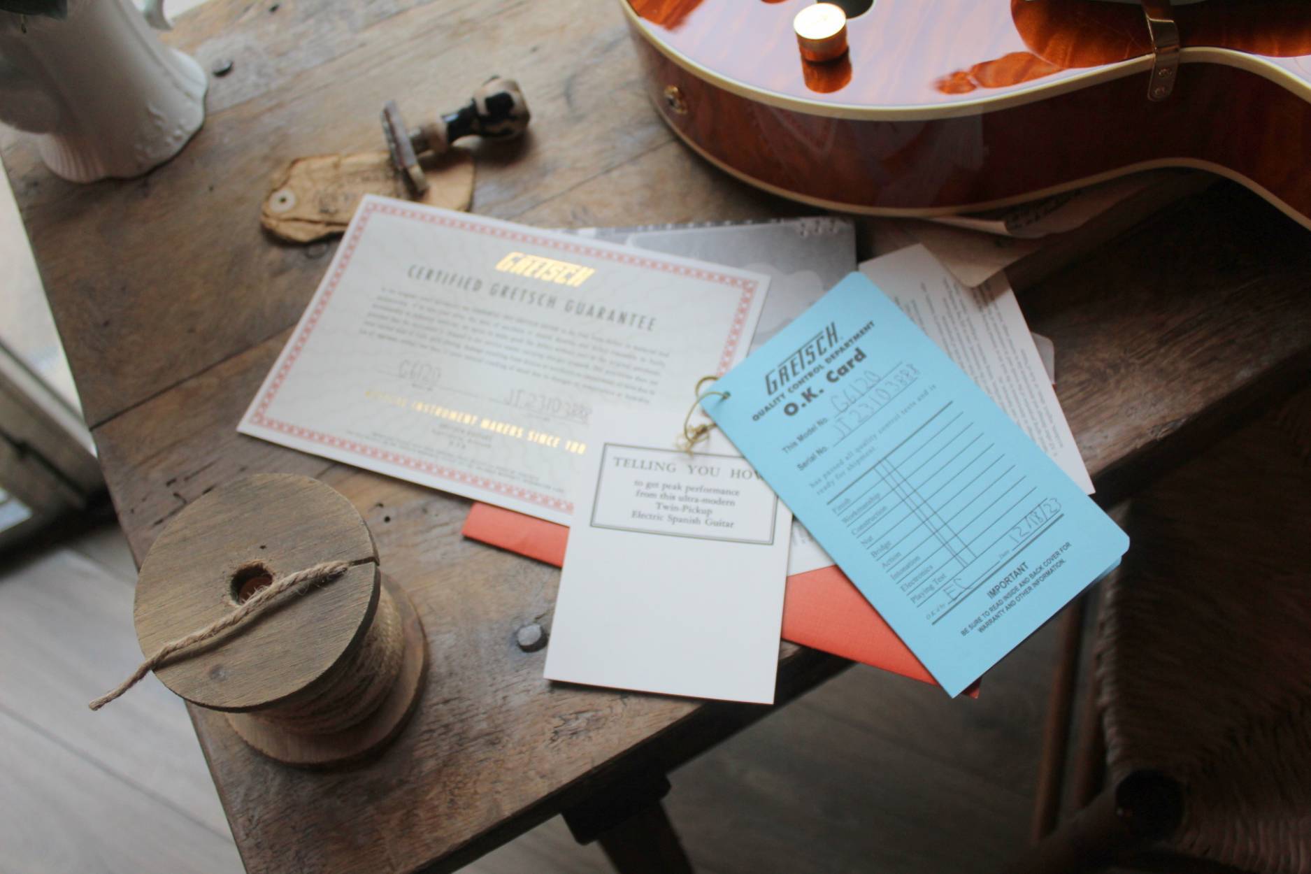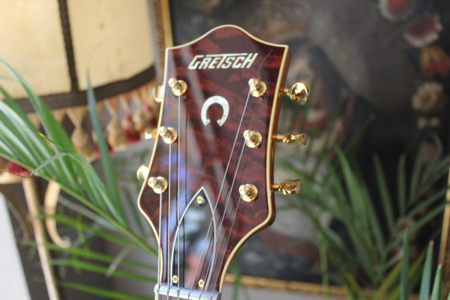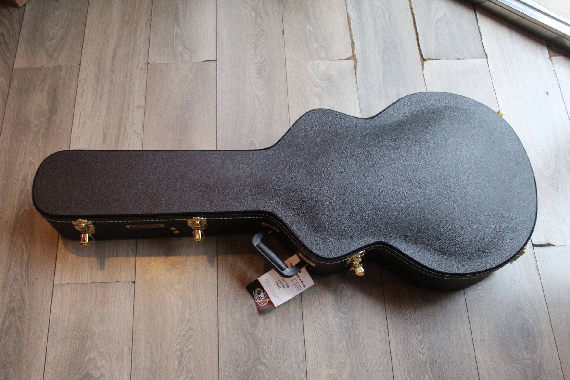Gretsch Quilt Classics are stylish renditions of classic vintage models, reborn with stunning highly figured quilt maple. Co-designed with the guitarist’s guitarist, Chet Atkins, the venerable 6120 is one of the most widely heard Gretsch instruments. The G6120TGQM-56 Limited Edition Quilt Classic Hollow Body stays true to the early design with classic aesthetics that are further elevated by the use of highly figured quilt maple. A veritable tonal multi-tool, this hollow body has an easy-playing, comfortable feel and rings out proudly with That Great Gretsch Sound! FEATURES: Stunning quilt maple body with black G-brand Standard “U” shaped maple neck with 12”-radius rosewood fingerboard, 22 medium jumbo frets, and pearloid wide-block inlays Nitrocellulose lacquer finish Polished aluminum nut Grover® Sta-Tite tuners TV Jones® T-Armond pickups Compensated aluminum bridge with pinned rosewood base Bigsby® B6CBDE vibrato tailpiece Gold hardware General: Brand Name: Gretsch Case Type: Hardshell Case Hardware Color: Gold Product Color: Roundup Orange Stain Lacquer Series: Gretsch Limited Edition Body: Body Finish: Gloss Nitrocellulose Lacquer Body Material: Laminated Quilt Maple Body Shape: Chet Atkins Hollow Body Top Material: Laminated Quilt Maple Neck: Fingerboard Inlay: Aged Pearloid Wide Blocks Fingerboard Material: Rosewood Headstock Veneer: Quilt Maple Neck Finish: Gloss Nitrocellulose Lacquer Neck Joint: Set Neck Neck Material: Maple Neck Shape: Standard "U" Number of Frets: 22 Frets Nut Material: Polished Aluminum Nut Width: 1.6875" (42.86mm) Electronics: Bridge Pickup: TV Jones T-Armond pickup Controls and Switching: 3-Position Toggle: Position 1. Bridge Pickup, Position 2. Bridge and Neck Pickups, Position 3. Neck Pickup; Volume 1. (Neck Pickup), Volume 2. (Bridge Pickup), Master Volume, Master Tone Neck Pickup: TV Jones T-Armond pickup Pickup Configuration: SS Hardware: Bridge: Compensated aluminum bridge with pinned rosewood base Fret Wire: Medium Jumbo Knobs: Arrow Pickguard: Gold Plexi with Gold Gretsch Logo Saddle Material: Polished Aluminum Switch Cap: Gold Tailpiece: Bigsby B6CBDE vibrato tailpiece Tuning Machines: Grover Sta-Tite tuner