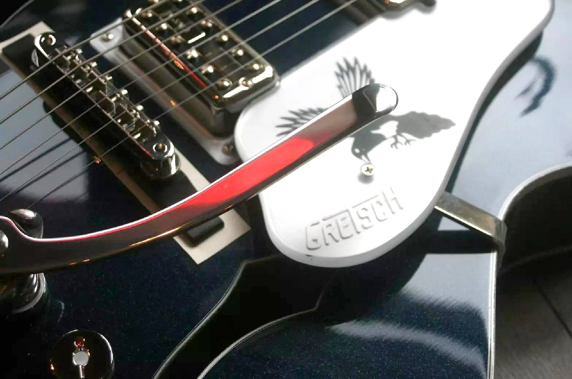 G6136T-RR RICH ROBINSON SIGNATURE MAGPIE Rich Robinson has been at the forefront of rock ‘n’ roll for nearly three decades, ever since his high school days when he co-founded The Black Crowes. Heralded as one of the best live rock acts, The Black Crowes went on to sell over 35 million albums and churn out several charting singles including “Hard to Handle” and “She Talks to Angels,” which Robinson wrote the music for at the tender age of 15. Robinson continued to forge his indelible music legacy as the founder and guitarist for the Magpie Salute, whose 2018 studio album debut High Water I earned instant critical acclaim, while also reuniting with his brother Chris for The Black Crowes Shake Your Money Maker 30th anniversary tour, which was rescheduled form 2020 to 2021. Summoning the light and dark of thundering tones, the G6136T Rich Robinson Signature Magpie with Bigsby® in Raven’s Breast Blue pays homage to an artist who commands the utmost respect. SEVERAL UNIQUE FEATURES 3-Ply Maple Body with Solid Spruce Top 1959-Style Trestle Bracing with Spruce Block Under the Bridge Oversized F-Holes 12”-Radius Ebony Fingerboard Mother of Pearl Neo-Classic™ Thumbnail Inlays Bone Nut TV Jones® Classic Humbucking Bridge Pickup Broad’Tron™ BT65 Neck Pickup Master Volume with Treble Bleed Circuit Adjusto-Matic™ Bridge with Pinned Ebony Base String-Thru Bigsby® B6 Tailpiece