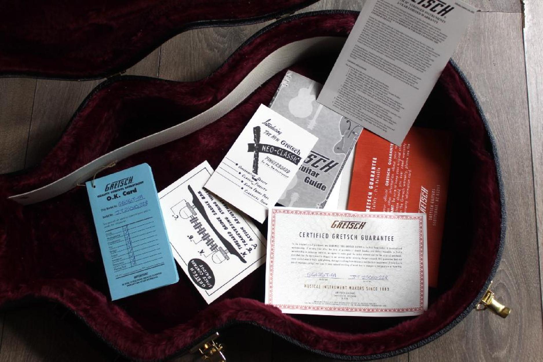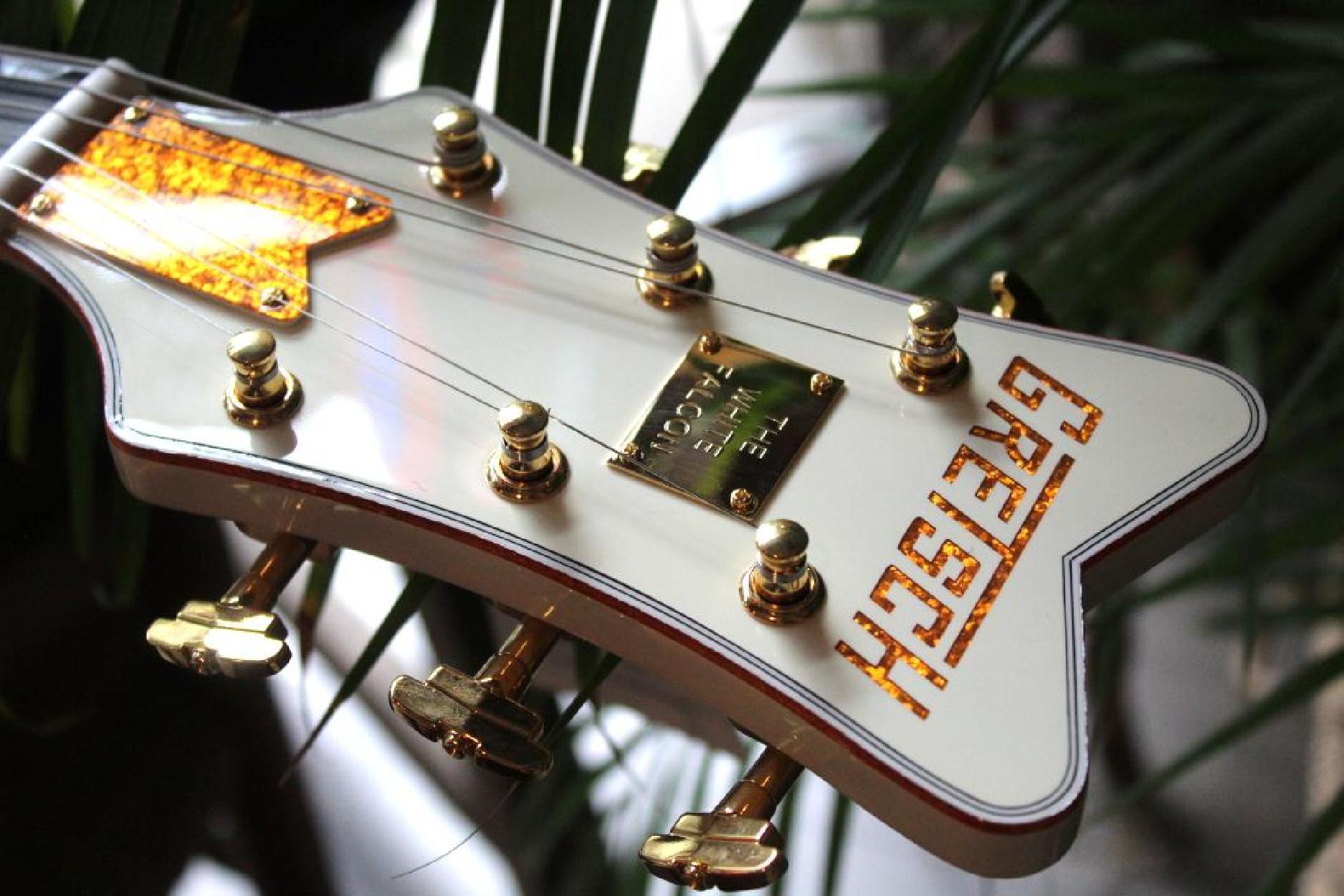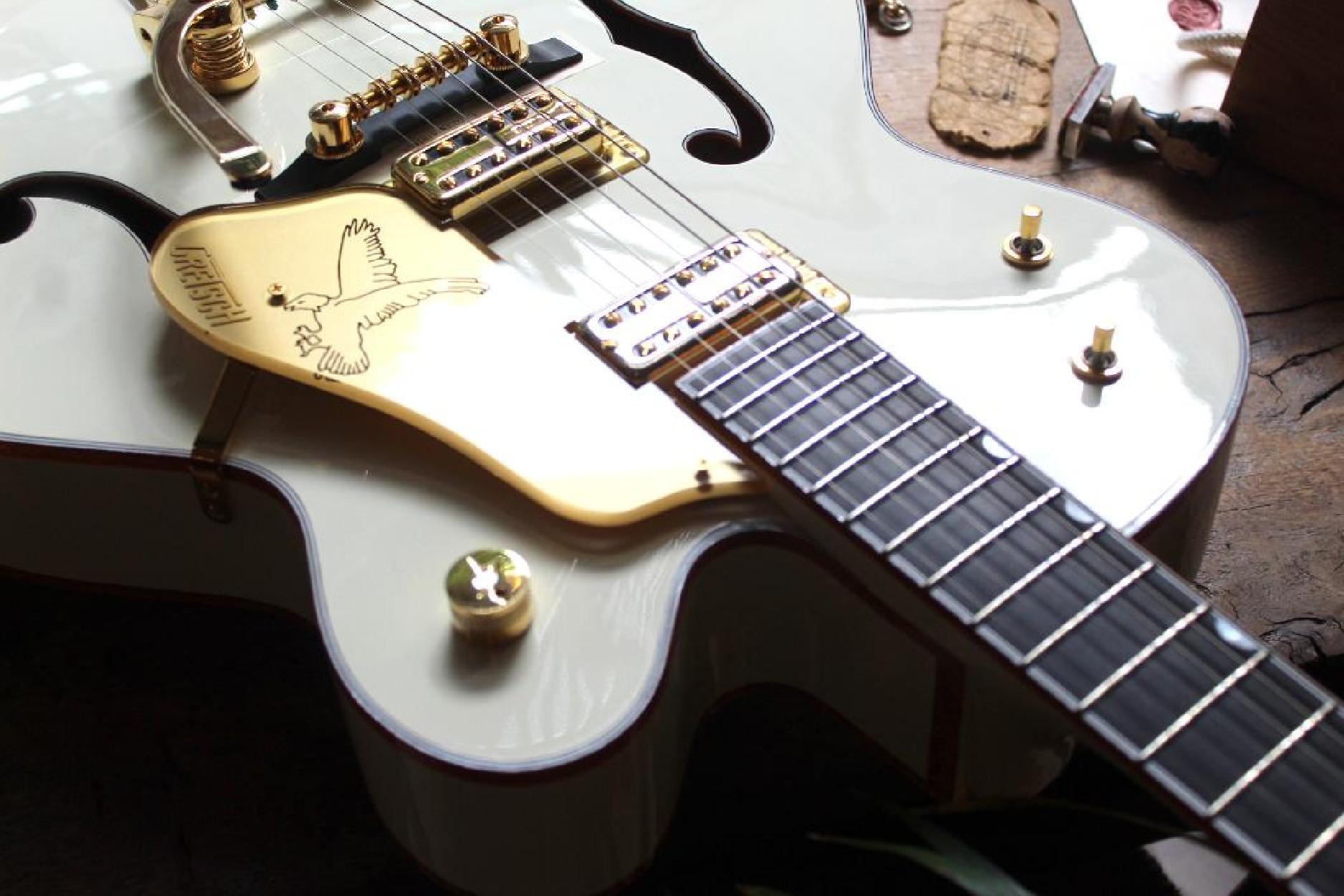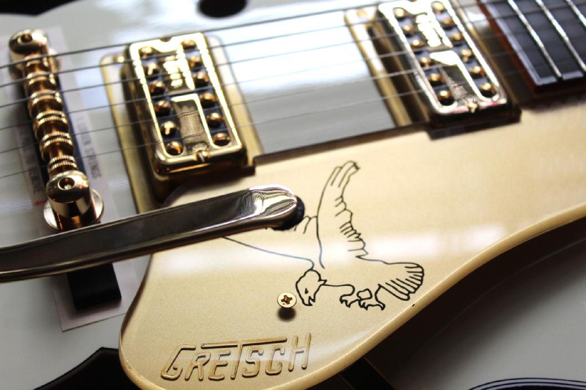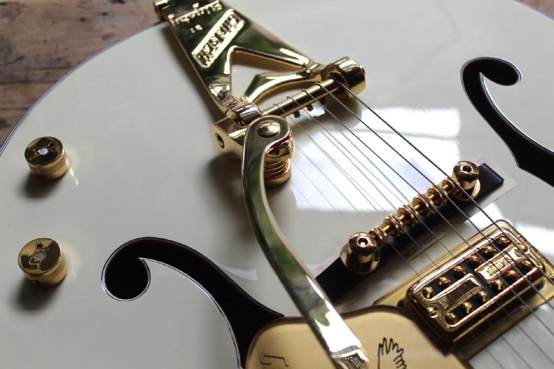 A sophisticated rendition of the original masterpiece, the G6136T-59 Vintage Select Edition '59 Falcon™ Hollow Body with Bigsby® combines period-accurate features and appointments from the golden age of electric guitars. Satisfying eyes and ears with its golden tones and gleaming looks, this rare bird comes alive in the player’s hands, singing with its distinctive voice at every strum. A pair of TV Jones® Classic pickups generates powerful tone and unparalleled dynamics. The new Gretsch “Squeezebox” paper-in-oil capacitors provide an incredibly silky high end. Add some expressive shimmer to your playing with the Bigsby B6GVT vibrato tailpiece while the pinned Space Control bridge and bone nut combine for impeccable tuning stability. A highly resonant 3-ply maple top with 1959-style trestle bracing and multi-ply laminated maple back and sides make this instrument a veritable cannon, firing off notes with incredible projection and rich, balanced tone. A maple neck with a comfortable and versatile standard “U”-shaped profile for supple playability is capped by a 12”-radius ebony fingerboard with 22 medium jumbo frets and classic Gretsch thumbnail inlays, making complex chords, far-reaching bends and intricate single-note playing effortless. Authentically iconic, this striking guitar displays gold hardware—including the gold jeweled “G Arrow” knobs— gold sparkle bound neck, body and F Holes, vintage white gloss nitrocellulose lacquer finish and gold vintage thick plexi pickguard with Gretsch logo. With its stunning looks and huge sound, the iconic G6136T-59 Vintage Select Edition '59 Falcon™ Hollow Body with Bigsby® is the crown jewel of Gretsch guitars. Includes a deluxe hardshell case.