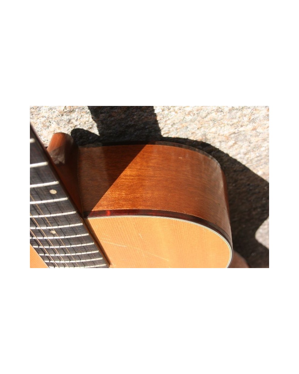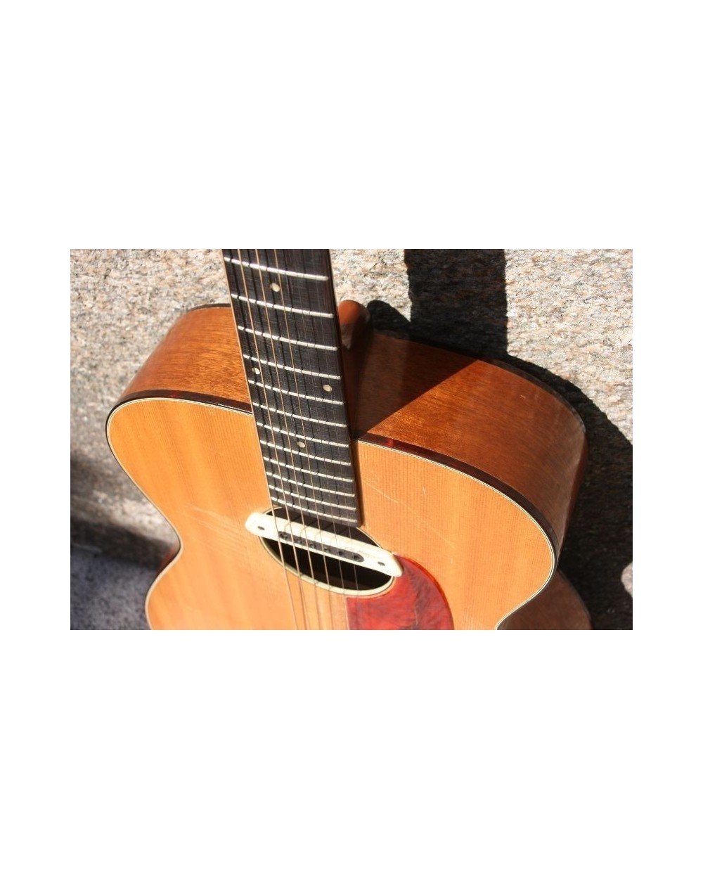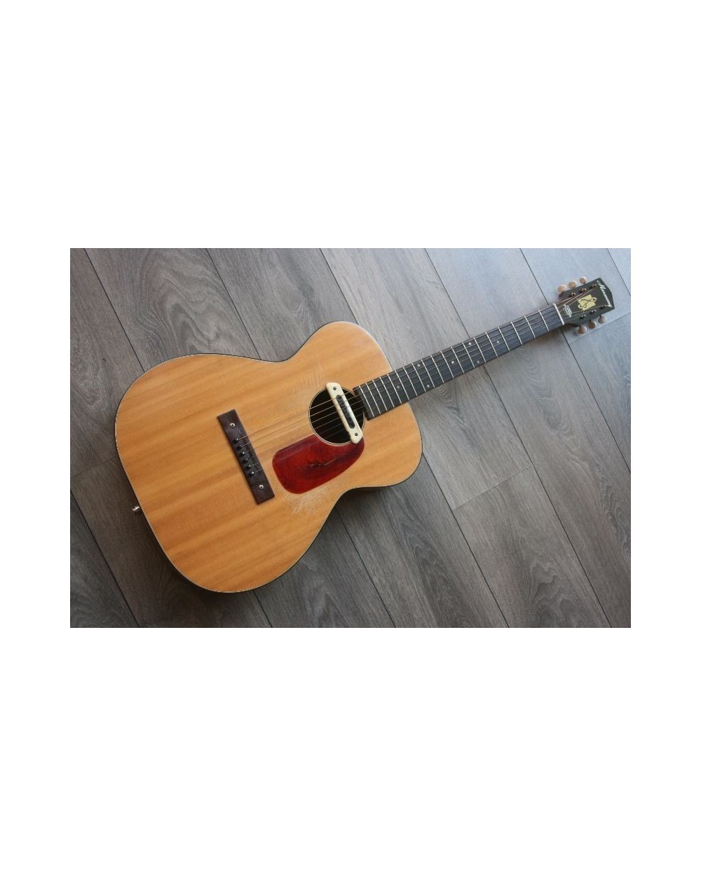 Satin natural finish, 000-size, solid spruce top, ladder braced, mahogany back and sides, 14-fret maple neck, 19-fret rosewood fingerboard with dot inlays (refretted at some point), rosewood bridge, tortoise plastic pickguard and body binding, 15-3/8" lower bout, ~25-3/16" scale length, 1-3/4" nut width.
