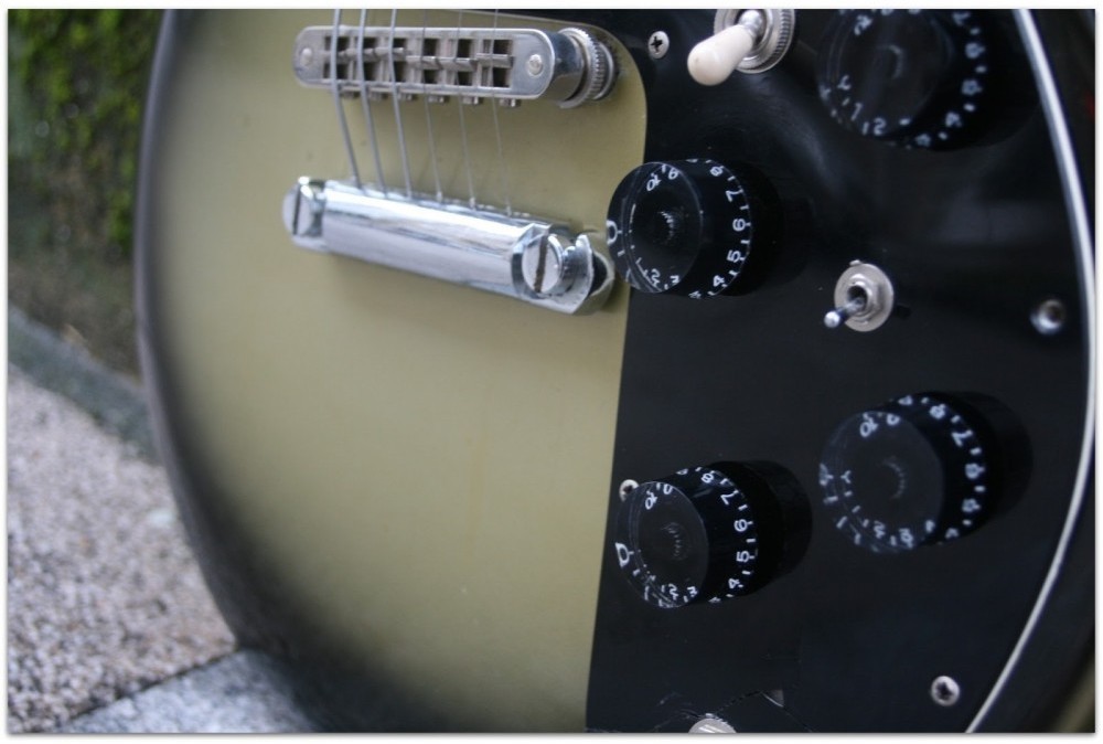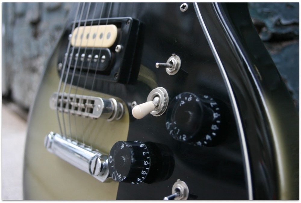 There were four guitar models to choose from in the Sonex Series, all with the Gibson single cutaway design. The Sonex-180 Deluxe featured a rosewood, dot inlaid fingerboard and adjustable exposed Zebra Dirty Fingers Humbuckers. All came With a three-position pick-up selector switch, Tune-0-Matic Bridge', stop bar tailpiece and volume/tone control speed knobs.NOTE: The Sonex Deluxe, the lowest price model, used Velvet Brick humbucker pickups, not Dirty Fingers. The Bricks were designed by Bill Lawrence, working for Gibson. They feature a unique steel mounting plate on the back of the pickup that differs from ALL other Gibson pickups, and has 2 height adjustment screws on one side and one on the other side. They are also black and cream coils, although some were made with the neck pickup in a single color.