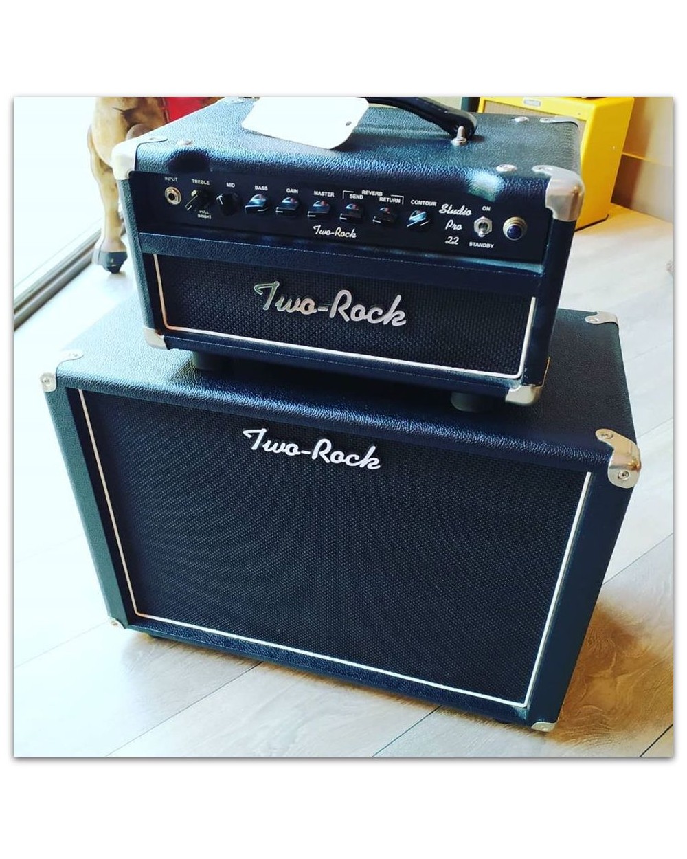 Here is my Two Rock Studio Pro 22 head, made in USA, point-to-point hand wired… Two-Rock Studio Pro amps take the sentiment of the upper end of Two-Rock’s single channel amplifier range (the Custom Clean & Classic Reverb) and house them in a portable chassis with a little less power that makes them ideal for use in a studio environment, in rehearsals or at home – where you need breakup at a lower volume. As a result, the Studio Pro amps also happen to be one of the more affordable Two-Rock ranges making them just a little easier to aspire to when shopping for the amp of your dreams! The Studio Pro amp only has one channel but this does not seem to compromise its versatility. If you’re a pedal person and you like working with single channel amps that have great tone and very little else, the Two-Rock Studio Pro could well prove very versatile indeed. The Two-Rock Studio Pro adds its own character whilst allowing the player’s tonal palette to shine through. Thanks to a unique pickup loading feature, Studio Pro amps also offer a degree of compensation for the output difference between single coil pickups and humbuckers so you get the same sensitivity & responsiveness out of your amp, no matter which pickups you use. Like the other Two-Rock models which come with smaller chassis and 22/35 options, the Studio Pro amps could just as easily be used live with a mic and P.A. setup; so since the Studio Pro does comes in 22w and 35w configurations, it’s refreshing to know that you don’t need to double up on amps to get that amazing tone on stage! It’s all about whereabouts you want the amp to break up into overdrive. The 22w version will be a little easier to drive than its 35w sibling, and may be better suited to small spaces where excessive volume could damage hearing – especially for those who like a little bit of breakup at all times. The classic black tolex finish is classy and typically boutique! Two Rock Studio Pro Guitarist Magazine Review “We used the amp at pub gigs and it roars. Two choice stompboxes up front … can create phenomenal sounds. It proves that if you start with the best clean tone you can find, add drive from quality pedals and play dynamically, you’ll be rewarded with everything you’ve ever wanted from an amp.” “With no pedals the Studio Pro is huge and clear, delivering tones that chime with super clarity… With a Strat’s neck pickup it’s instand Hendrix/Mayer/Vaughan – plummy bass and shimmering trebles; dynamic and utterly musical.” “How much are you prepared to pay for the best tone you may ever have? This reviewer has himself forked out for a Two-Rock, so perhaps there’s your answer.” “Pros: Fabulous clean tones with great headroom and power; fine build. Cons: footswitchable reverb would be nice; that price is hard to ignore.” “These little combos shocked us into submission; we can’t get over how incredible they sound and how perfectly suited they are for their intended players.” Neville Marten – Guitarist Magazine Here’s what Two-Rock say about the Studio Pro 22 Best described as a “portable” Classic Reverb/Custom Clean hybrid, the Studio Pro offers ample clean headroom, dynamics, and a variety of tone shaping options. We’ve added a pickup loading feature, which optimizes pickup balance between single coil and humbuckers. Our stellar reverb circuit with send and return controls, contour control, and full buffered effects loop are standard on this amp. The new Pickup Loading feature control has 5 settings. In the first position(fully counterclockwise), there is no additional pickup loading, with 4 additional settings available. Fully clockwise(last position) is full loading. Loading the guitar pickup(s) to varying degrees changes the impedance relationship between the pickup and the amplifier’s first gain stage. Loading reduces inductive “ringing” in the pickup coils. The effect is a more controlled high frequency response and a reduction in high frequency artifacts produced when a pickup’s magnets and coils feed back with each other, usually at or near the pickup’s saturation point. The damping effect will also reduce the gain, which is normal.Tonally speaking, reducing these artifacts results in a cleaner waveform and an apparent lack of harshness in the upper frequencies. This amp was built specifically for the UK/EU and thus features proper 240V. This amp is in ABSOLUTE EXCELLENT, PERFECT condition. Text from http://www.rollysguitars.co.uk/ what reflecting perfectly our vision too.