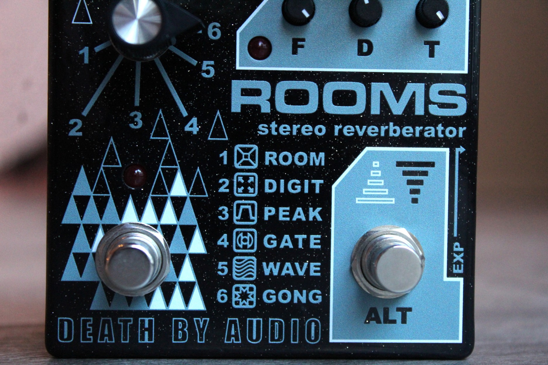 ROOMS is a stereo, multi function digital reverb capable of searing volume, gated walls of sound, and long, trailing reverberant ambiances with an intuitive array of controls designed with live mood-bending in mind. ROOMS was designed to the highest standards of flexibility and audio fidelity. A studio-quality mixer section provides independent DRY and FX controls over six meticulously programmed reverb algorithms; ROOM, DIGIT, PEAK, GATE, WAVE, and GONG. Each different verb is capable of a universe of sounds, and ROOMS is here to help you explore them. ROOMS' creative I/O switching and dual-mono dry signal lines allow for a wealth of possible mono and stereo configurations, making it easy to route signals for parallel processing or stereo amplifier setups.