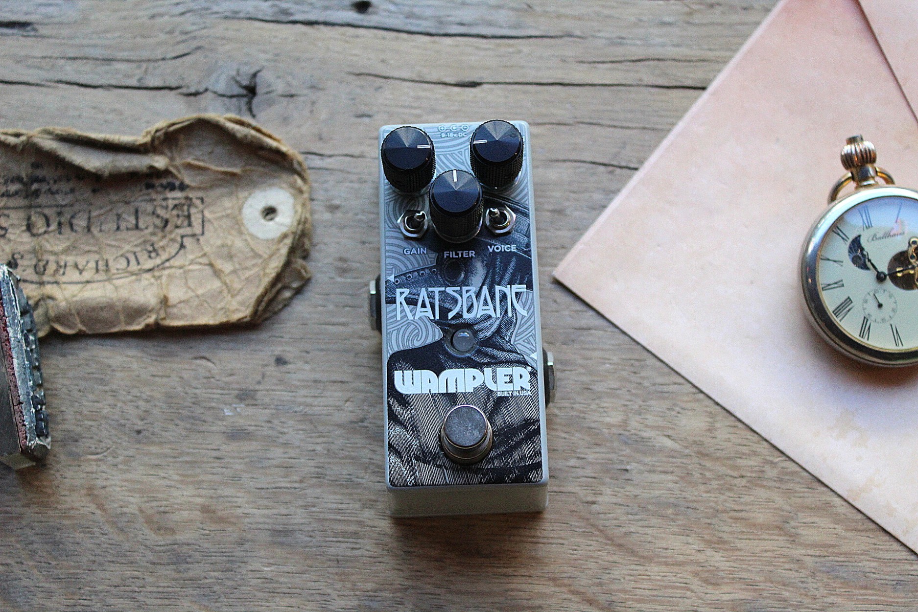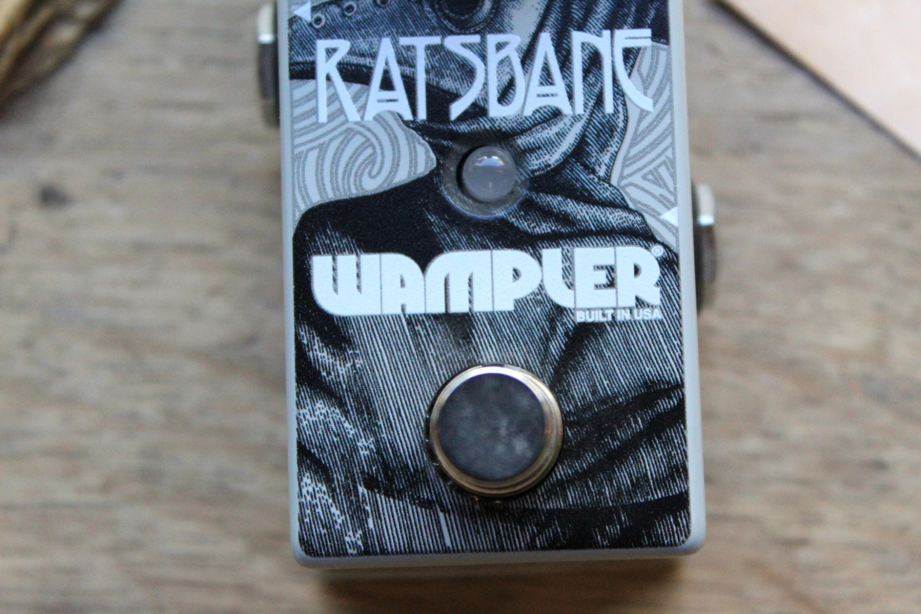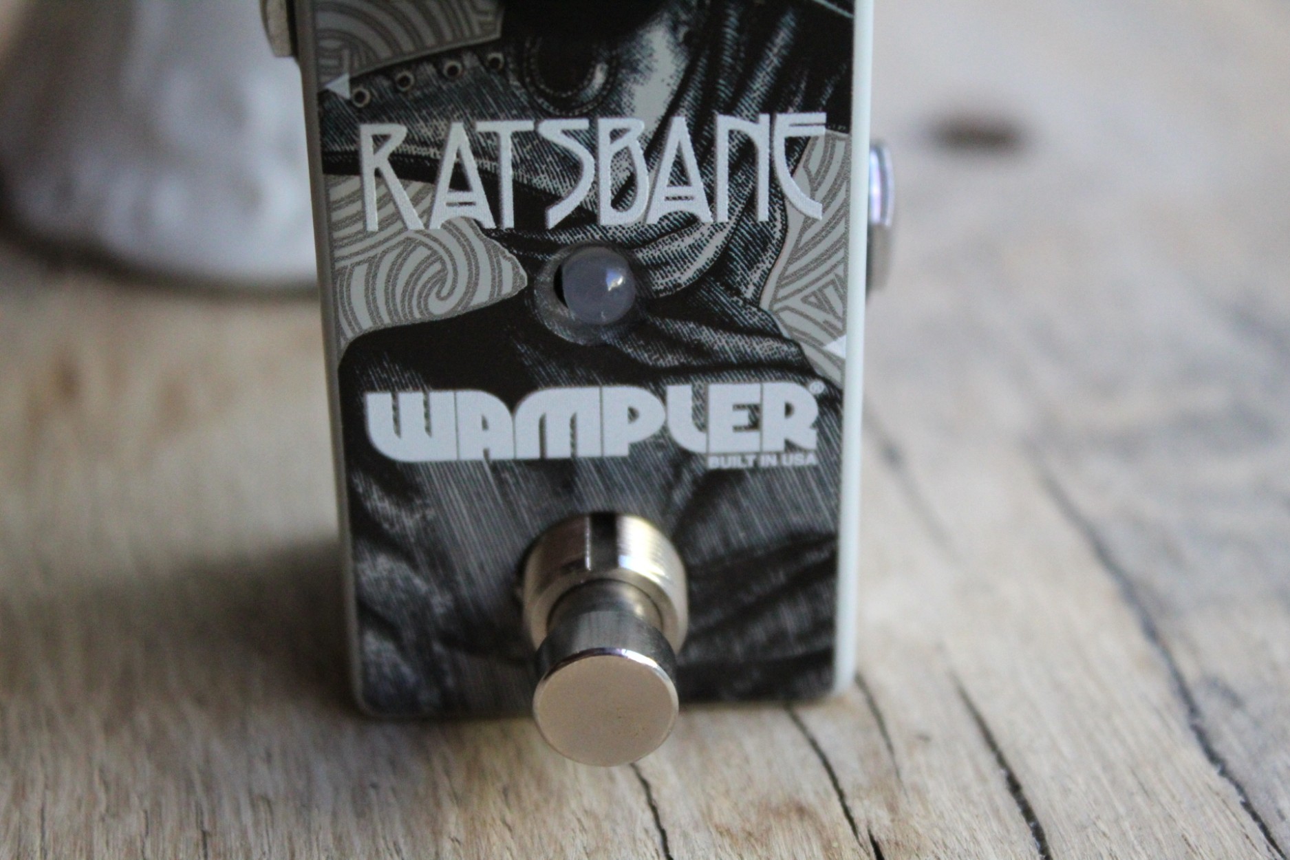 RATSBANE DISTORTION If you are looking for a single pedal solution with multiple degrees of gain from light overdrive to full out saturated fuzz tones, then you’ll surely love the Ratsbane. The Ratsbane is based on a true benchmark sound amongst guitarists that has been heard on thousands of famous recordings. The full, dynamic range, and sheer sonic force of this circuit is what makes it a true king amongst distortion pedals. Turn the distortion control all the way down for a deep but powerful gain booster. Crank it up and you will find rich harmonic overtones and a throaty, fuzz-like distortion. The “secret sauce” for this circuit has always been the filter control. Turn it counter-clockwise to cut straight through the mix with precision and high-frequency attack that lets your tone soar with absolute clarity. Turn it clockwise to filter the top end, for a warm, buttery, yet clear tone. This natural full-range distortion, mixed with its unique filter control, delivers a classic cranked tube-amp sound that crosses genres and generations of music. In typical Wampler fashion, Brian improved the circuit’s flexibility by adding two new switches. The Gain switch offers three distinct choices. In the middle gives you the “stock” gain for this pedal. Flick it either right or left for 2 additional turbocharged gain stages you can play with. The left position offers a firm, yet smooth boost in gain, whereas the right delivers an insane level of creamy distortion. The Voice switch subtly alters the compression and clipping of this pedal. It tightens the distortion to be more manageable with greater levels of gain, while rolling back some of the fuzz qualities, to deliver a modern, high gain distortion.