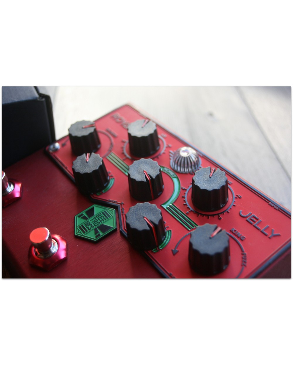 A ton of sweet spots. roy·al jel·ly - a substance secreted by honeybee workers and fed by them to larvae that are being raised as potential queen bees. The Royal Jelly is an overdrive/fuzz blender like no other pedal. It can cover any ground from overdrive to fuzz, running two circuits in parallel and giving you the possibility of blending it or having them separately. Natural transitions. It also has two presets of the blend, called Queen and King. The presets allow you not only to have two different sounds on the fly, but also make for a very natural transition between them, since instead of switching pedals, you are mixing the levels between your overdrive and fuzz. It’s also possible to blend in your dry signal, a great feature for bass, drums and synths or any studio use. The sweetest blend. On the guitar the DRY control is great to create unique clean tones with a fuzzy background. The Jelly’s powerful EQ gives you 10dB of cut/boost for HI and LO making it possible to shape your tone in many different ways, while the BUZZ switch adds that nasty high end usually found on the vintage fuzz boxes to its fuzz circuit. The Royal Jelly drips tone and it’s a pedal that can change your approach to overdrive and fuzz.