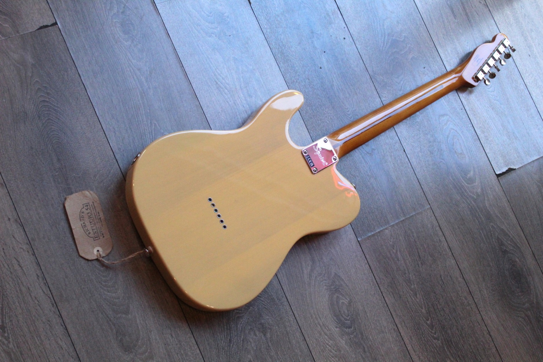 Classic vibe with modern refinements. The Squier Classic Vibe Telecaster '50s is an electric guitar with a look to die for and plenty of '50s 'blackguard' Tele vibe. The Vintage Blonde or Butterscotch Blonde over pine body totally resonates and you'll be hard-pressed to tell whether or not you are holding a premium ash body guitar. Of course pine is not a foreign wood to guitar making or to Fender history for that matter. Early single and dual pickup Esquire guitars were made with pine bodies. Featuring a 21-fret vintage tint gloss maple neck with the modern playability of a 9-1/2" radius and medium jumbo frets, and outfitted with a custom set of Alnico 5 single-coil pickups on the Butterscotch Blonde model and Alnico III on the Vintage Blonde, this Squier Tele has tone that can really hang with the big boys. You get clear note separation even in distorted modes and dynamic response with a strong midrange and high end bite for leads. Classic Vibe Back in 1982, the very first Squier by Fender guitars and basses came ringing out of Asia. Known for their excellent vintage-quality look, feel, sound, and construction, those early Squier instruments and their Fender-branded counterparts are now highly sought-after collector's items revered by guitar enthusiasts as models of "getting it right" while aiming at value-conscious players. The Squier Classic Vibe Series reflects that simultaneous commitment to excellence, value, and vibe. Mirroring classic Fender designs, the Classic Vibe offering is not intended to be era or vintage correct-but rather imparting the vibe of a classic Fender design. Each with distinctive feature set combinations-all adding up to one classic-looking instrument. FEATURES Resonant pine body just like the early Equires 1-Piece maple, modern "C" shape neck with maple fingerboard Custom Telecaster pickups Chrome hardware including vintage-style tuning machines Vintage-style Tele bridge plate w/brass barrel saddles Bridge Cover not included