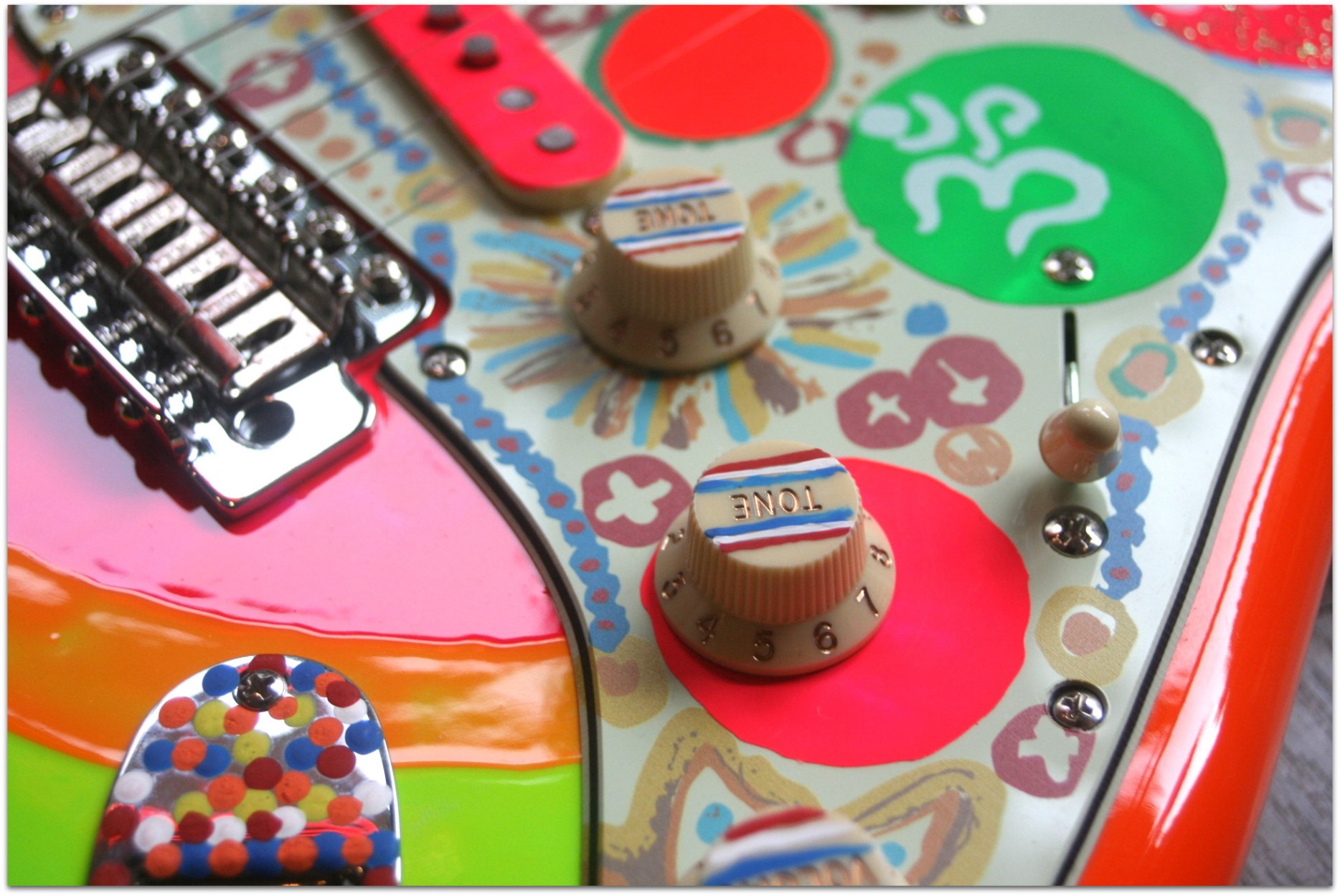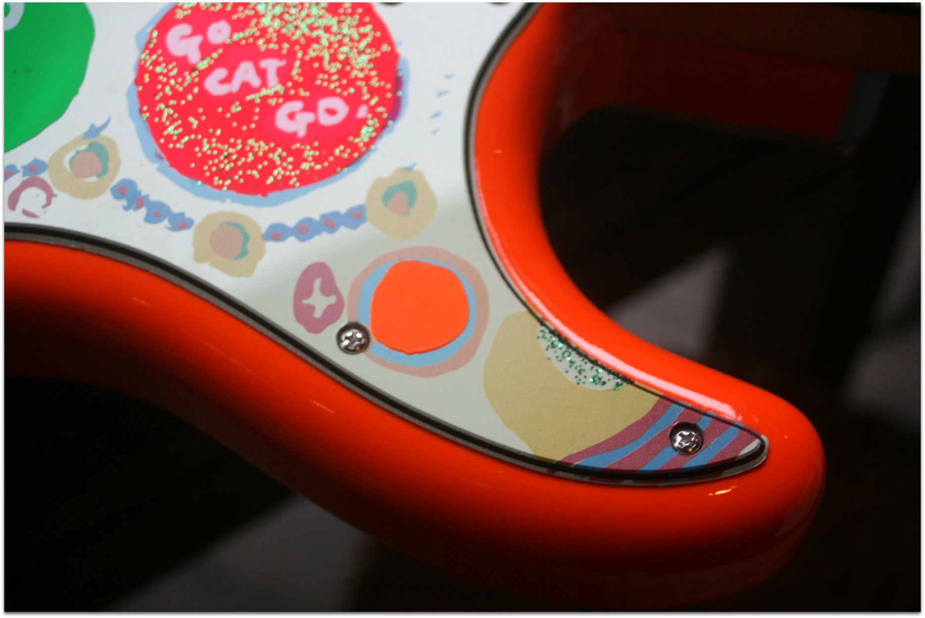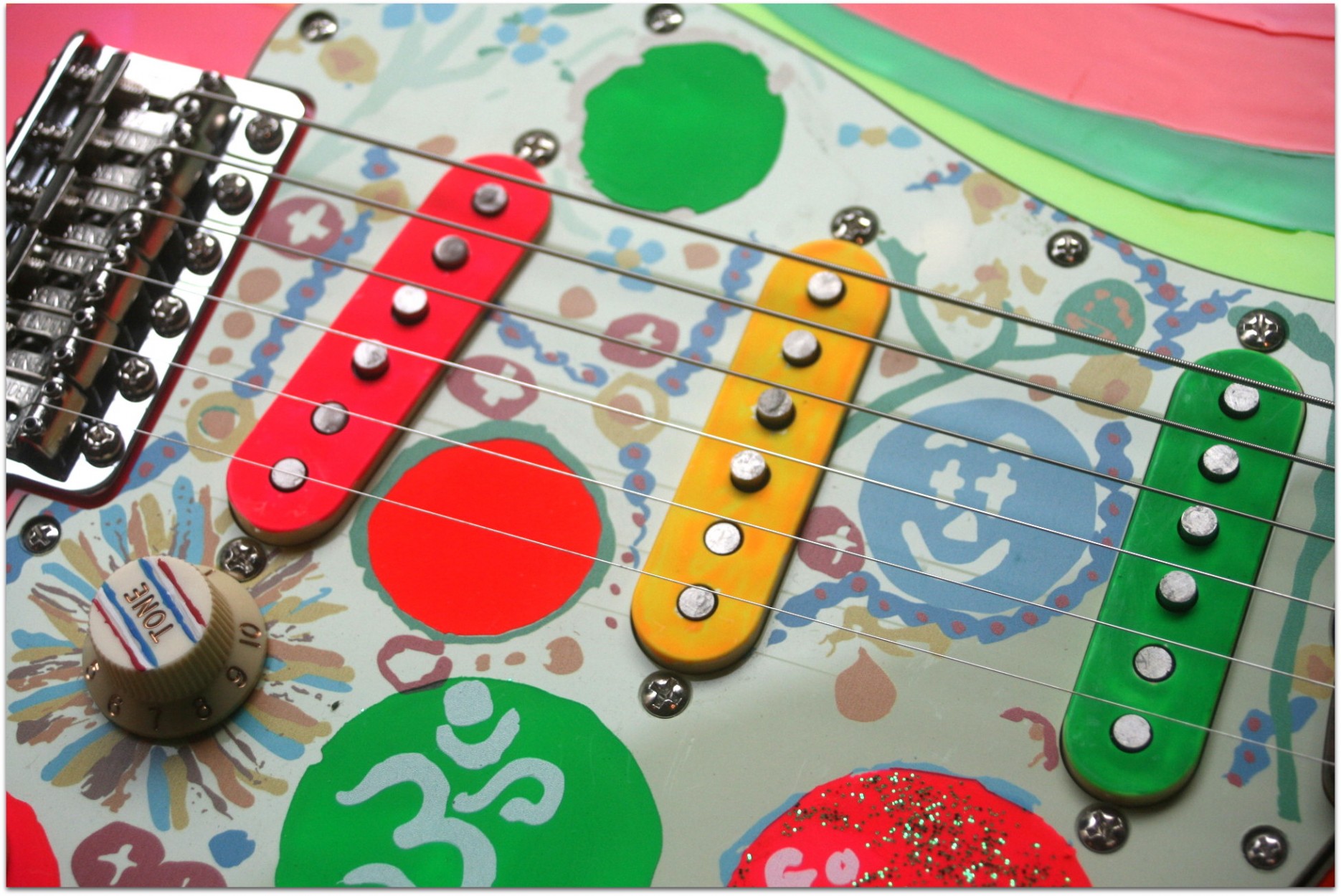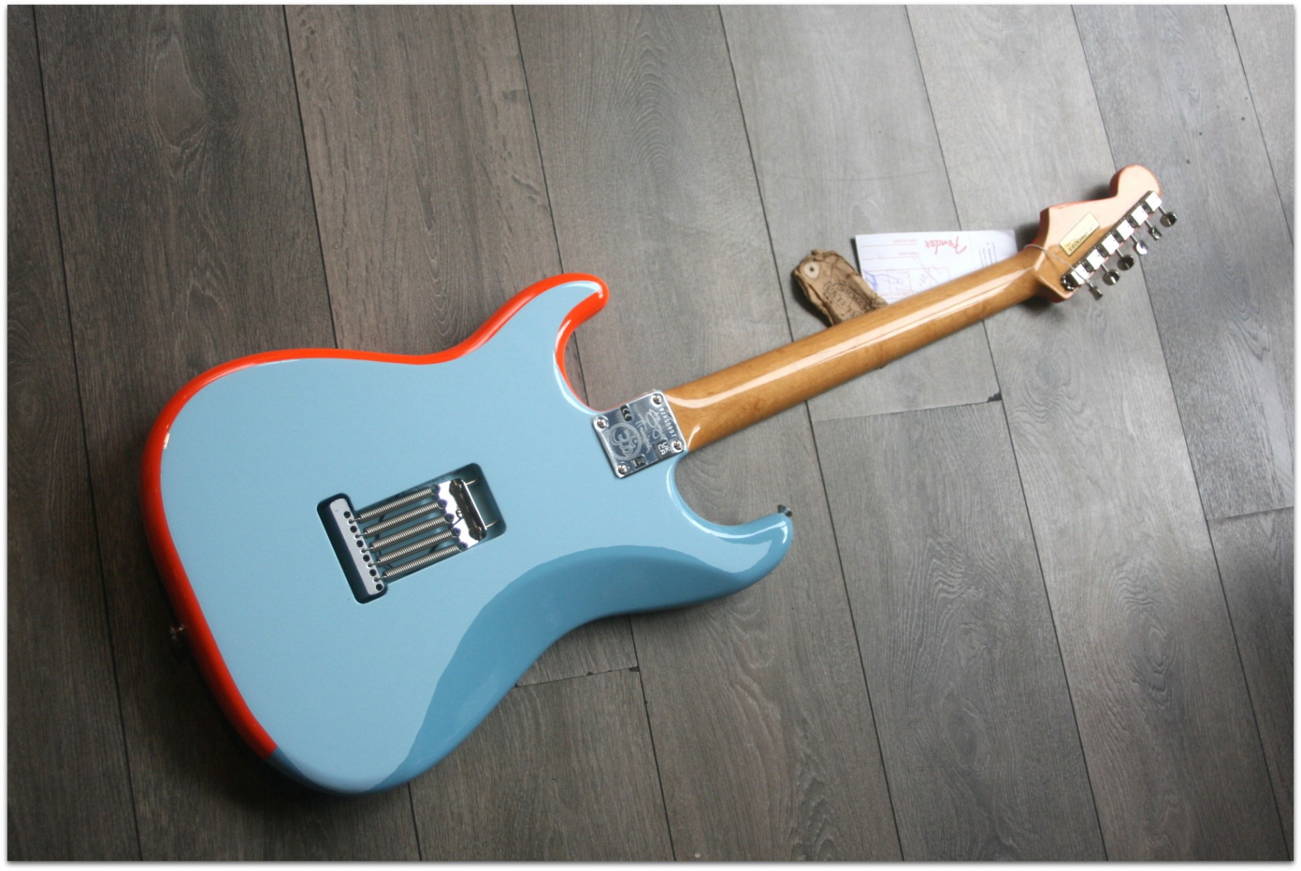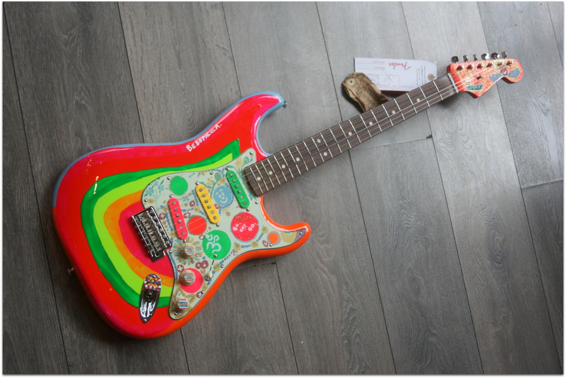 "El impacto y la influencia de George Harrison en la música popular no tiene paralelo. Conocido por empujar los límites musicales y la experimentación sonora, los ganchos inventivos y los tonos innovadores de George ayudaron a impulsar a los Beatles a un estatus legendario. George tocó una variedad de guitarras icónicas a lo largo de su carrera, pero la más visualmente distintiva era su Sonic Blue Stratocaster de 1961, pintada a mano en colores psicodélicos Day-Glo y cariñosamente llamada "Rocky". George adquirió la guitarra en 1965 y la usó por primera vez en el álbum Rubber Soul de los Beatles y continuó tocándola extensamente en grabaciones posteriores, incluidas Revolver, Sgt Pepper’s Lonely Hearts Club Band, Magical Mystery Tour y White Album. La George Harrison Rocky Stratocaster presenta un cuerpo de aliso cuidadosamente pintado a mano con una réplica de las famosas pinceladas psicodélicas de Harrison. Se captura hasta el último detalle, desde el diseño del golpeador y las piezas de plástico hasta una calcomanía de réplica en la parte posterior de la pala de Grimwoods, la tienda de música original donde se compró la guitarra. Un trío de pastillas Stratocaster de estilo vintage de los años 60 suenan con un tono dinámico y cristalino que recuerda a la época dorada de Fender. Un mástil de arce en forma de "C" de mediados de los años 60 con un diapasón de palosanto de radio de 7,25" y 21 trastes de estilo vintage ofrece un perfil de mástil familiar con una sensación cómoda. Finalmente, la Rocky Strat presenta un trémolo sincronizado de estilo vintage y clavijero que brindan la apariencia de un instrumento Fender clásico". CARACTERÍSTICAS Corps en aulne Finition Rocky peinte à la main Micros ‘60s Stratocaster de style vintage Manche en érable au profil ”Mid-’60s C” Touche rapportée en palissandre au rayon de 7.25" (184 mm) avec 21 frettes de style vintage Médiators Rocky custom