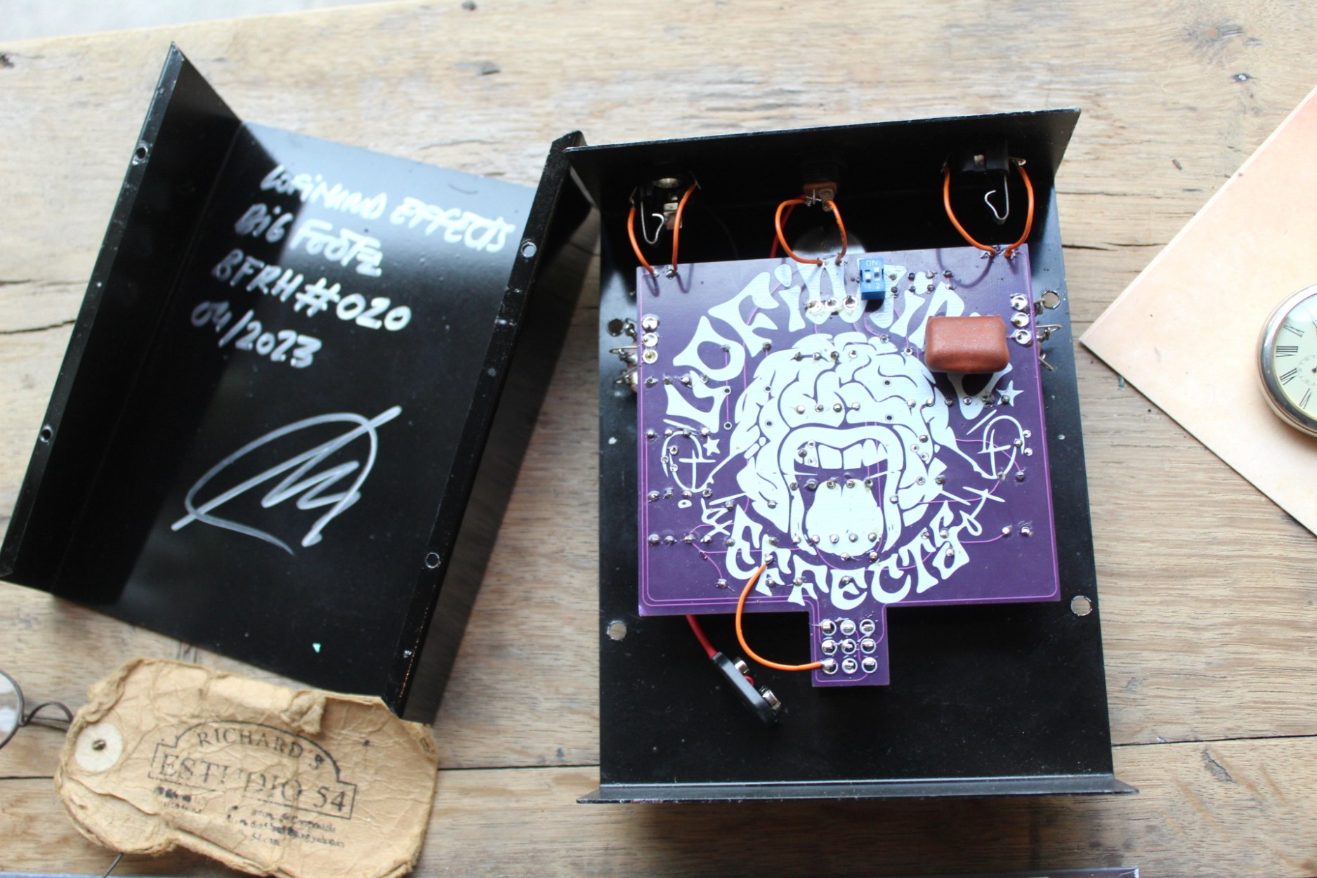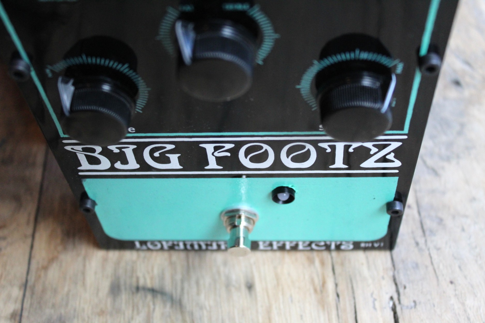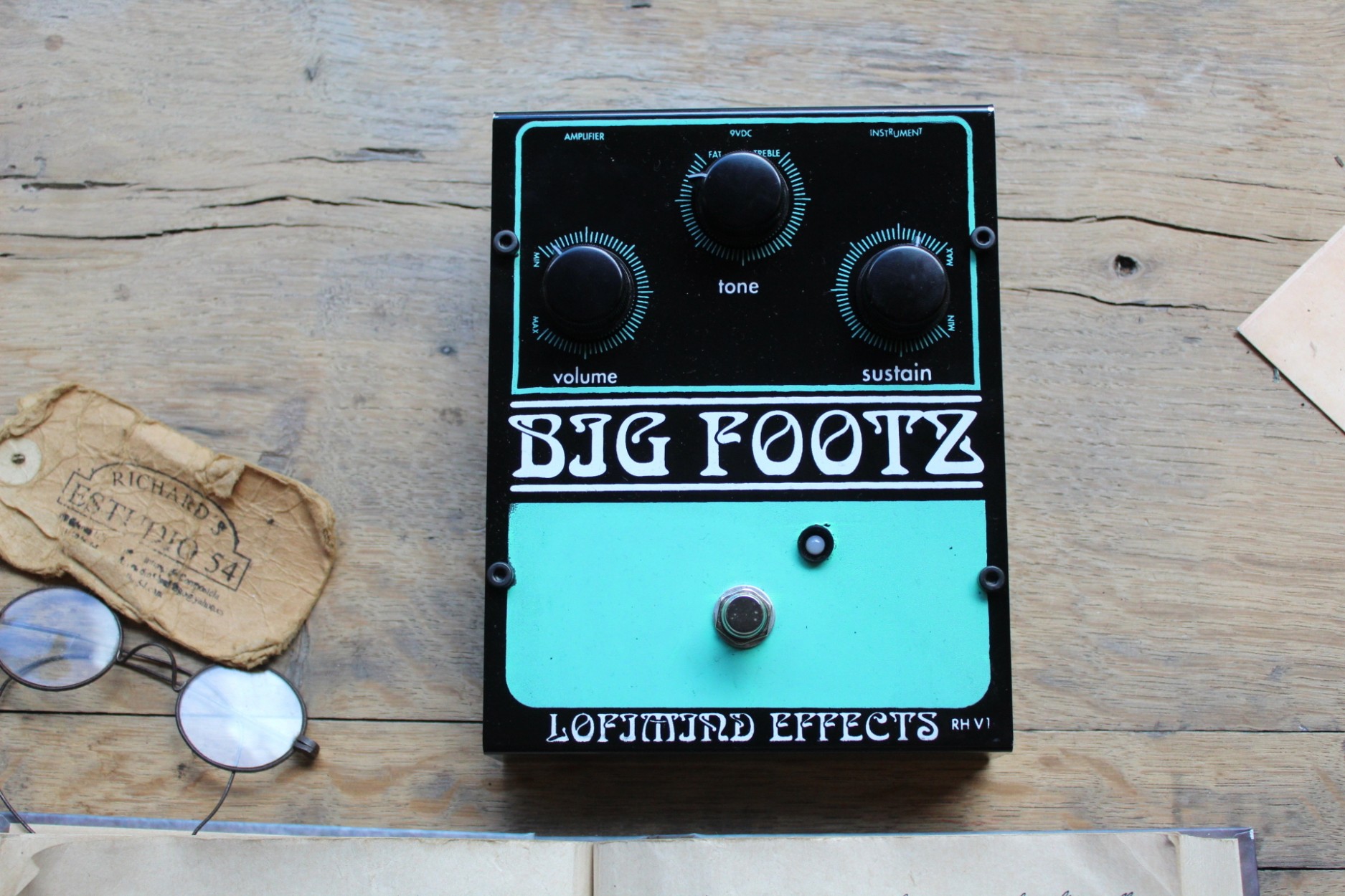 Two colors avaliable! BIG FOOTZ the Muff shot made by LofiMind Effects, Big Footz units are built point-to-point on perforated Bakelite and NOS components, using the BC239 transistor as a starting point. the scheme runs between the Ram's Head, (V2-V3) built point-to-point (like the V1) and graphically inspired by the V6 of the late 70s. It has the classic Volume, Tone and Sustain controls, getting much closer in sound to a bender than to a big muff. Part of the V2s from the 70s do not add volume to your signal. With the Big Footz at 12-13 o'clock we get to equalize the signal, leaving plenty of knob travel to add volume to our guitar signal. the sound is super-crystalline and articulate, it doesn't squash notes like the more standard Muff's, so the tone knob is usable all the way around and has a very good sound.