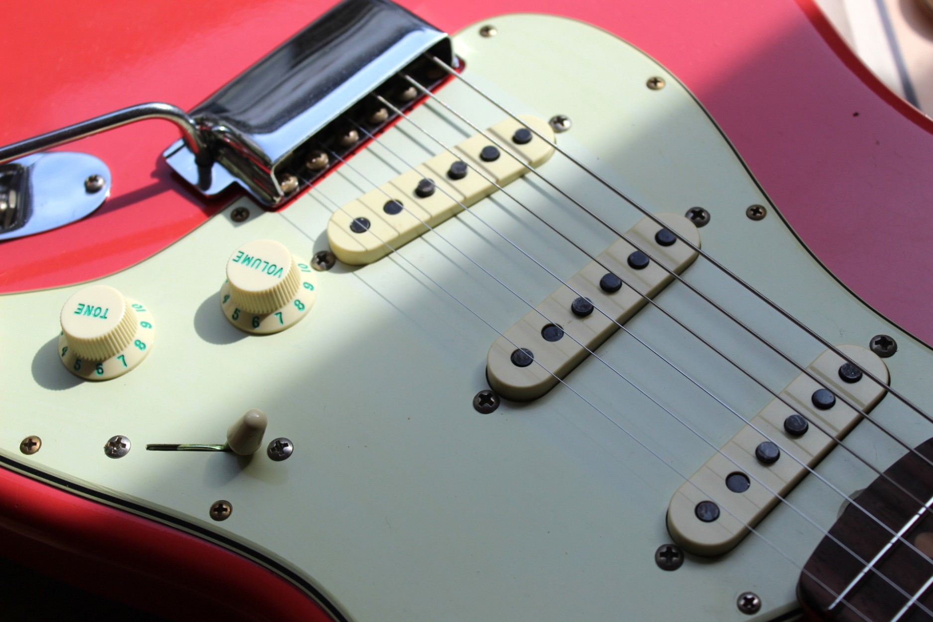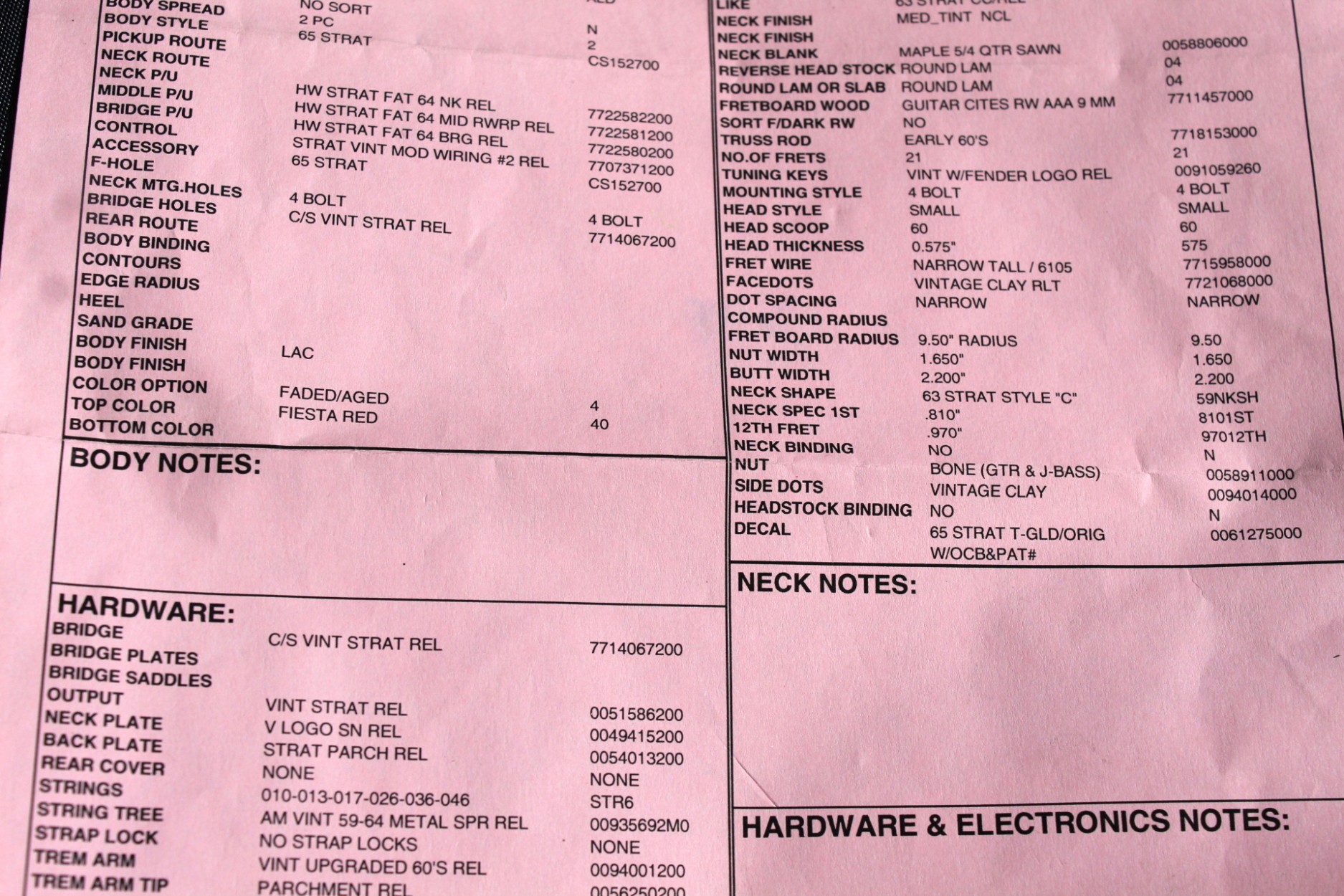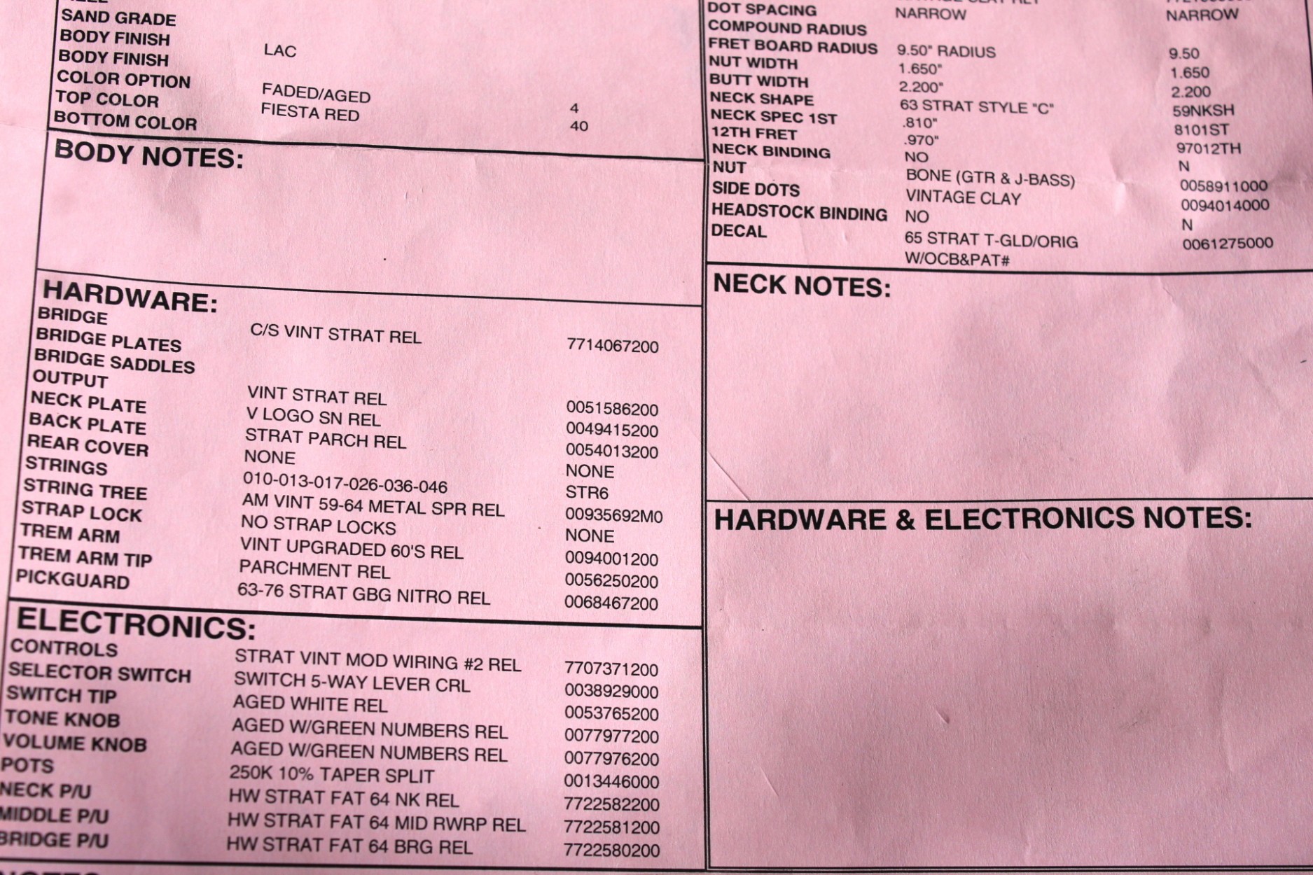 GENERAL Number of Strings 6 Left-/Right-handed Right-handed BODY Body Type Solidbody Body Shape '64 Stratocaster Journeyman Body Material 2-piece Select Alder Body Finish Gloss Nitrocellulose Lacquer Color Faded Aged Fiesta Red, relic'd NECK Neck Material Quartersawn Maple Neck Shape 1963 C Neck Joint Bolt-on Radius 9.5" Fingerboard Material Round Lam Rosewood Fingerboard Inlay Vintage Clay Dots Number of Frets 21, Narrow Tall Scale Length 25.5" Nut Width 1.650" Nut Material Bone HARDWARE Bridge/Tailpiece Custom Shop Vintage Synchronized Tremolo Tuners Vintage-style ELECTRONICS Neck Pickup Custom Shop Hand-wound Fat '64 Strat Single-coil Middle Pickup Custom Shop Hand-wound Fat '64 RWRP Strat Single-coil Bridge Pickup Custom Shop Hand-wound Fat '64 Strat Single-coil Controls 1 x master volume, 2 x tone Switching 5-way blade pickup switch MISCELLANEOUS Strings Fender, .010-.046 Case/Gig Bag Hardshell Case