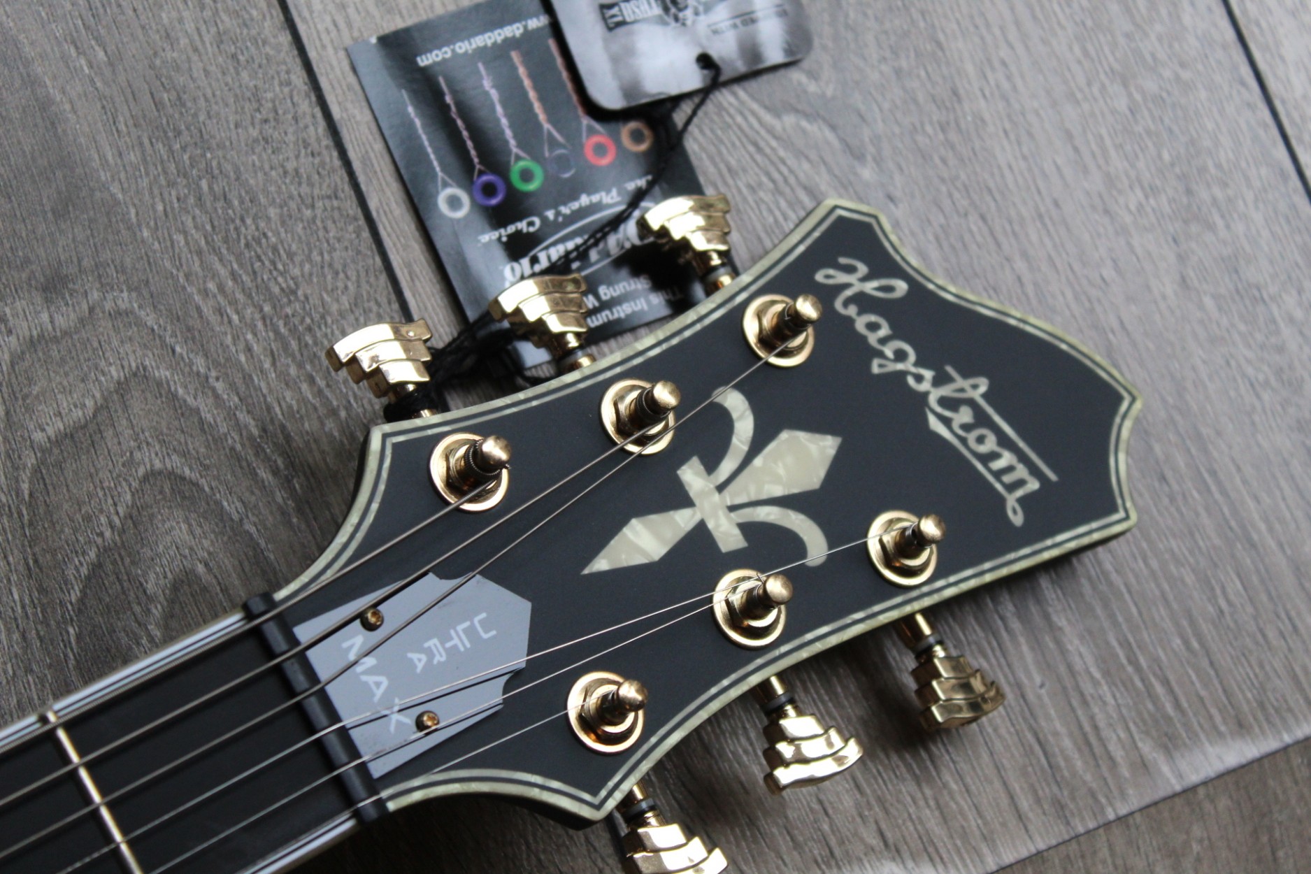 Body: Mahogany Top: Maple with carved curve Neck: Glued Mahogany with H-Expander Truss Rod Fingerboard: Resinator Tuners: Hagstrom 15: 1 Gold Frets: 22 medium jumbo Scale: 25.5 " Neck Profile: Ultra Slim with ‘’ D ’’ Profile Inlays: Pearl Blocks Hardware: Hagstrom Gold custom Bridge: Long Travel Tune-O-Matic Gold custom + Hagstrom Sustain Block Tailpiece with Gold custom trim Neck Pickup: Hagstrom Classic P90 Gold Cover Bridge Pickup: Hagstrom Custom 60 Alnico-5 Humbucker (with split-coil system) Controls: 1 x Neck Pickup Volume, 1 x Bridge Pickup Volume, 1 x Tone (with built-in push / pull system for function split-coil), 1 x 3-position toggle pickup selector Cover included: Hagstrom Bag E20 model