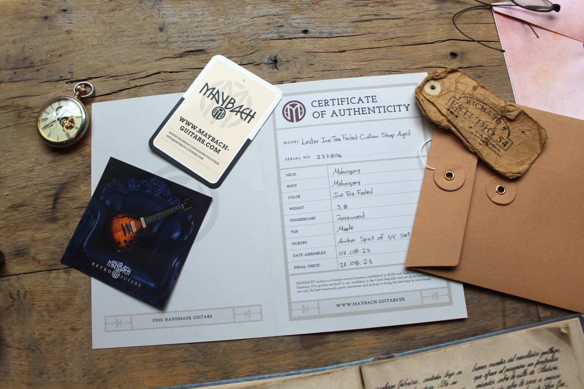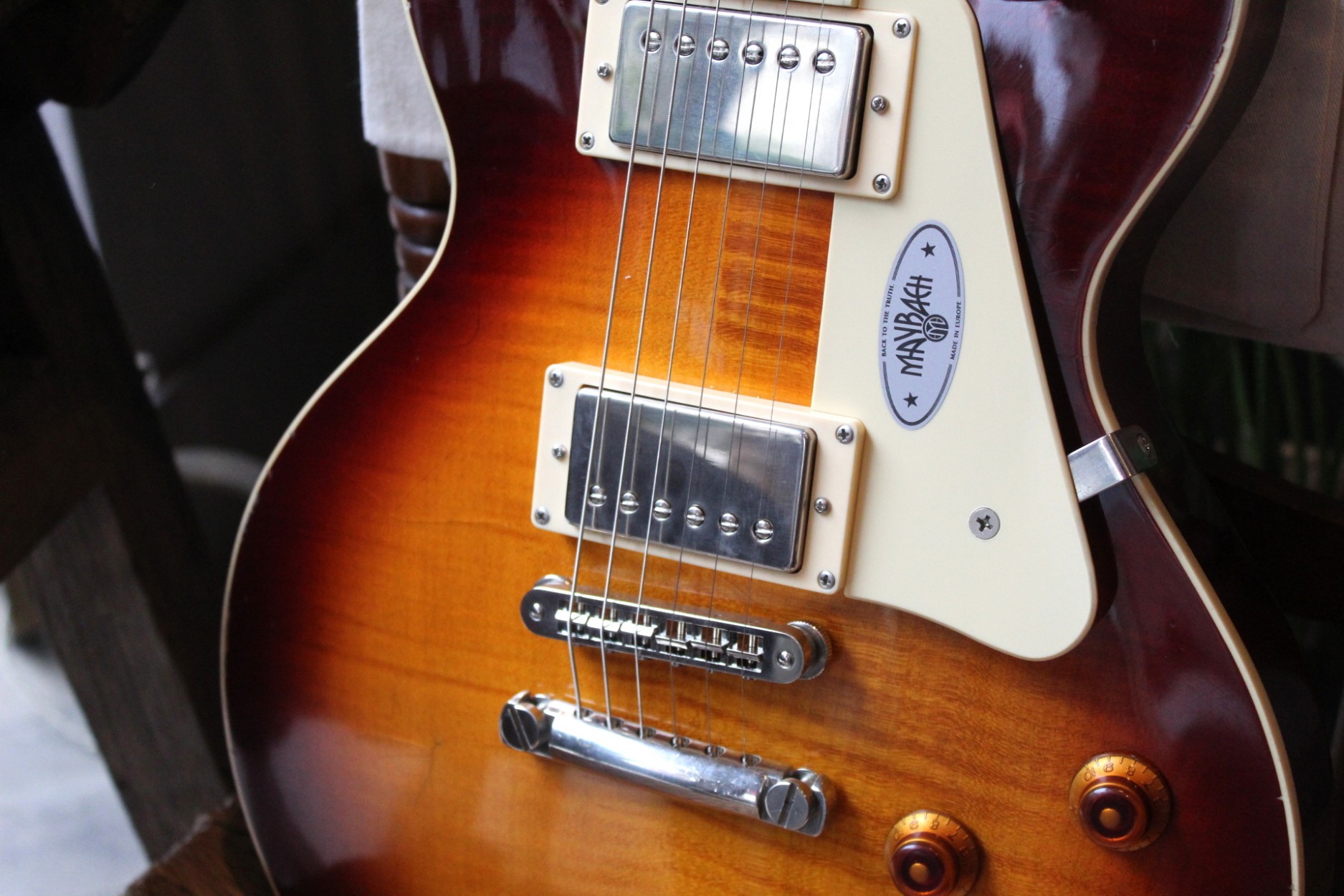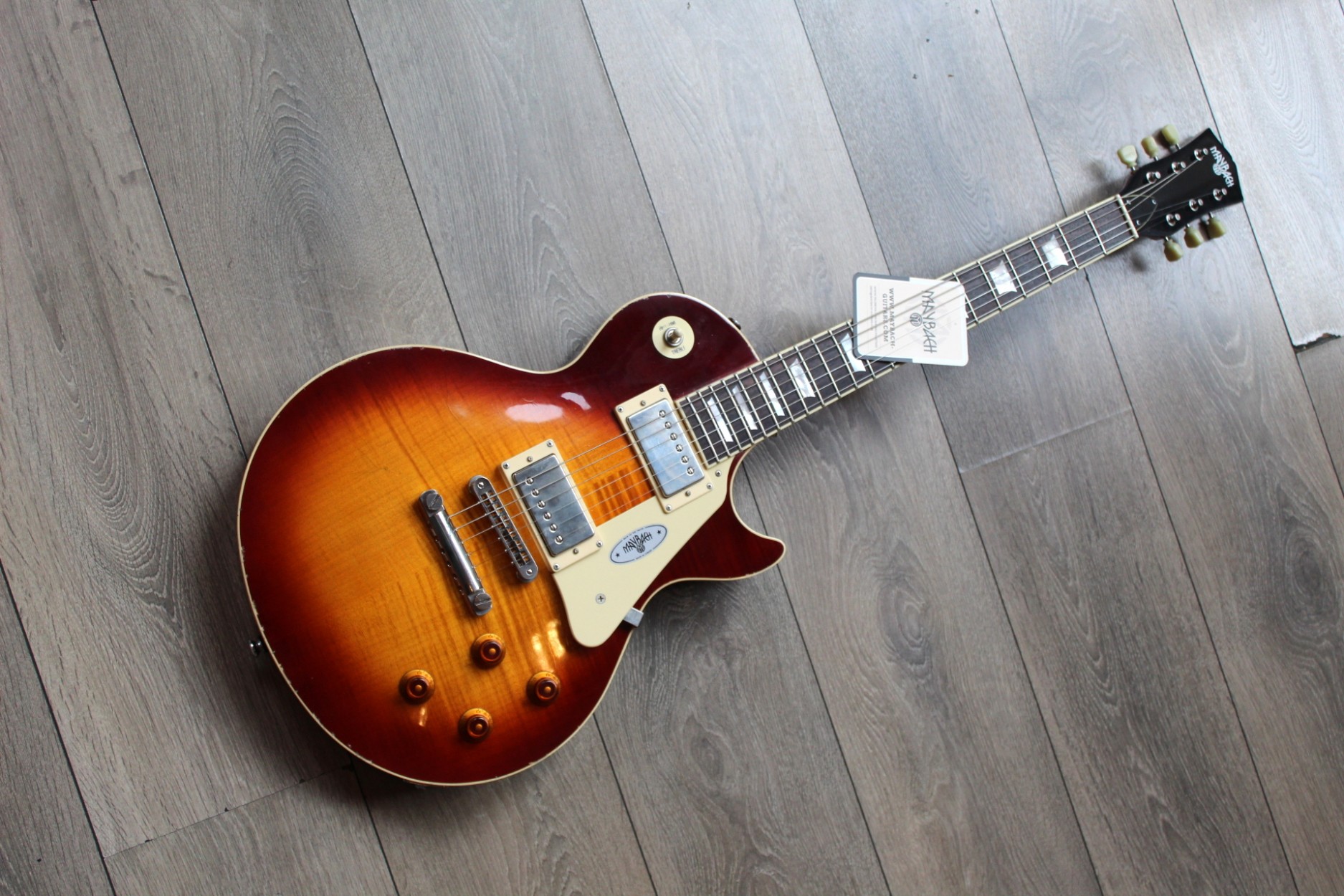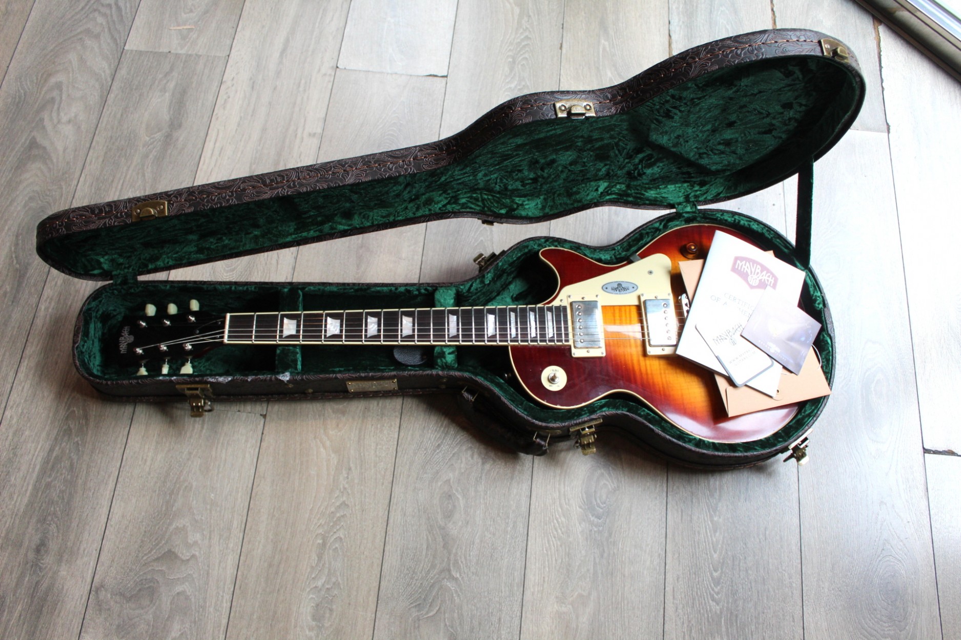 FIRST PIECE BUILT, 3, 80 Kilograms, A true JEWEL!!! The Queen Of Everything When a genius musician shook the music world with an ingenious guitar design long ago, no one could have expected that he had enthroned the coming queen of the electric guitar world. When this queen cemented her reign in the 1960s with legendary blues-rock sounds from incredibly talented guitar heroes, she got the rock rolling and laid a fundamental foundation for unforgettable trademark sounds. Without them, today’s guitar world would sound completely different. No wonder this guitar design has become one of the most popular in electric guitar history – and one of the most successful in the Maybach world. We build the artful creations of our Lester Series with the best possible awareness of this great tradition of the golden Fifties. Each Lester leaves our workshop knowing it will carry on the great legacy of this genius musician to the world. And this leaves us both humble and proud. · Construction form: Singlecut · body: one piece mahogany · top: AAAAA flamed maple · Border: 1-layer, cream · Neck: Mahogany · Neck Construction: Long Neck Tenon, glued · scale in mm: 628 · Fingerboard: Premium Rosewood · Fingerboard radius in inches: 12 · Number of frets: 22 · Fingerboard Inlays: Trapez · Capo material: Bone · saddle width in mm: 42.8 · pickup: HH · Pickup manufacturer: Amber · Neck Pickup: Spirit of 59 Humbucker · Bridge Pickup: Spirit of 59 Humbucker · Coil-Splitting: No · Switch: 3 ways · control: 2x Vol, 2x Tone · capacitors: Paper In Oil · Bridge: Tune-o-Matic · Rope support: Stopbar · Mechanics: Kluson Deluxe Green Keys · Strap buttons: Standard · Hardware: Nickel Factory string thickness: .010 - .046 · Factory tuning: Standard E · finish: nitrocellulose, Aged · includes case: Yes · certificate: yes