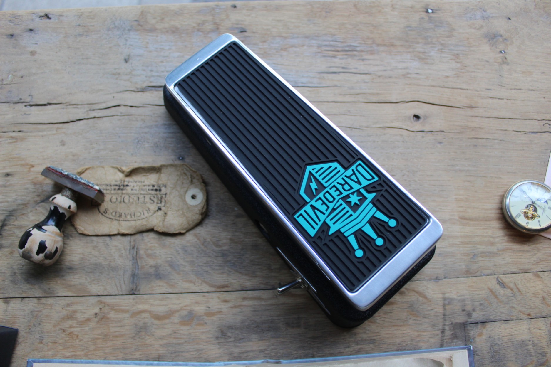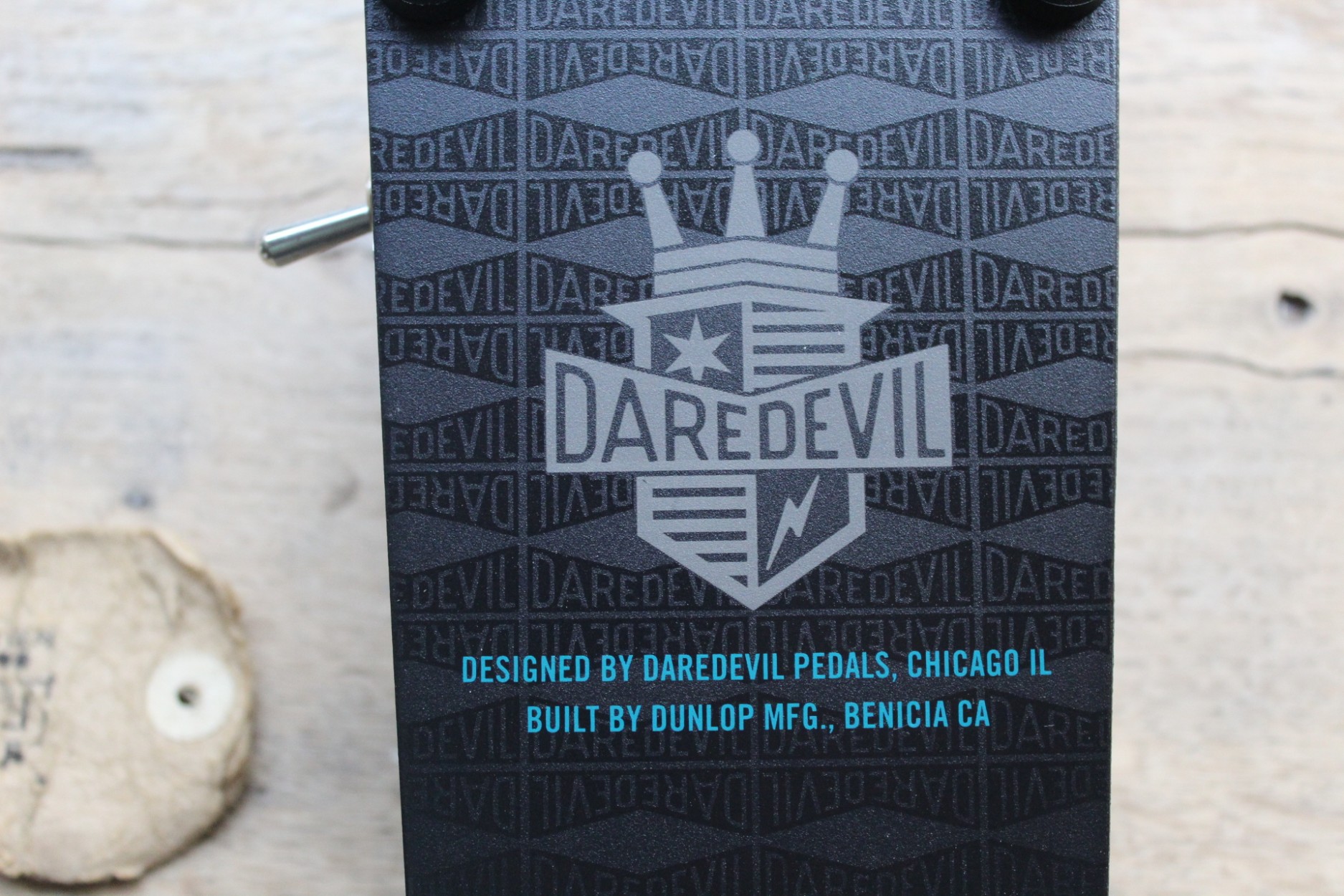 THE LONG STORY The Cry Baby Daredevil Fuzz Wah fuses the sweet and expressive voice of a modded Cry Baby Wah with a gnarly custom fuzz circuit for a full palette of raw and aggressive tones. This pedal’s origin lies in Daredevil proprietor and builder Johnny Wator’s love for classic vintage circuits and the desire to create bold new sounds. Inspired by his personal wah-wielding guitar heroes, Johnny fine-tuned this circuit over several years, building them for friends and bandmates, before bringing it to Dunlop for consideration as a new addition to the lineup. The Cry Baby Daredevil Fuzz Wah is the resulting collaboration, and in true Daredevil fashion, it’s straight-forward and downright dirty. The only external control is a heavy-duty baseball bat switch to toggle the fuzz on and off. Removing the bottom plate reveals two more controls: one to set the pedal’s output when the fuzz is engaged and another to dial in your preferred level of fuzz nastiness. For instant lead tone, boost both the output and gain—in one step, you’re ready to rip. This fuzz wah is packed with killer old school tones and enough power to blow the whole dang room to pieces. It all comes in a special housing with a vintage crinkle finish base, a polished aluminum rocker top, and a custom design tread. Each one is hand built with thru-hole components and true bypass switching to round out this ode to full-frontal rock ’n’ roll.