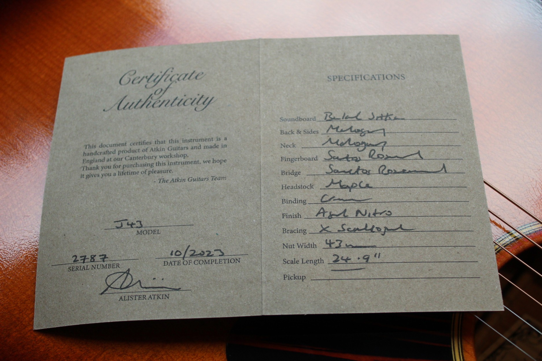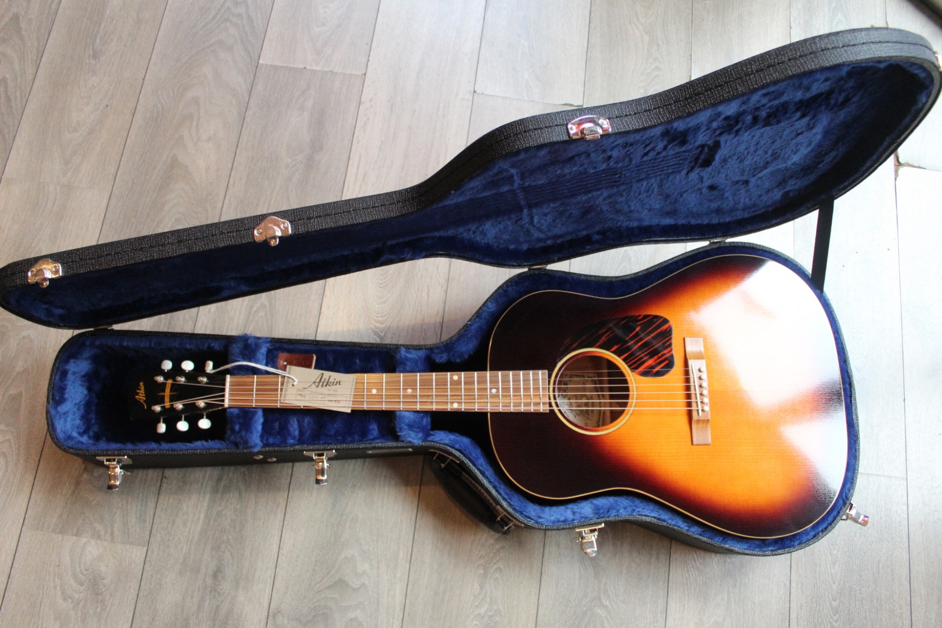 Atkin The Forty Three J43 Sunburst Heavy Aged The Forty Three is both direct and powerful, but with an easy-playing shorter scale length, easy to see why this guitar has been favoured by so many singer-songwriters over the years. The big-bodied slope shoulder shape, combined with the Baked Sitka spruce top and mahogany back and sides, delivers warm mids, solid lows and great definition. a timeless acoustic guitar tone. This Forty Three, with beautifully aged weatherchecked Sunburst finish, mahogany neck and Santos rosewood fingerboard and bridge has all the looks and feel of a real vintage guitar but plays like a new one. Specifications Brand and Condition Brand Atkin Condition New Hardware Bridge Pau Ferro Bridge String Spacing 56 mm - 2.2" Tuning Machines Kluson Vintage Style, Closed Back Body Body Shape Slope Shoulder Jumbo Finish Sunburst Body Width 408 mm - 16.06" Body Depth 119 mm - 4.69" Back and Sides Material Solid Mahogany Top Material Sitka Spruce Bracing Scalloped X-Bracing Body Details Cream Binding, Black/White/Black Rosette, Tortoise Pickguard Neck Neck Material Mahogany Neck Profile C Fingerboard Material Pau Ferro/ Santos Rosewood Fingerboard Radius 16" Neck Details Mother-of-Pearl Dot Inlay, Walnut Headstock Overlay Nutwidth 43 mm / 1.69" Scale Length 632 mm / 24.9"