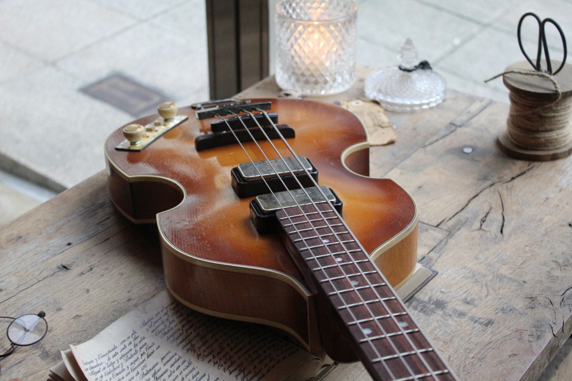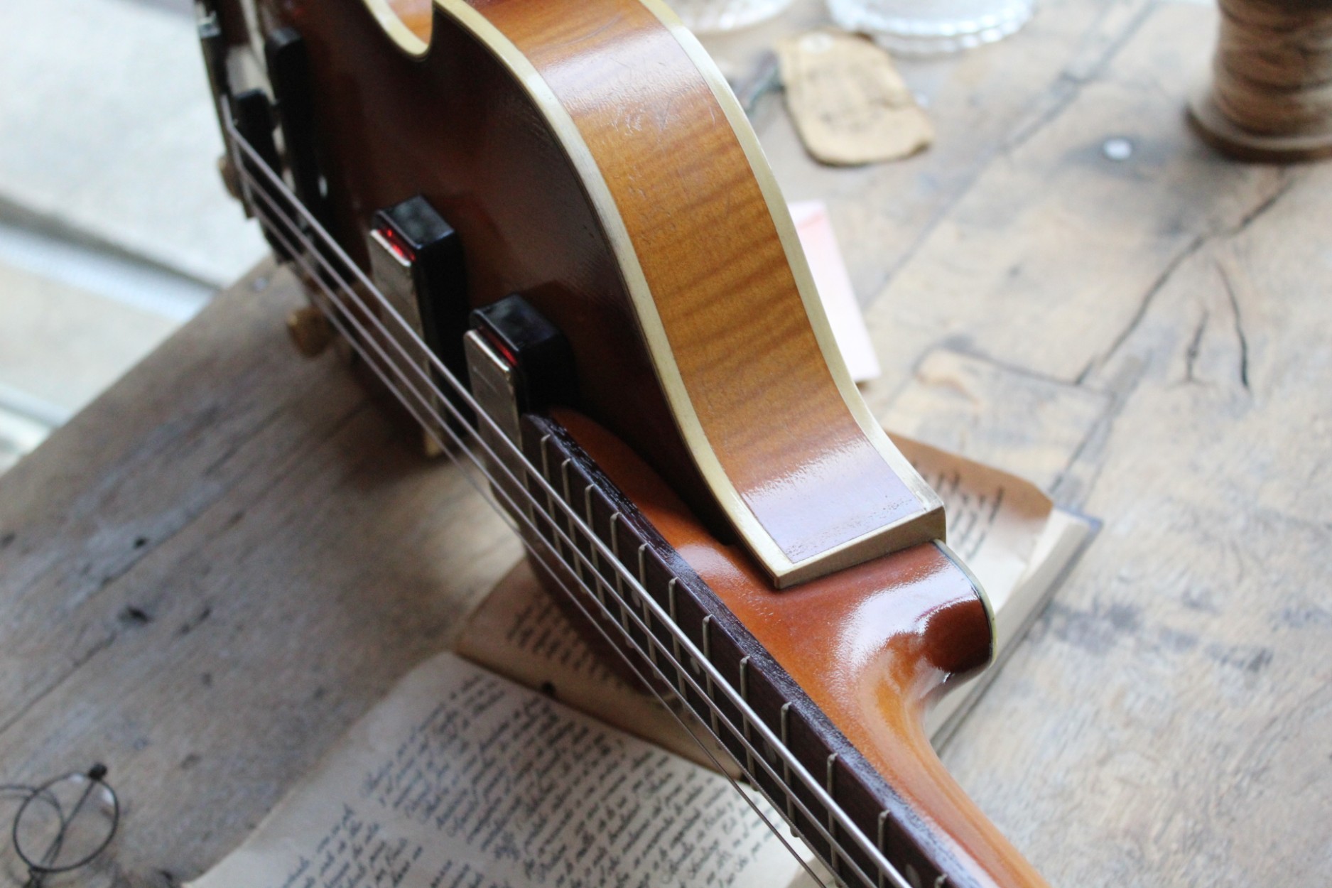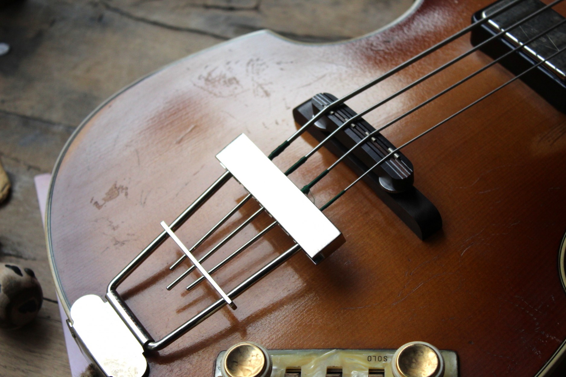 Höfner Violin Bass Relic Cavern '61 500/1-61-RLC inspired by Paul McCartney's '61 "Cavern" Violin Bass Sunburst Vintage Relic finish Spruce top Flame Maple back and sides 30" scale Flame Maple/Beech/Flame Maple Neck Rosewood fingerboard Pearl Dot inlays 22 frets Ebony bridge White Pearl (not mounted) pickguard Single Nickel "Rugby Ball" tuners Hofner Trapeze Nickel tailpiece Hofner Diamond Nickel neck and bridge pickups Hofner Pearl Panel electronics Hofner Flat Wound Strings