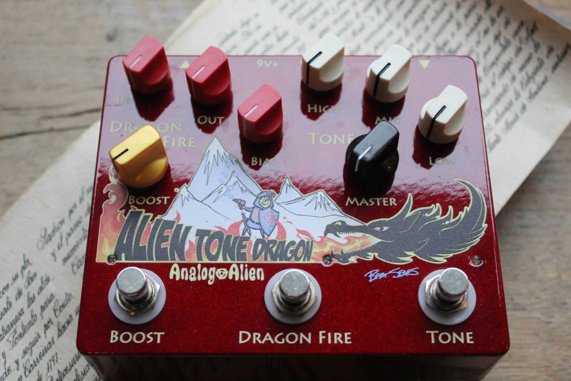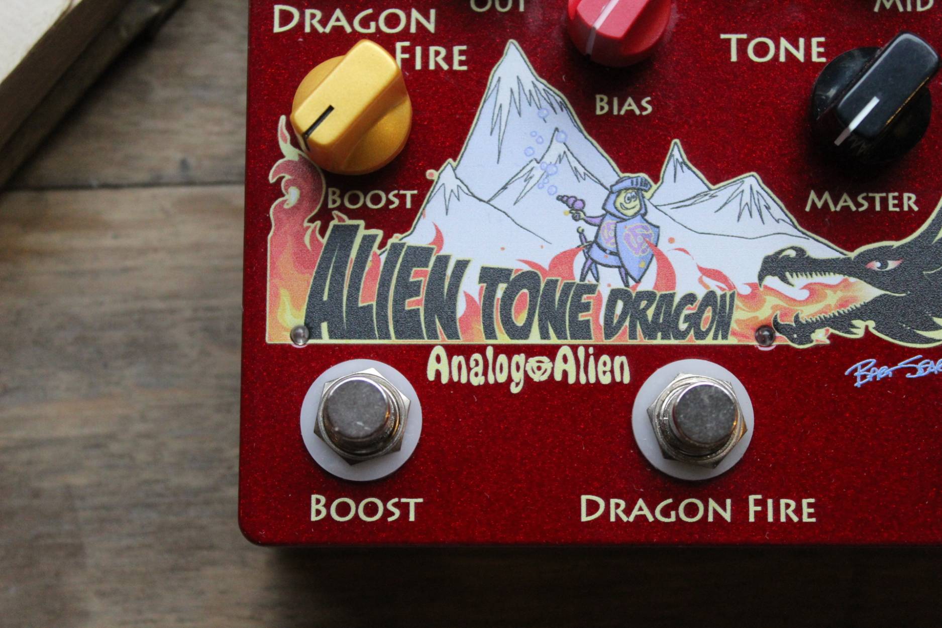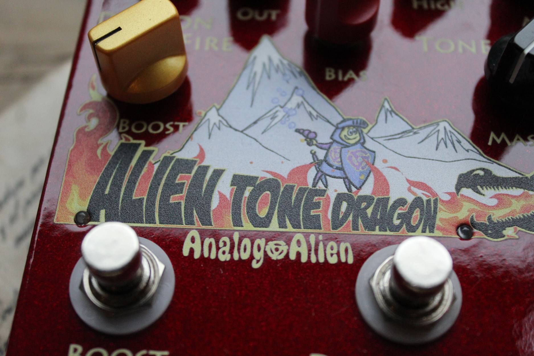 Three Stompbox Effects In One Cool Pedal That Will Make Your Guitar Roar! Add some Dragon Fire to your pedal board with the Analog Alien – Alien Tone Dragon (ATD)! Analog Alien Guitar Pedals have become known for combining multiple effects into one single pedal enclosure, and the Alien Tone Dragon proudly carries on that legacy. Use the Clean Boost to push your guitar pedals, restore unity gain to your pedal board, or make your amp go to 12! The Dragon Fire circuit can go from a full sonic wall of fiery fuzz to the hottest Rock/Blues overdrive you’ve ever heard, with just a few tweaks of its control knobs. Finally, shape your sound with a fully active, non over-lapping, 3 band tone circuit with master volume. You can use the 3 control knobs to easily sweep through the tone control until you find just the sound you’re looking for. Combine all 3 effects for a sonic tonal experience! The ATD will set your guitar on fire!