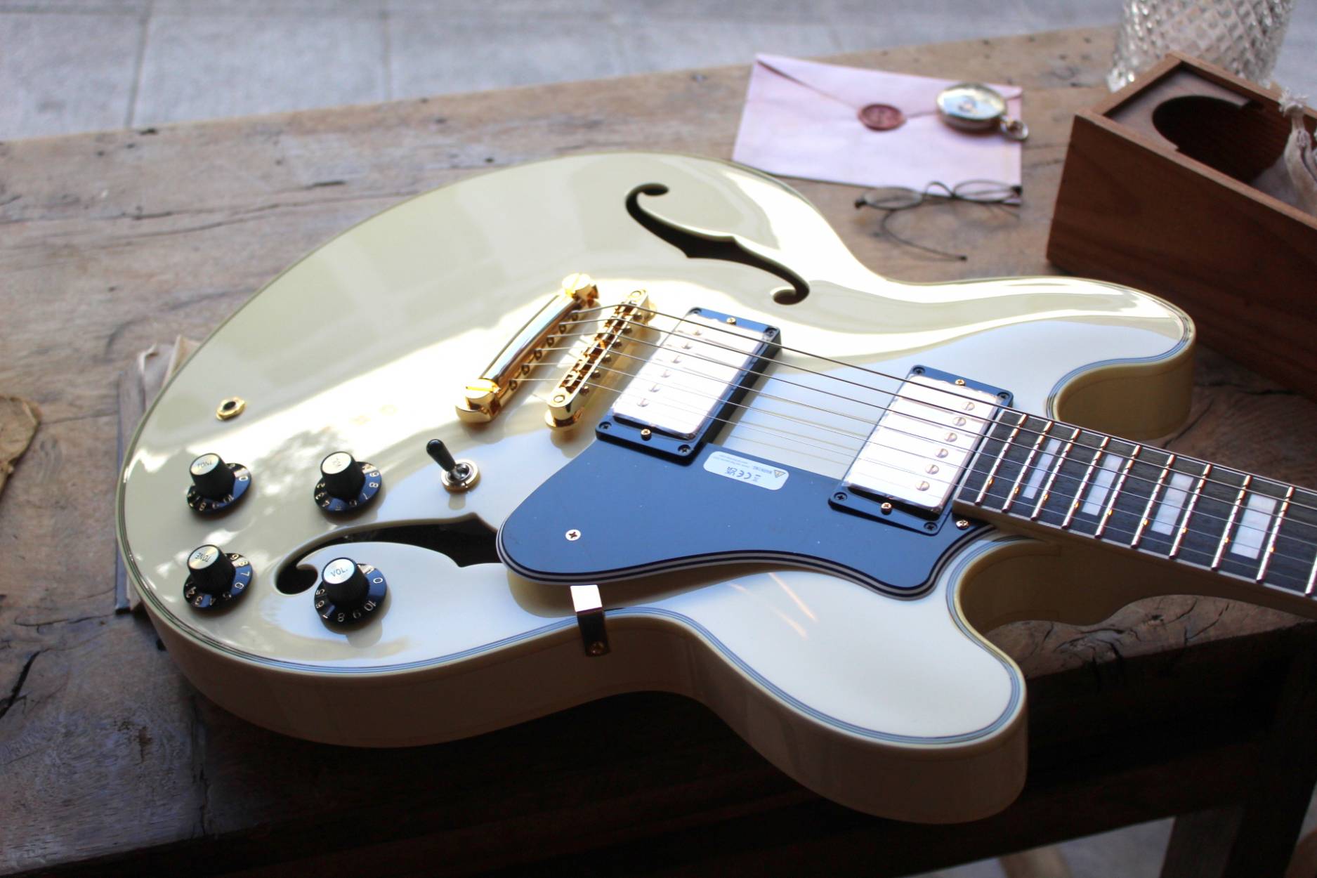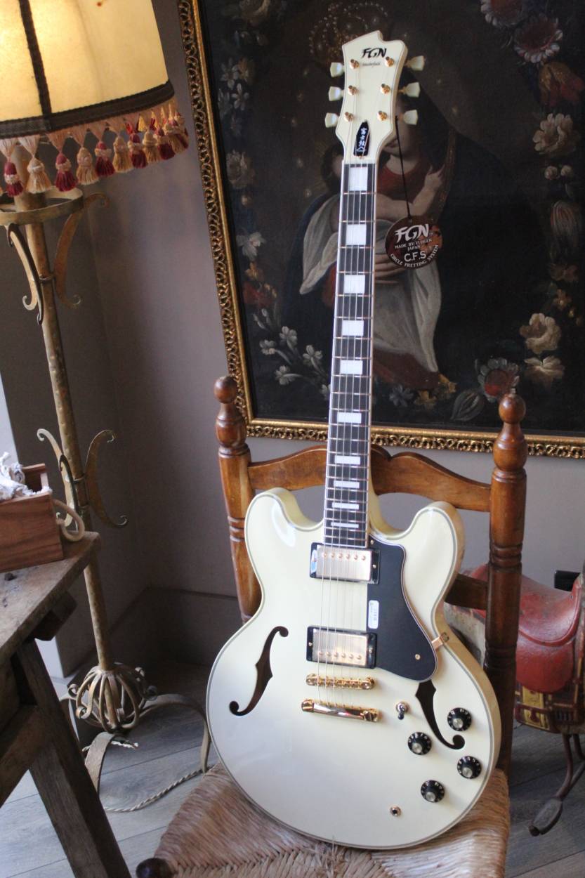 All FGN guitars and basses come with a unique Circle Fretting System (C.F.S.). It was created by FGN with the idea of offering better tone and articulation than conventional guitars and basses. All frets are installed on the fingerboard in a slightly curved fashion so that each string crosses all frets by 90 degrees, i.e. to offer minimal string contact at one fret, and makes the scale length of each string even when it really varies in conventional fretting. The C.F.S. it's a solution to fretting on a traditional guitar and bass, and offers clearer tones and articulation that add dimension when you're strumming a string and also cuts through the mix when you're playing single notes. compound radius fingerboard The compound radius fingerboard has a smaller (rounder) radius towards the nut, while a larger (flatter) radius towards the neck end, i.e. similar to the shape of a cone. upper registers. DATA SHEET Set-in Neck Construction (Glued) Maple top and backs and mahogany sides U-shaped Coba neck Fingerboard: Ebony Scale 24.75" (628mm) Frets 22F Medium C.F.S. Headstock: GOTOH® SD90-SL Bridge: GOTOH® GE104B Tailpiece: GOTOH® GE101A Hardware Color Gold Pickup (neck): FGN Alnico 3 Pickup (Bridge): FGN Alnico 3 Controls: 2 Volume, 2 Tone, 3-way Swich Body Finish Top Lacquer Low Gloss D'Addario EXL110 Strings (.010-.046) Color : AWHQ (Antique White) Accessories: Original Hard Case, Fret Guard