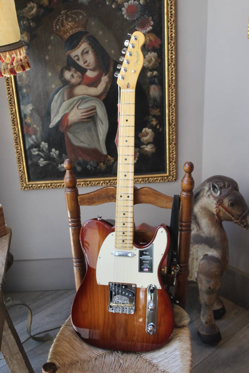 The American Professional II Telecaster® draws from more than seventy years of innovation, inspiration and evolution to meet the demands of today’s working player. Our popular Deep "C” neck now sports smooth rolled fingerboard edges, a “Super-Natural” satin finish and a newly sculpted neck heel for a supremely comfortable feel and easy access to the upper register. New V-Mod II Telecaster single-coil pickups are more articulate than ever while delivering the twang, snap and snarl that made the Tele famous. The new top-load/string-through bridge with compensated “bullet” saddles is our most comfortable, flexible Tele bridge yet – retaining classic brass-saddle tone and providing excellent intonation and flexible setup options, allowing you to tailor the tension and tone of each string to your liking. The American Pro II Telecaster delivers instant familiarity and sonic versatility you’ll feel and hear right away, with broad ranging improvements that add up to nothing less than a new standard for professional instruments. FEATURES Two V-Mod II single-coil Telecaster pickups New top-load/string-through Telecaster bridge with compensated brass “bullet” saddles Deep "C”-shaped neck profile with rolled fingerboard edges Bone nut; 22 narrow-tall frets for easy bending Treble bleed circuit maintains highs when reducing volume Includes Deluxe Molded hardshell case