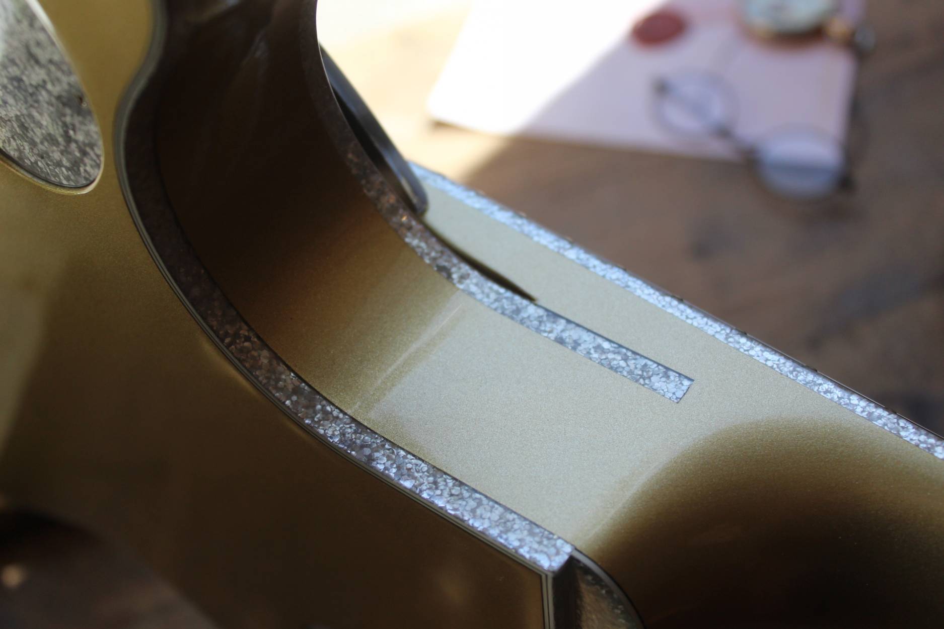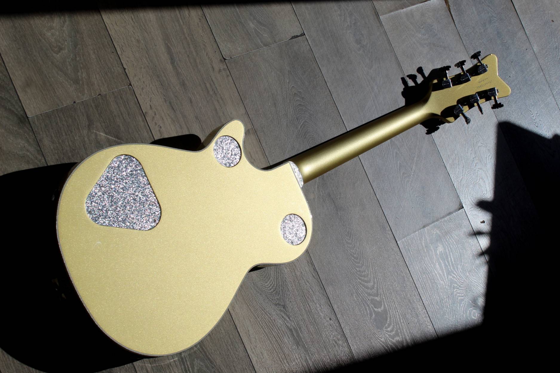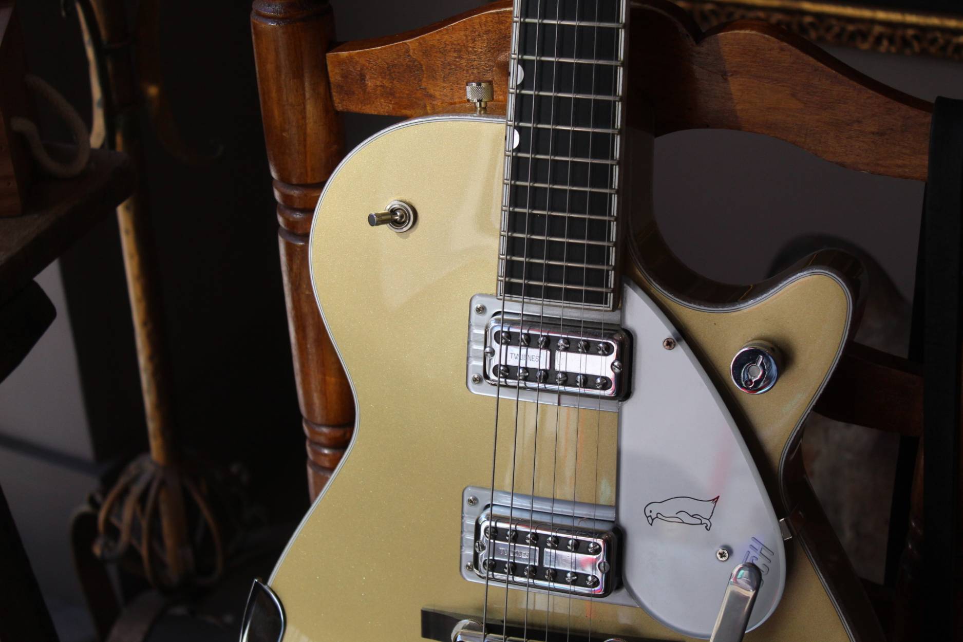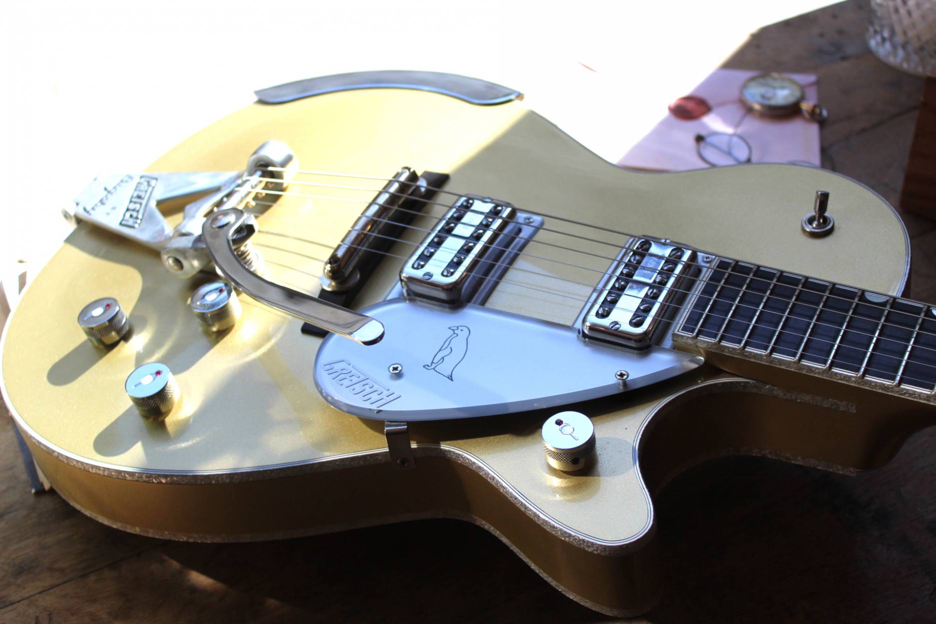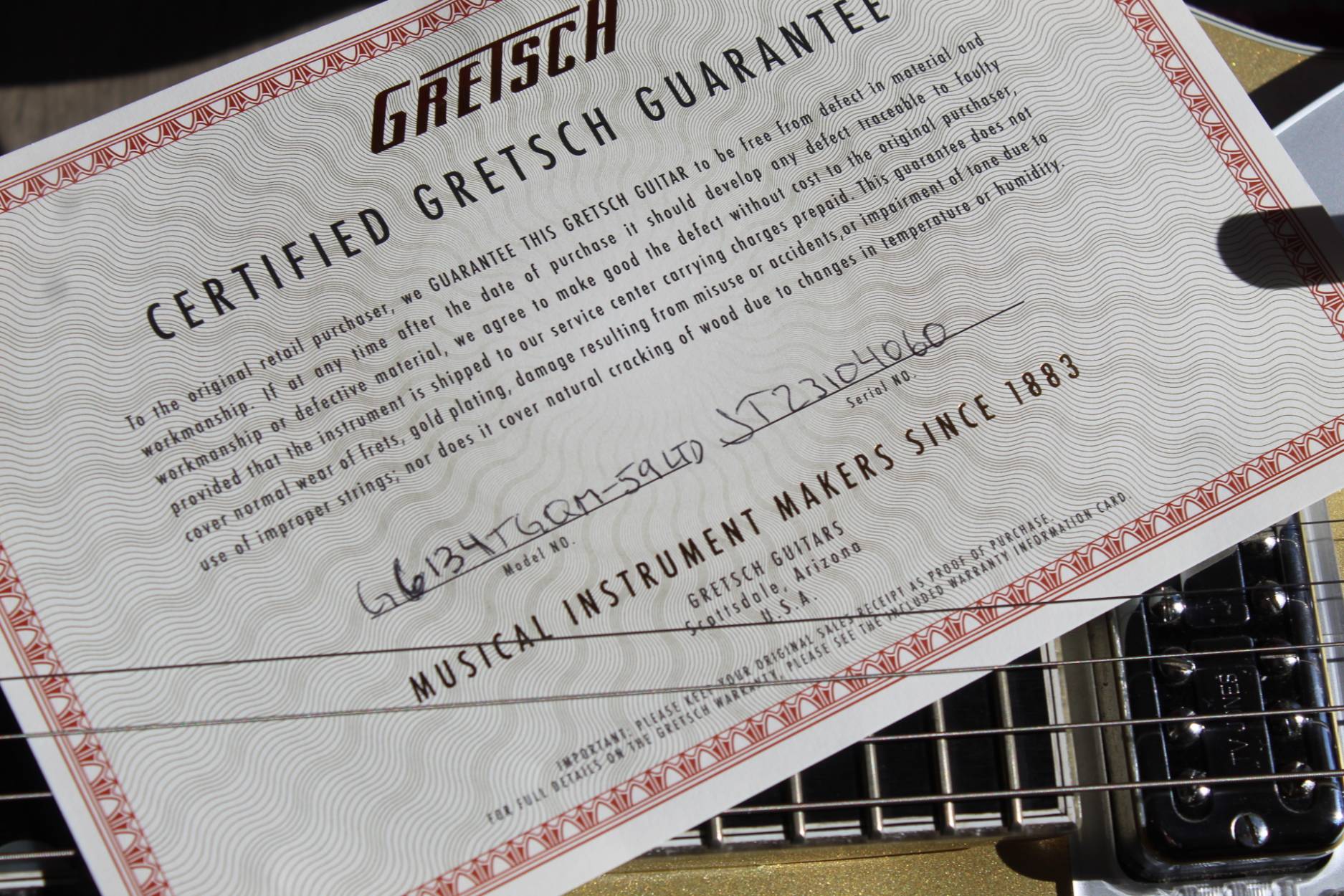 The richly appointed G6134T Limited Edition Penguin™ with Bigsby® takes Gretsch’s rarest bird and decks it out in a flashy Casino Gold finish, complemented by a matching headstock, glittering silver sparkle binding with white/black/white purfling and chrome hardware (including a banjo arm rest). The chambered mahogany single-cutaway body magnifies harmonic richness by letting air resonate between the maple top and body for livelier and more articulate tone. Dual TV Jones® TV Classic pickups deliver pure Gretsch power, with “Squeezebox” paper-in-oil capacitors under the hood for even smoother vintage tone. The G6134 also includes a no-load tone control for smoother tonal taper while unleashing full-throttle Filter’Tron™ power, and a Bigsby® B3C vibrato tailpiece. Premium features include: Casino Gold finish with matching headstock and chrome hardware Chrome banjo arm rest Silver sparkle binding with white/black/white purfling Single-cutaway chambered mahogany body with maple top Maple neck Bound 12”-radius ebony fingerboard with 22 medium jumbo frets and Neo-Classic™ thumbnail inlays Dual TV Jones® TV Classic pickups Squeezebox paper-in-oil capacitors and no-load tone control Bigsby® B3C vibrato tailpiece Pinned rocking bar bridge, bone nut and Grover® Imperial™ locking tuners Model Number2400509879SeriesLimited EditionFamilyColorNumber of Strings6OrientationBuildBody FinishGlossBody ShapePenguin™Body MaterialMahoganyBracingBody BindingSilver Sparkle with W/B/W/B PurflingBody BackMahoganyBody TopMapleBody Depth1.85" (47 mm) Neck MaterialMapleNeck FinishGloss UrethaneNeck ShapeStandard "U"Neck BindingSilver Sparkle with W/B/W PurflingScale Length24.6" (625 mm)Fingerboard Radius12" (305 mm)Fingerboard MaterialEbonyNumber of Frets22Fret SizeMedium JumboNut Width1.6875" (42.86 mm)Position InlaysNeo-Classic™ ThumbnailNeck PlateNone Bridge PickupTV Jones® Filter'Tron™ ClassicNeck PickupTV Jones® Filter'Tron™ ClassicControlsVolume 1. (Neck Pickup), Volume 2. (Bridge Pickup), Master Volume, Master TonePickup Switching3-Position Toggle: Position 1. Bridge Pickup, Position 2. Bridge And Neck Pickups, Position 3. Neck PickupPickup Configuration