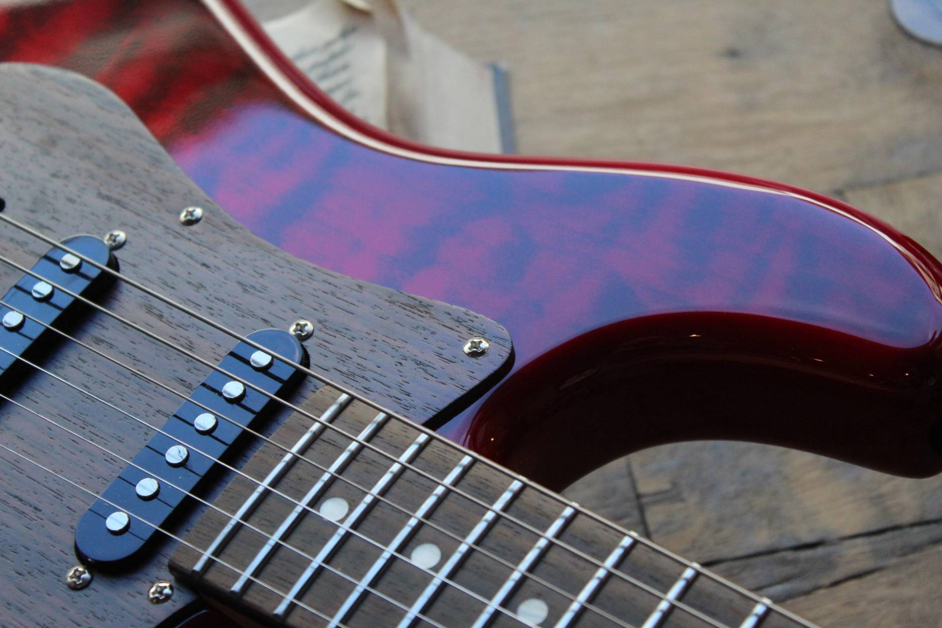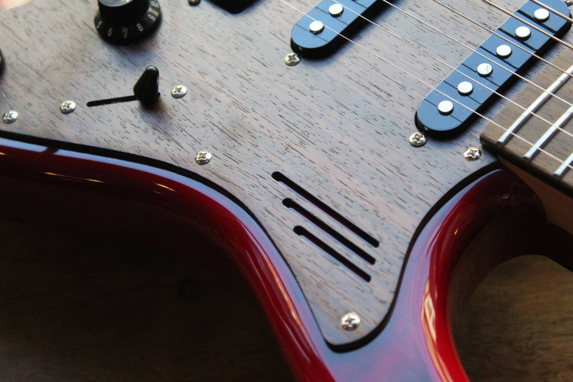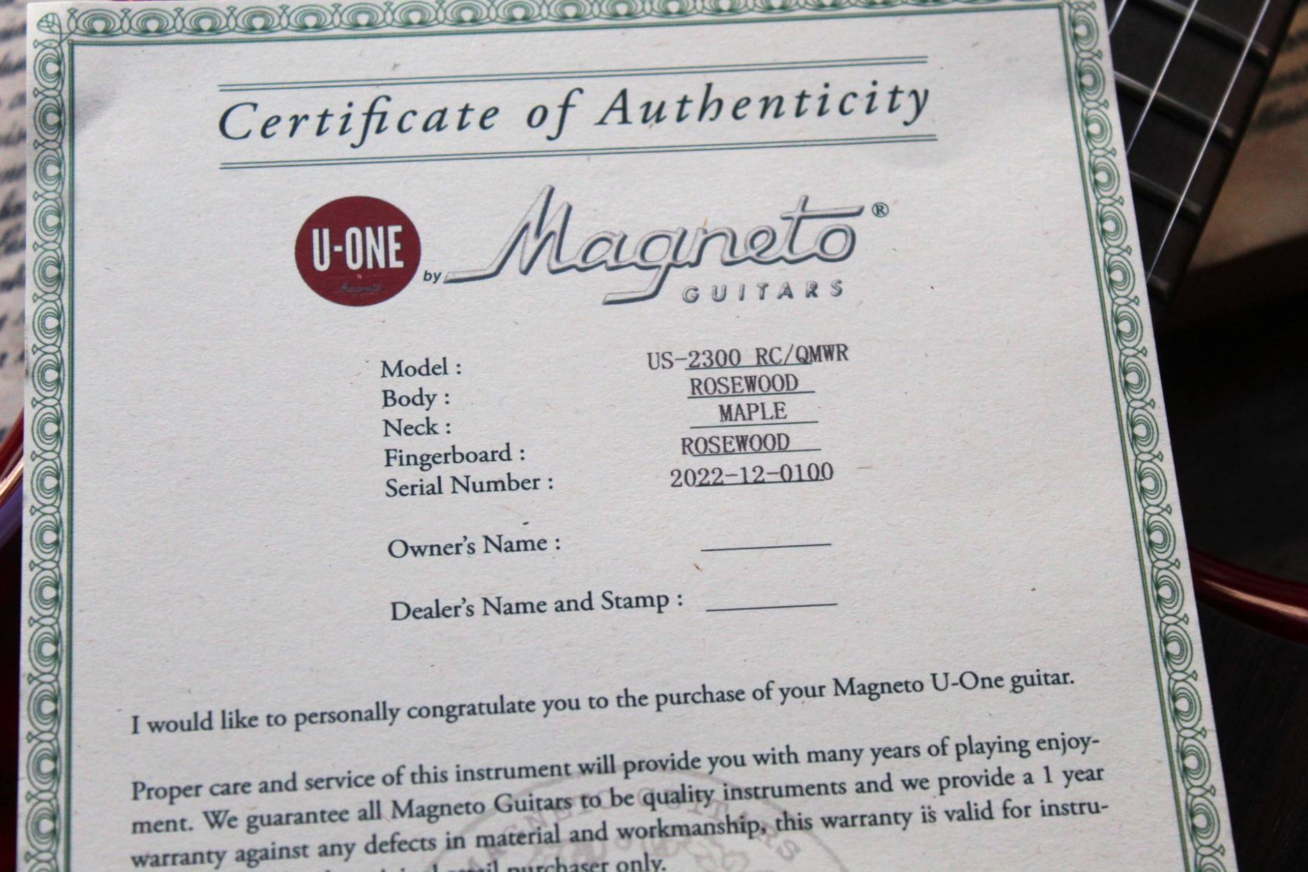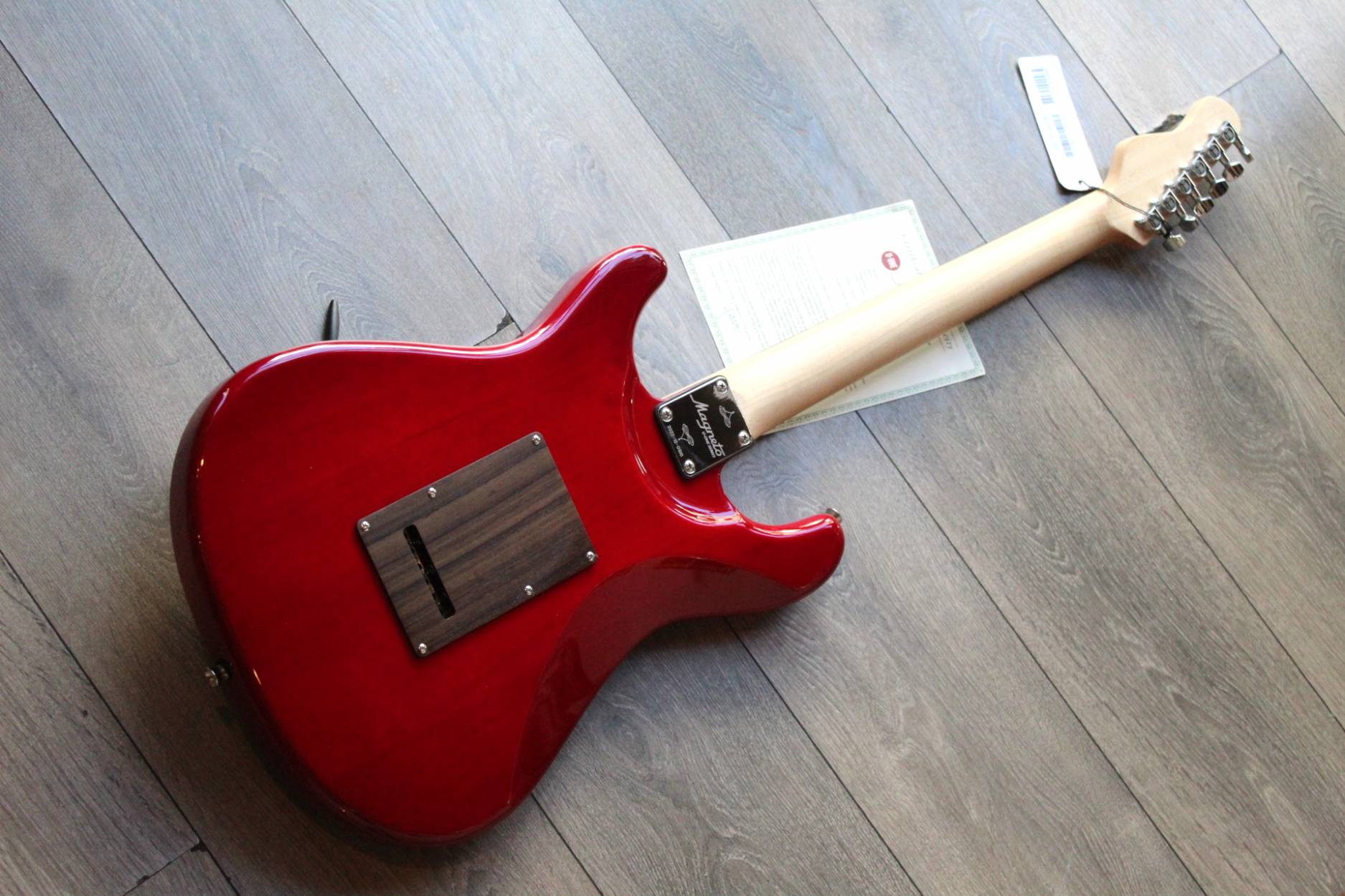 Sonnet Modern US-2300 The Sonnet US-2300 will meet the needs of the musician who is looking for a versatile instrument with great looks. The Basswood body gives the instrument that classic sound, it is embellished by a Figured Maple top and a wooden pickguard. The humbucking pickup in the bridge position adds fatness when it‘s time for your solo! SPECIFICATIONS BODY Body Wood: Basswood, 2-Piece with figured veneer top Finish: Polyurethane Pickguard: Finished Wood NECK Neck Wood: Hard Rock Maple Headstock: Magneto Sonnet Headstock Finish: Satin Polyurethane Fingerboard: East Indian Rosewood Scale length: 648mm / 25 ½” Nut Material: Synthetic Nut Width: 42 mm / 1.650” Frets: Jumbo Style Fret Nr.of Frets: 22 frets Neck Profile: Medium C Shape Radius: 12” / 305mm Radius Neck Heel: Tapered Truss Rod: Double Truss Rod Truss Rod Nut: Classic Top Loaded System HARDWARE Bridge: Classic Tremolo Tuners: Magneto Tuners String Retainer: Vintage Style for E and B String, + G and D string Neckplate: Standard Hardware Finish: Chrome ELECTRONIC PARTS Pickups: Magneto Calibrated Set Pickup Switch: 5 Position Switch Switching: Standard 5-way Controls: Volume, Tone Pots: Audio Taper Pots Output Jack: Mono Jack STRINGS: 009-042 CASE: Magneto Bag ACCESSORIES: Tremolo Arm Allen Wrench for Bridge Adjustments, Neck Adjustment Pin