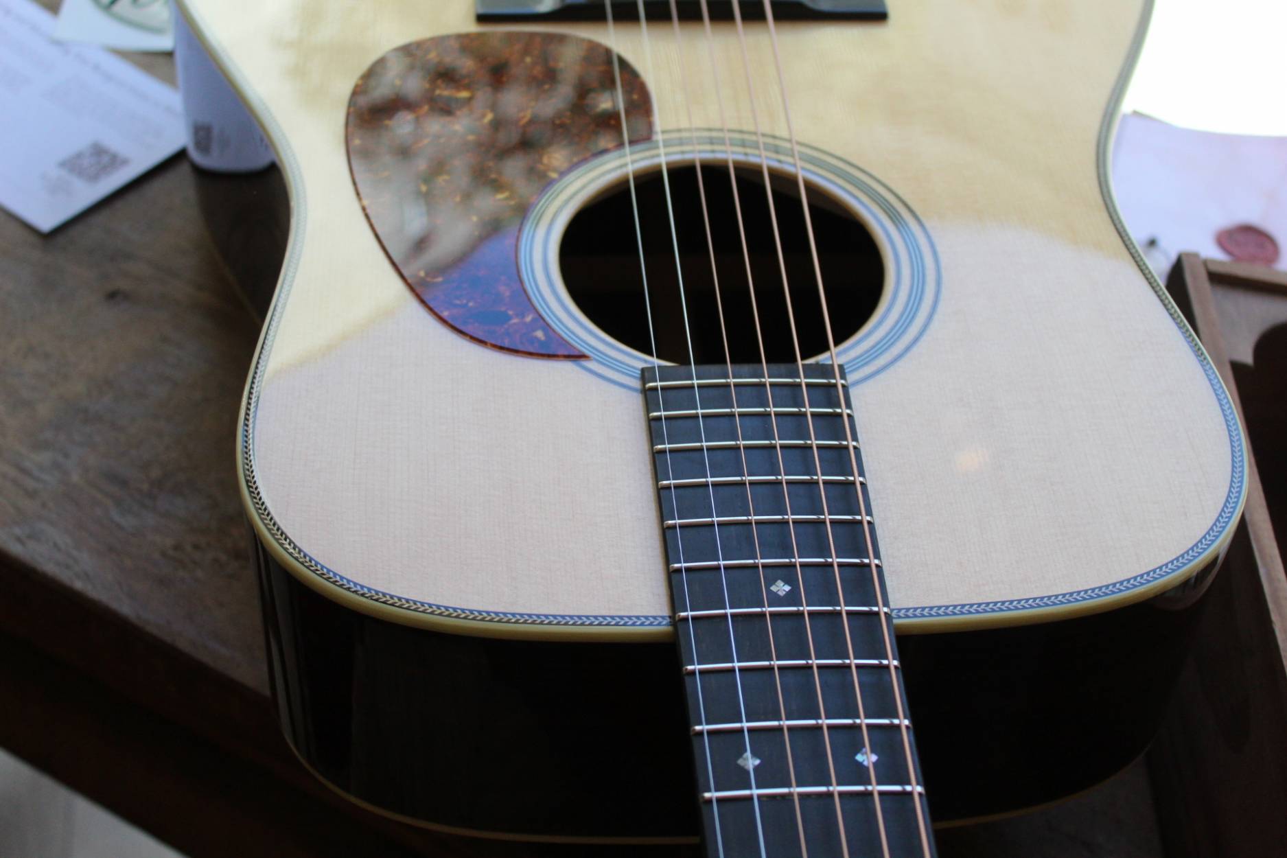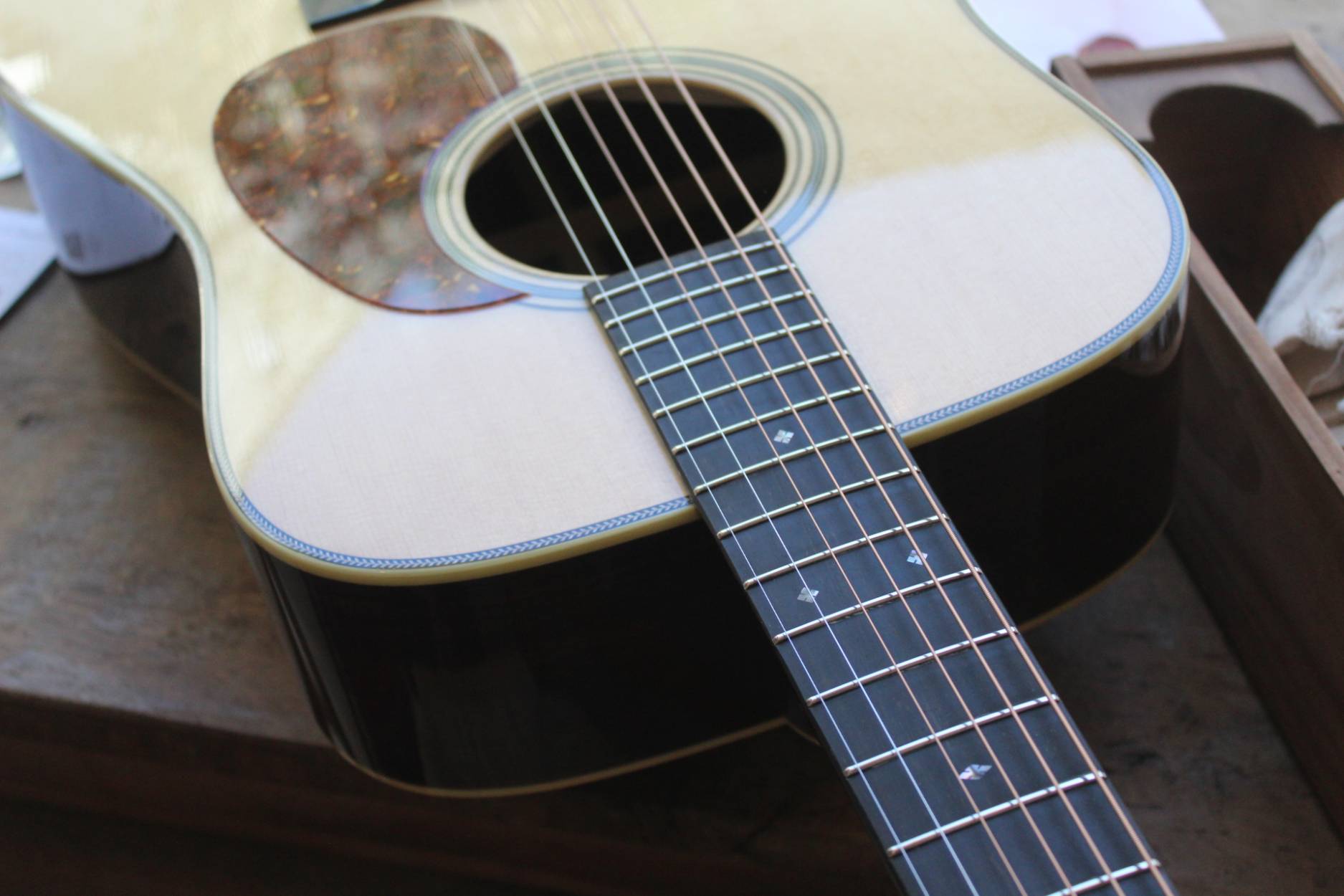 VINTAGE/TS Available as Dreadnought or OM SOUNDBOARD Alaskan Sitka Spruce BACK & SIDES Indian Rosewood NECK 14 Fret Mahogany FINGERBOARD Ebony SCALE LENGTH 25.5” NUT WIDTH 1 23/32” – bone SADDLE 2.2” – bone TUNERS Schaller Grand Tune Nickel BRIDGE Ebony with Ivoroid Pins FINISH High Gloss BRACING Adirondack Spruce