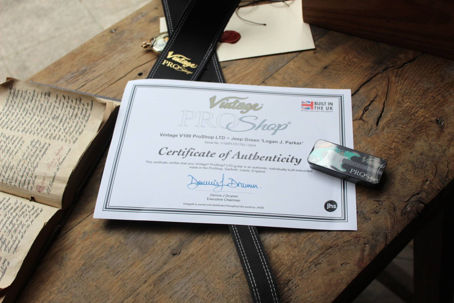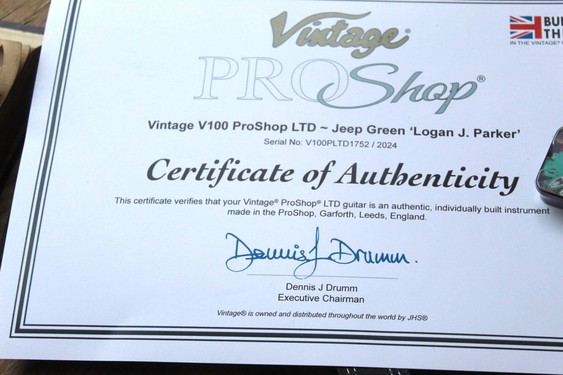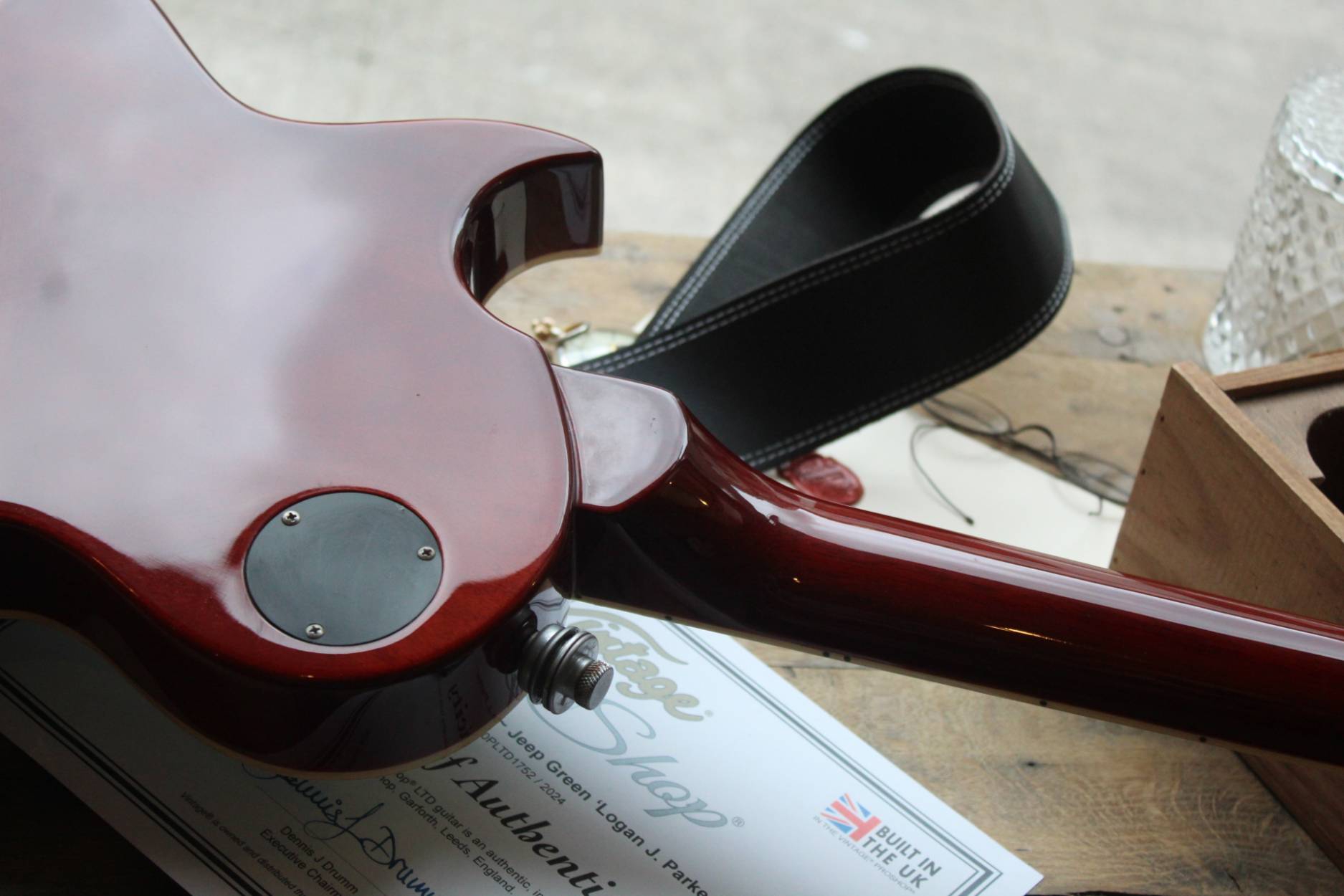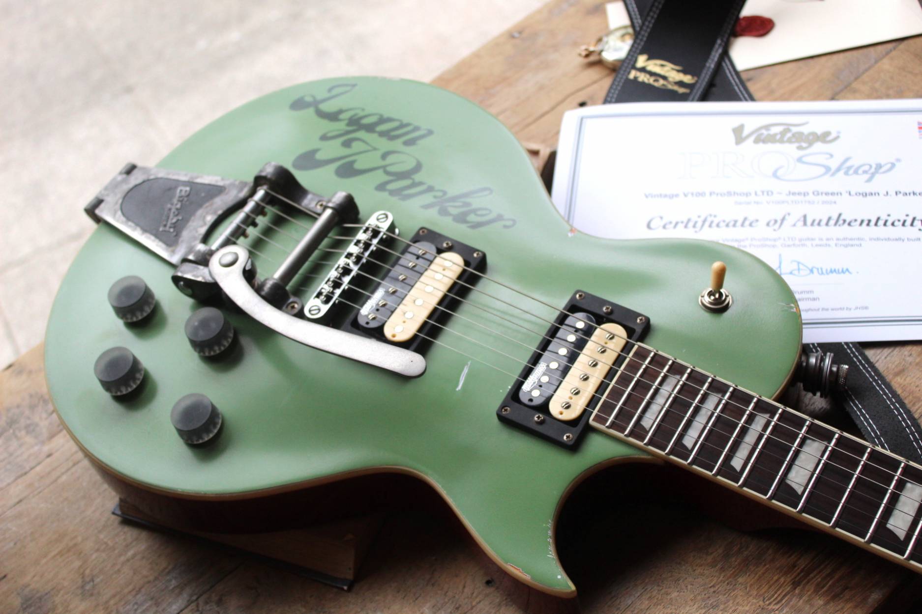 The Vintage ProShop Logan J Parker started life as the classic Vintage ReIssued V100AMB, having now been through the hands of the world famous Vintage team of skilled luthiers. With a beautiful ‘Jeep Green’ cellulose finish and Logan's very own signature decal on the offset V100 body with cream body binding, black control knobs and aged aluminium Bigsby B70 vibrato, this gorgeous single cutaway, does indeed evoke an enormous amount of individual style and class. For that subtle ‘driven in’ theme the top lacquer coat and all hardware have been given a subtle aged hue, the way only the Vintage team know how, whilst under the hood, the construction, tonal characteristics and playability that have made the original V100 a best-seller in itself, still remain. These include a solid carved mahogany body, with a graceful descending bass side shoulder and an ingeniously-designed offset heel providing improved access to the upper reaches of the fretboard. With a bound mahogany body, mahogany neck and bound rosewood fingerboard, the Vintage ProShop Logan J Parker offers superior playability and the perfect tonewood combination that’s enhanced by a pair of uncovered Wilkinson MVHZ Double Coils provide this iconic looking electric guitar with enough power to handle any high-gained situation. Includes ProShop Set-Up: Fret-level, crown and polish. Fingerboard dress and comfort treatment. Truss rod adjustment and set. Action height, radius, intonation and pickup height adjustment. Nut slot regulation. Specifications: Finish: Re sprayed Jeep Green with cellulose top coat, subtle aging applied. Body: Solid carved Mahogany body provides resonance, tone and ‘correct weight’ comfort and features a unique, evolutionary body shape, with a graceful descending bass side shoulder and an ingeniously-designed offset heel providing improved access to the upper reaches of the fretboard. Bridge: Wilkinson T.O.M. bridge enables fine-tuning of each string for superb intonation all over the fretboard. Vibrato tailpiece: Bigsby B70 constructed from die cast aluminium, for maximum sustain and superior tonal quality. Pickups: Pair of uncovered Wilkinson MVHZ Double Coils for raw power. Controls: Twin master Volume and Tone controls with three-way pickup selector switch. Machine heads: Wilkinson WJ44 machine heads provide simple, effective action for maximum tuning stability. Neck: One piece Mahogany with classic Vintage ‘soft C’ profile for instant comfort, speed, accuracy and great feel. Fingerboard: Rosewood for outstanding tonal transfer, responsiveness and durability with a traditional 12" radius for superb playability and feel. Scale Length: 24.75" / 628mm. Frets: 22 Medium Jumbo profile frets add to comfort, accuracy and overall positive feel of the Vintage V100. Nut: 43mm Graphtech NuBone for smooth and friction-free string bending and tuning. Headstock: Classic Vintage headstock design for balance and visual appeal. The Vintage® ProShop™ V100 is an original Vintage® ReIssued Series™ guitar, reimagined by the UK Vintage ProShop team.