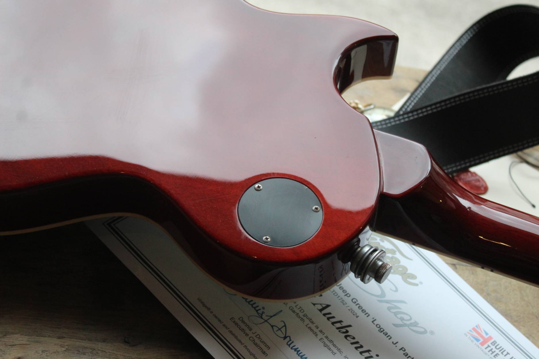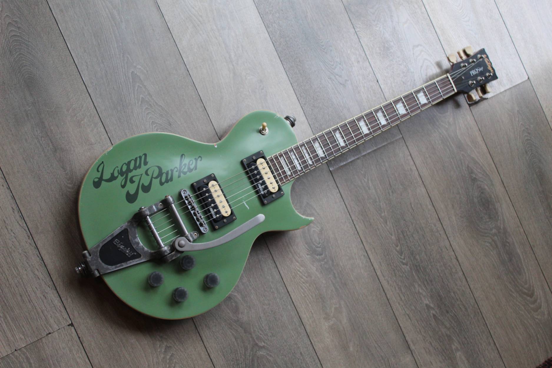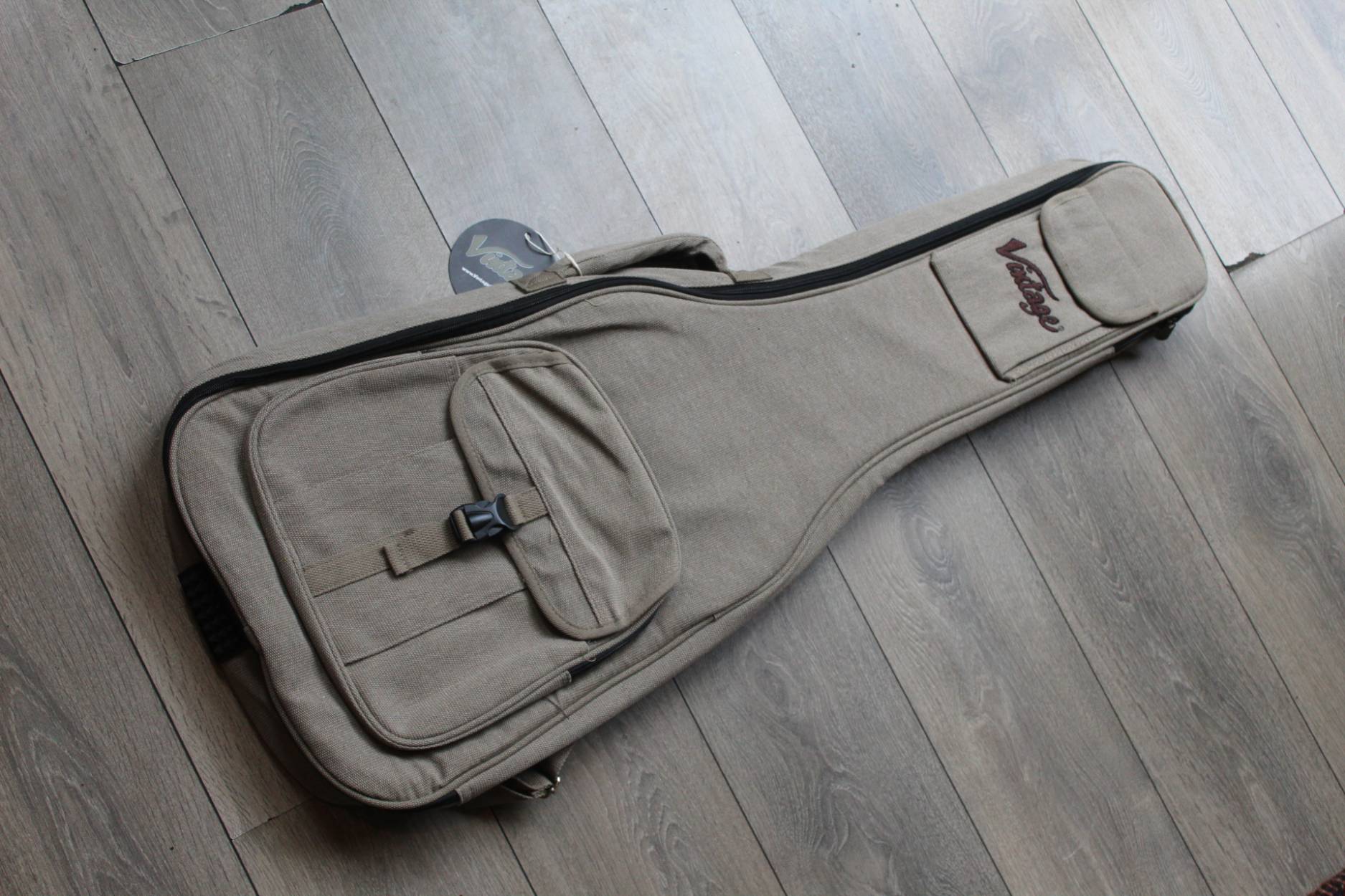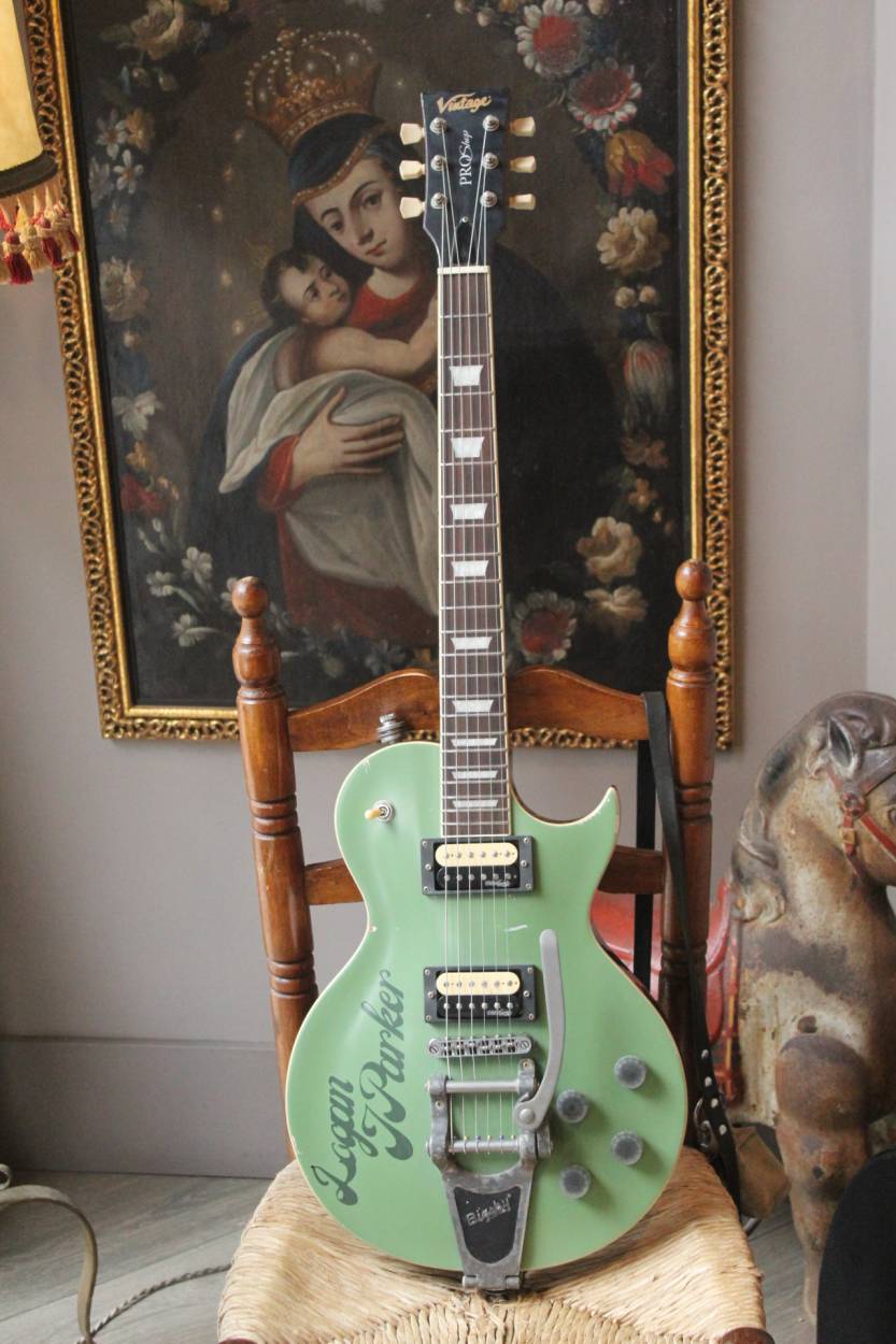 The Vintage ProShop Logan J Parker started life as the classic Vintage ReIssued V100AMB, having now been through the hands of the world famous Vintage team of skilled luthiers. With a beautiful ‘Jeep Green’ cellulose finish and Logan's very own signature decal on the offset V100 body with cream body binding, black control knobs and aged aluminium Bigsby B70 vibrato, this gorgeous single cutaway, does indeed evoke an enormous amount of individual style and class. For that subtle ‘driven in’ theme the top lacquer coat and all hardware have been given a subtle aged hue, the way only the Vintage team know how, whilst under the hood, the construction, tonal characteristics and playability that have made the original V100 a best-seller in itself, still remain. These include a solid carved mahogany body, with a graceful descending bass side shoulder and an ingeniously-designed offset heel providing improved access to the upper reaches of the fretboard. With a bound mahogany body, mahogany neck and bound rosewood fingerboard, the Vintage ProShop Logan J Parker offers superior playability and the perfect tonewood combination that’s enhanced by a pair of uncovered Wilkinson MVHZ Double Coils provide this iconic looking electric guitar with enough power to handle any high-gained situation. Includes ProShop Set-Up: Fret-level, crown and polish. Fingerboard dress and comfort treatment. Truss rod adjustment and set. Action height, radius, intonation and pickup height adjustment. Nut slot regulation. Specifications: Finish: Re sprayed Jeep Green with cellulose top coat, subtle aging applied. Body: Solid carved Mahogany body provides resonance, tone and ‘correct weight’ comfort and features a unique, evolutionary body shape, with a graceful descending bass side shoulder and an ingeniously-designed offset heel providing improved access to the upper reaches of the fretboard. Bridge: Wilkinson T.O.M. bridge enables fine-tuning of each string for superb intonation all over the fretboard. Vibrato tailpiece: Bigsby B70 constructed from die cast aluminium, for maximum sustain and superior tonal quality. Pickups: Pair of uncovered Wilkinson MVHZ Double Coils for raw power. Controls: Twin master Volume and Tone controls with three-way pickup selector switch. Machine heads: Wilkinson WJ44 machine heads provide simple, effective action for maximum tuning stability. Neck: One piece Mahogany with classic Vintage ‘soft C’ profile for instant comfort, speed, accuracy and great feel. Fingerboard: Rosewood for outstanding tonal transfer, responsiveness and durability with a traditional 12" radius for superb playability and feel. Scale Length: 24.75" / 628mm. Frets: 22 Medium Jumbo profile frets add to comfort, accuracy and overall positive feel of the Vintage V100. Nut: 43mm Graphtech NuBone for smooth and friction-free string bending and tuning. Headstock: Classic Vintage headstock design for balance and visual appeal. The Vintage® ProShop™ V100 is an original Vintage® ReIssued Series™ guitar, reimagined by the UK Vintage ProShop team.