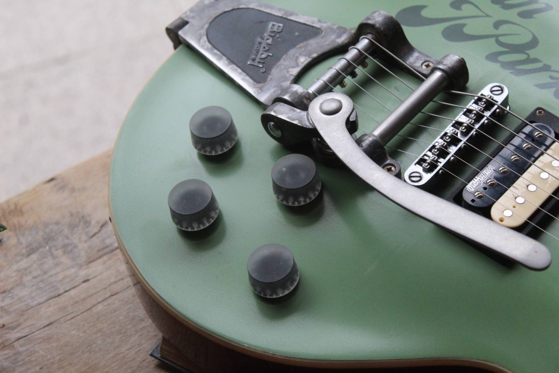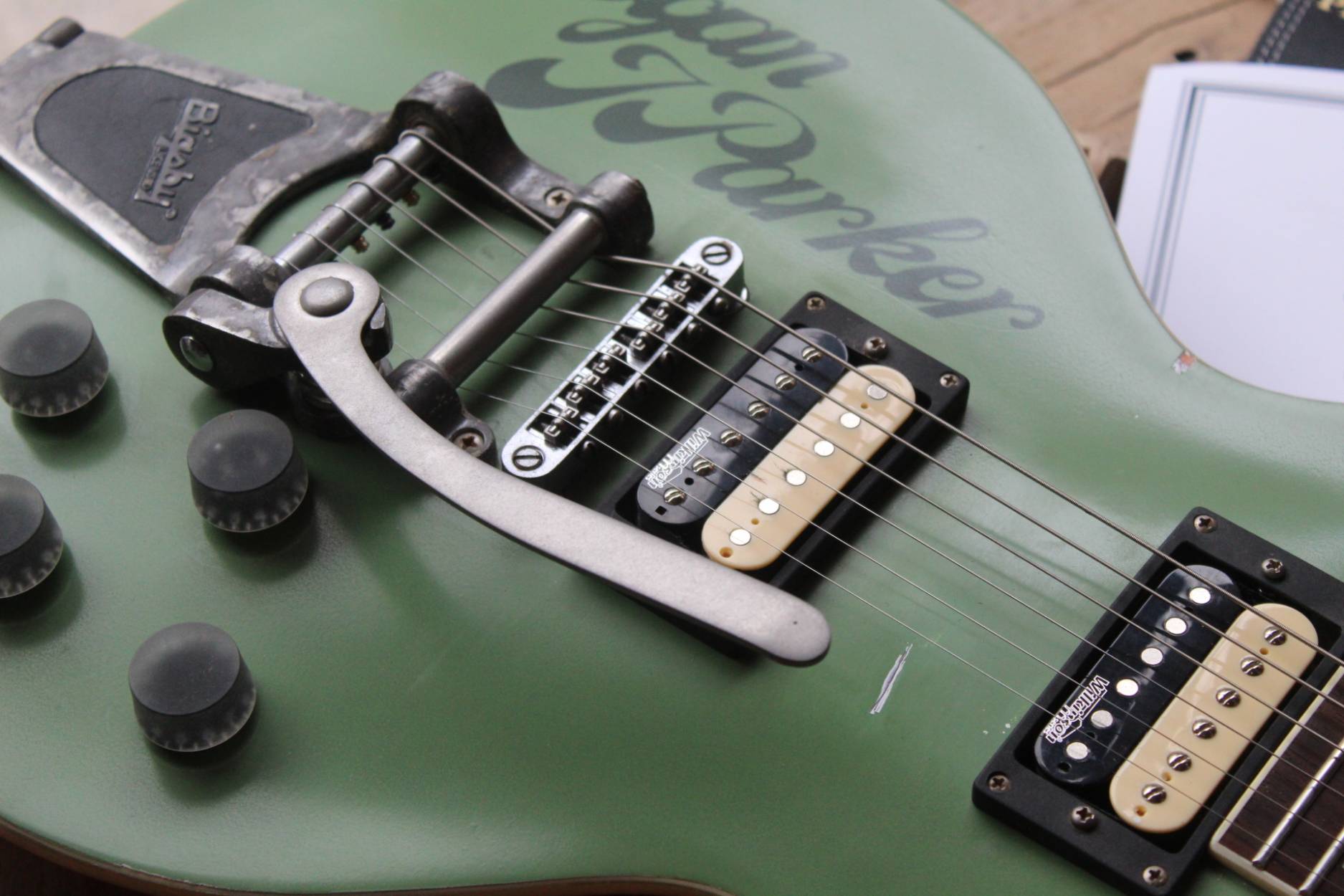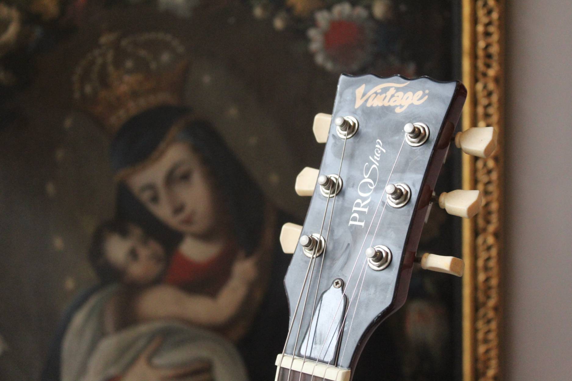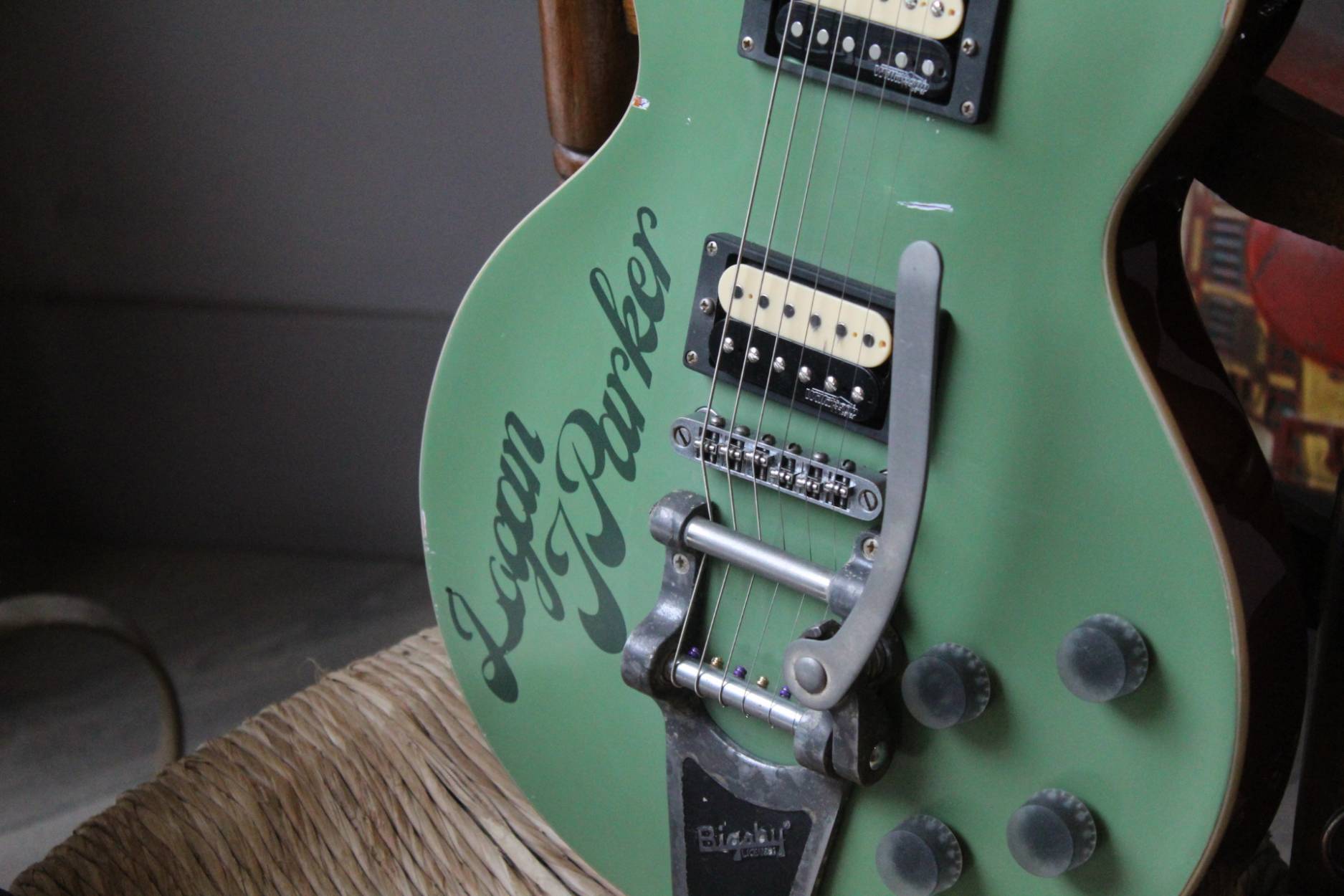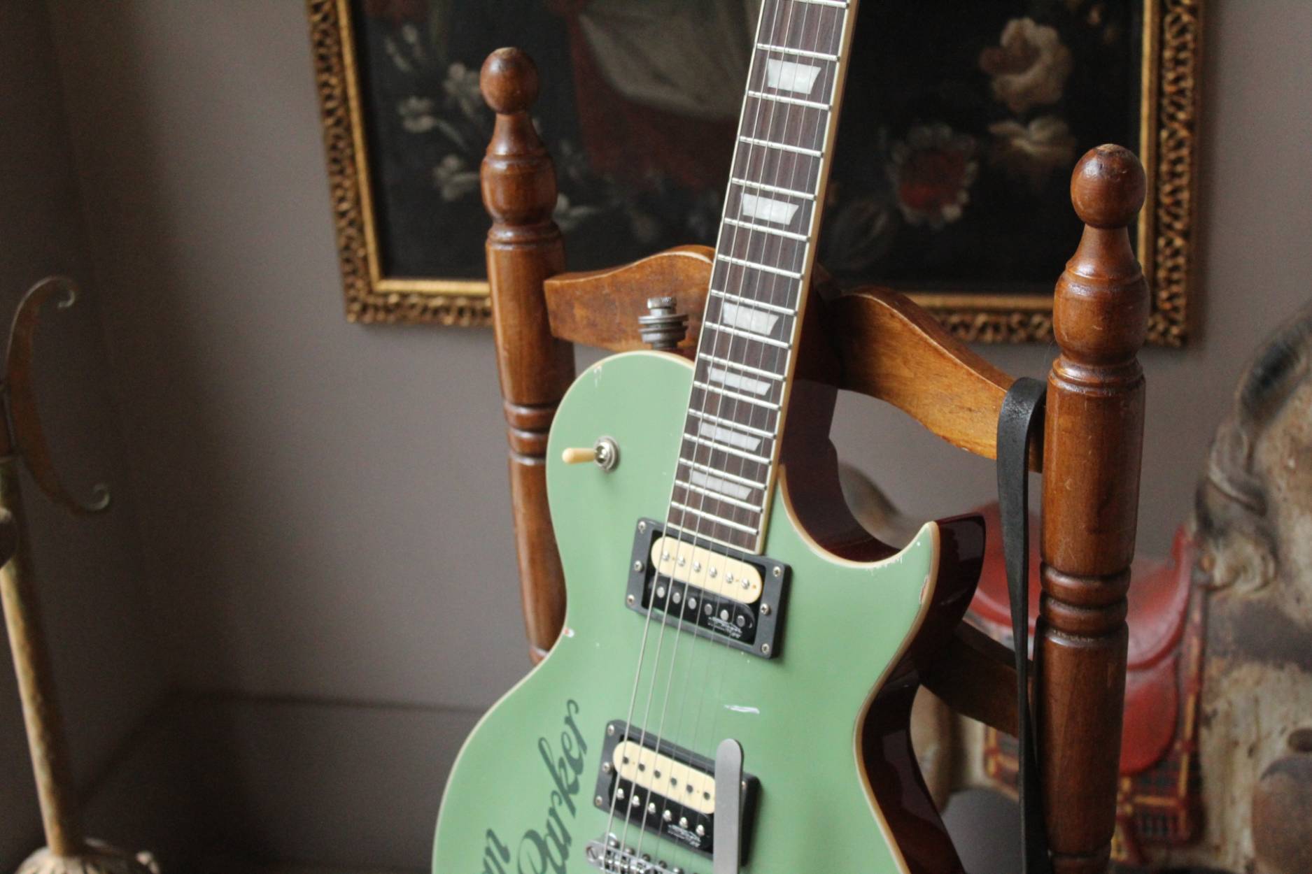 The Vintage ProShop Logan J Parker started life as the classic Vintage ReIssued V100AMB, having now been through the hands of the world famous Vintage team of skilled luthiers. With a beautiful ‘Jeep Green’ cellulose finish and Logan's very own signature decal on the offset V100 body with cream body binding, black control knobs and aged aluminium Bigsby B70 vibrato, this gorgeous single cutaway, does indeed evoke an enormous amount of individual style and class. For that subtle ‘driven in’ theme the top lacquer coat and all hardware have been given a subtle aged hue, the way only the Vintage team know how, whilst under the hood, the construction, tonal characteristics and playability that have made the original V100 a best-seller in itself, still remain. These include a solid carved mahogany body, with a graceful descending bass side shoulder and an ingeniously-designed offset heel providing improved access to the upper reaches of the fretboard. With a bound mahogany body, mahogany neck and bound rosewood fingerboard, the Vintage ProShop Logan J Parker offers superior playability and the perfect tonewood combination that’s enhanced by a pair of uncovered Wilkinson MVHZ Double Coils provide this iconic looking electric guitar with enough power to handle any high-gained situation. Includes ProShop Set-Up: Fret-level, crown and polish. Fingerboard dress and comfort treatment. Truss rod adjustment and set. Action height, radius, intonation and pickup height adjustment. Nut slot regulation. Specifications: Finish: Re sprayed Jeep Green with cellulose top coat, subtle aging applied. Body: Solid carved Mahogany body provides resonance, tone and ‘correct weight’ comfort and features a unique, evolutionary body shape, with a graceful descending bass side shoulder and an ingeniously-designed offset heel providing improved access to the upper reaches of the fretboard. Bridge: Wilkinson T.O.M. bridge enables fine-tuning of each string for superb intonation all over the fretboard. Vibrato tailpiece: Bigsby B70 constructed from die cast aluminium, for maximum sustain and superior tonal quality. Pickups: Pair of uncovered Wilkinson MVHZ Double Coils for raw power. Controls: Twin master Volume and Tone controls with three-way pickup selector switch. Machine heads: Wilkinson WJ44 machine heads provide simple, effective action for maximum tuning stability. Neck: One piece Mahogany with classic Vintage ‘soft C’ profile for instant comfort, speed, accuracy and great feel. Fingerboard: Rosewood for outstanding tonal transfer, responsiveness and durability with a traditional 12" radius for superb playability and feel. Scale Length: 24.75" / 628mm. Frets: 22 Medium Jumbo profile frets add to comfort, accuracy and overall positive feel of the Vintage V100. Nut: 43mm Graphtech NuBone for smooth and friction-free string bending and tuning. Headstock: Classic Vintage headstock design for balance and visual appeal. The Vintage® ProShop™ V100 is an original Vintage® ReIssued Series™ guitar, reimagined by the UK Vintage ProShop team.
