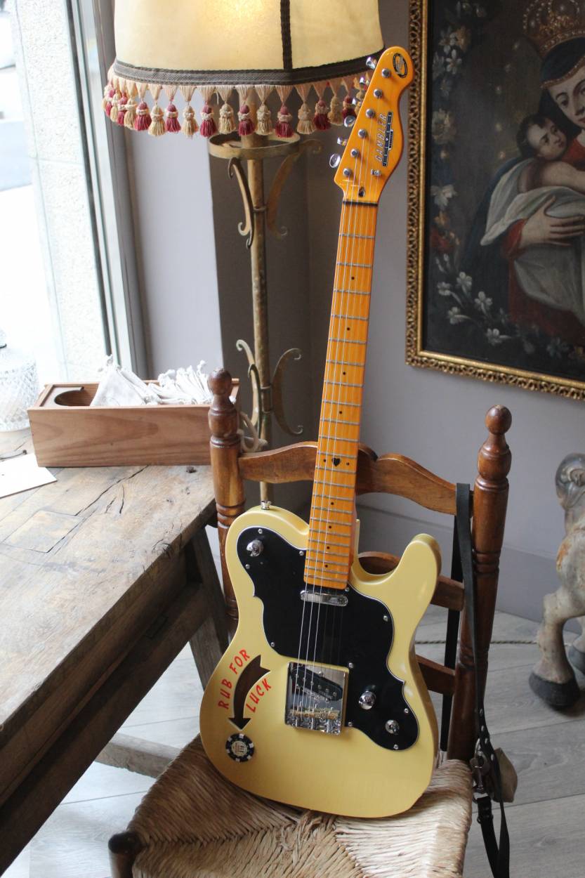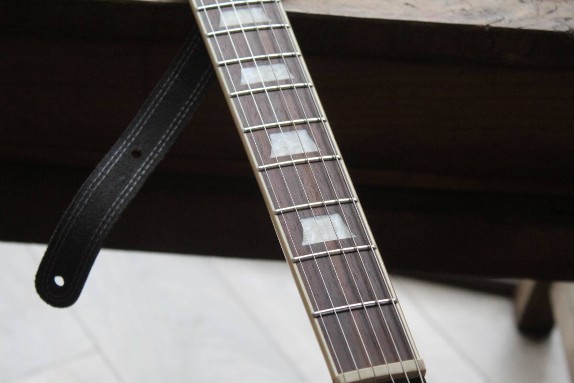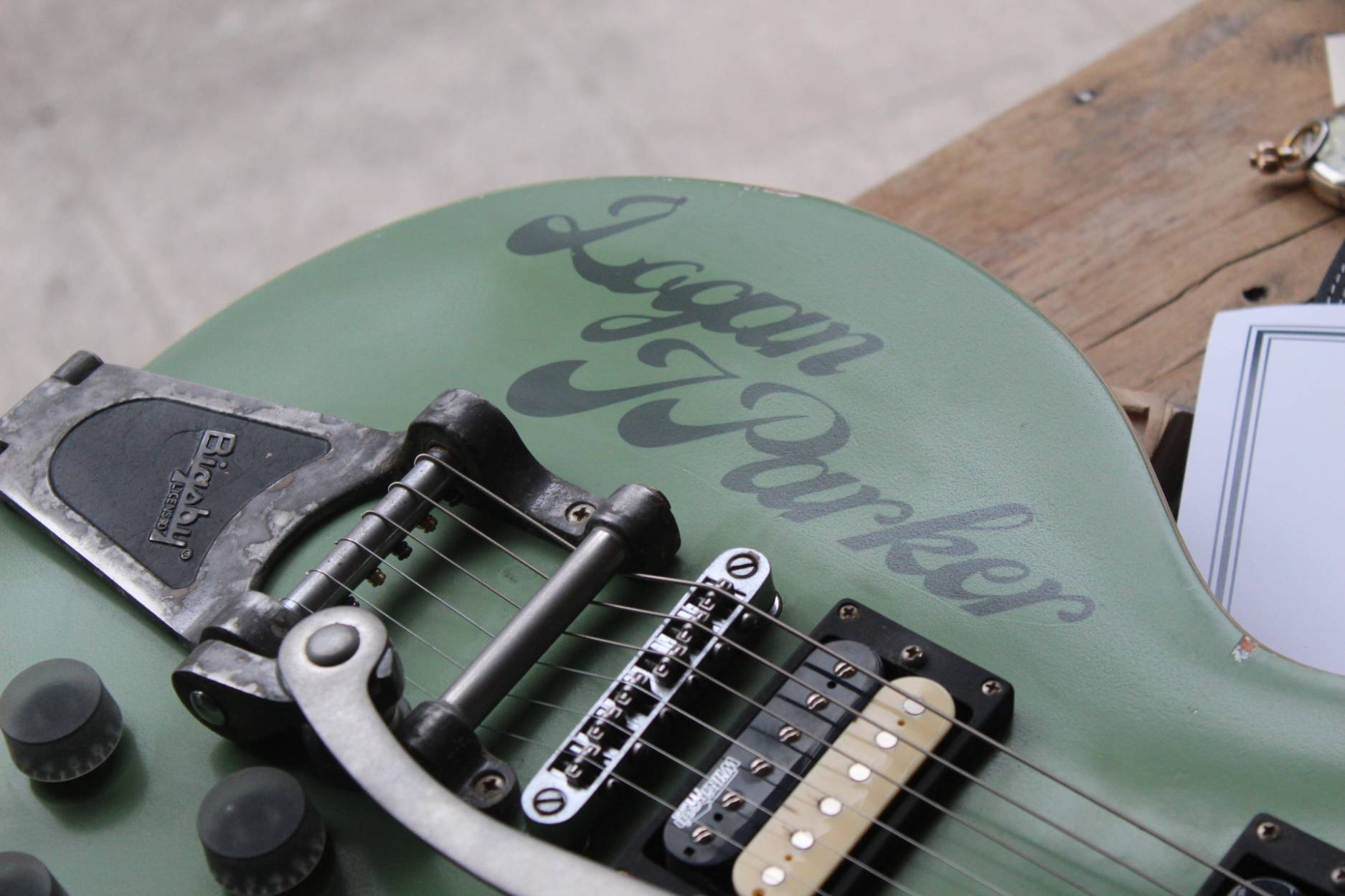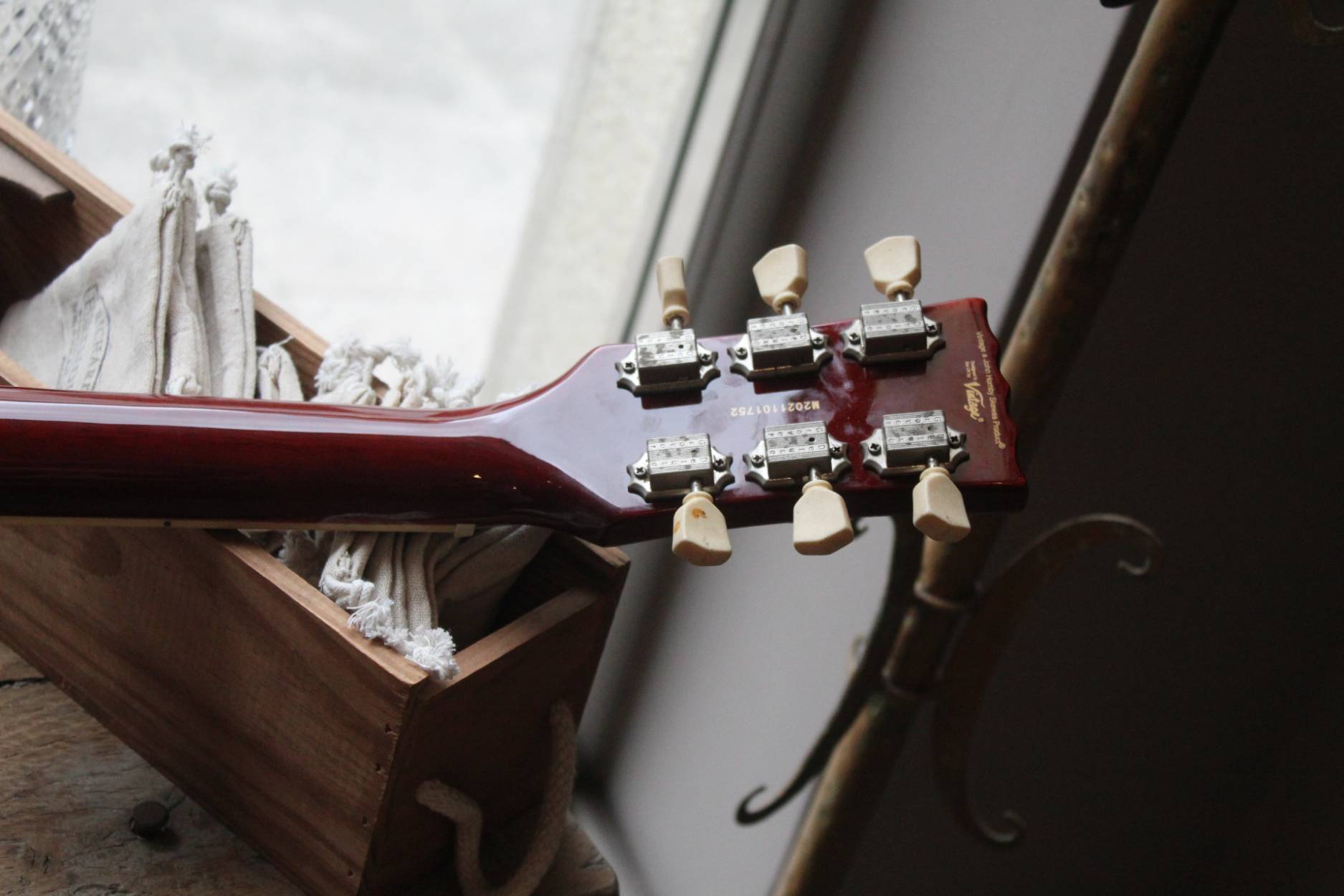 The Vintage ProShop Logan J Parker started life as the classic Vintage ReIssued V100AMB, having now been through the hands of the world famous Vintage team of skilled luthiers. With a beautiful ‘Jeep Green’ cellulose finish and Logan's very own signature decal on the offset V100 body with cream body binding, black control knobs and aged aluminium Bigsby B70 vibrato, this gorgeous single cutaway, does indeed evoke an enormous amount of individual style and class. For that subtle ‘driven in’ theme the top lacquer coat and all hardware have been given a subtle aged hue, the way only the Vintage team know how, whilst under the hood, the construction, tonal characteristics and playability that have made the original V100 a best-seller in itself, still remain. These include a solid carved mahogany body, with a graceful descending bass side shoulder and an ingeniously-designed offset heel providing improved access to the upper reaches of the fretboard. With a bound mahogany body, mahogany neck and bound rosewood fingerboard, the Vintage ProShop Logan J Parker offers superior playability and the perfect tonewood combination that’s enhanced by a pair of uncovered Wilkinson MVHZ Double Coils provide this iconic looking electric guitar with enough power to handle any high-gained situation. Includes ProShop Set-Up: Fret-level, crown and polish. Fingerboard dress and comfort treatment. Truss rod adjustment and set. Action height, radius, intonation and pickup height adjustment. Nut slot regulation. Specifications: Finish: Re sprayed Jeep Green with cellulose top coat, subtle aging applied. Body: Solid carved Mahogany body provides resonance, tone and ‘correct weight’ comfort and features a unique, evolutionary body shape, with a graceful descending bass side shoulder and an ingeniously-designed offset heel providing improved access to the upper reaches of the fretboard. Bridge: Wilkinson T.O.M. bridge enables fine-tuning of each string for superb intonation all over the fretboard. Vibrato tailpiece: Bigsby B70 constructed from die cast aluminium, for maximum sustain and superior tonal quality. Pickups: Pair of uncovered Wilkinson MVHZ Double Coils for raw power. Controls: Twin master Volume and Tone controls with three-way pickup selector switch. Machine heads: Wilkinson WJ44 machine heads provide simple, effective action for maximum tuning stability. Neck: One piece Mahogany with classic Vintage ‘soft C’ profile for instant comfort, speed, accuracy and great feel. Fingerboard: Rosewood for outstanding tonal transfer, responsiveness and durability with a traditional 12" radius for superb playability and feel. Scale Length: 24.75" / 628mm. Frets: 22 Medium Jumbo profile frets add to comfort, accuracy and overall positive feel of the Vintage V100. Nut: 43mm Graphtech NuBone for smooth and friction-free string bending and tuning. Headstock: Classic Vintage headstock design for balance and visual appeal. The Vintage® ProShop™ V100 is an original Vintage® ReIssued Series™ guitar, reimagined by the UK Vintage ProShop team.