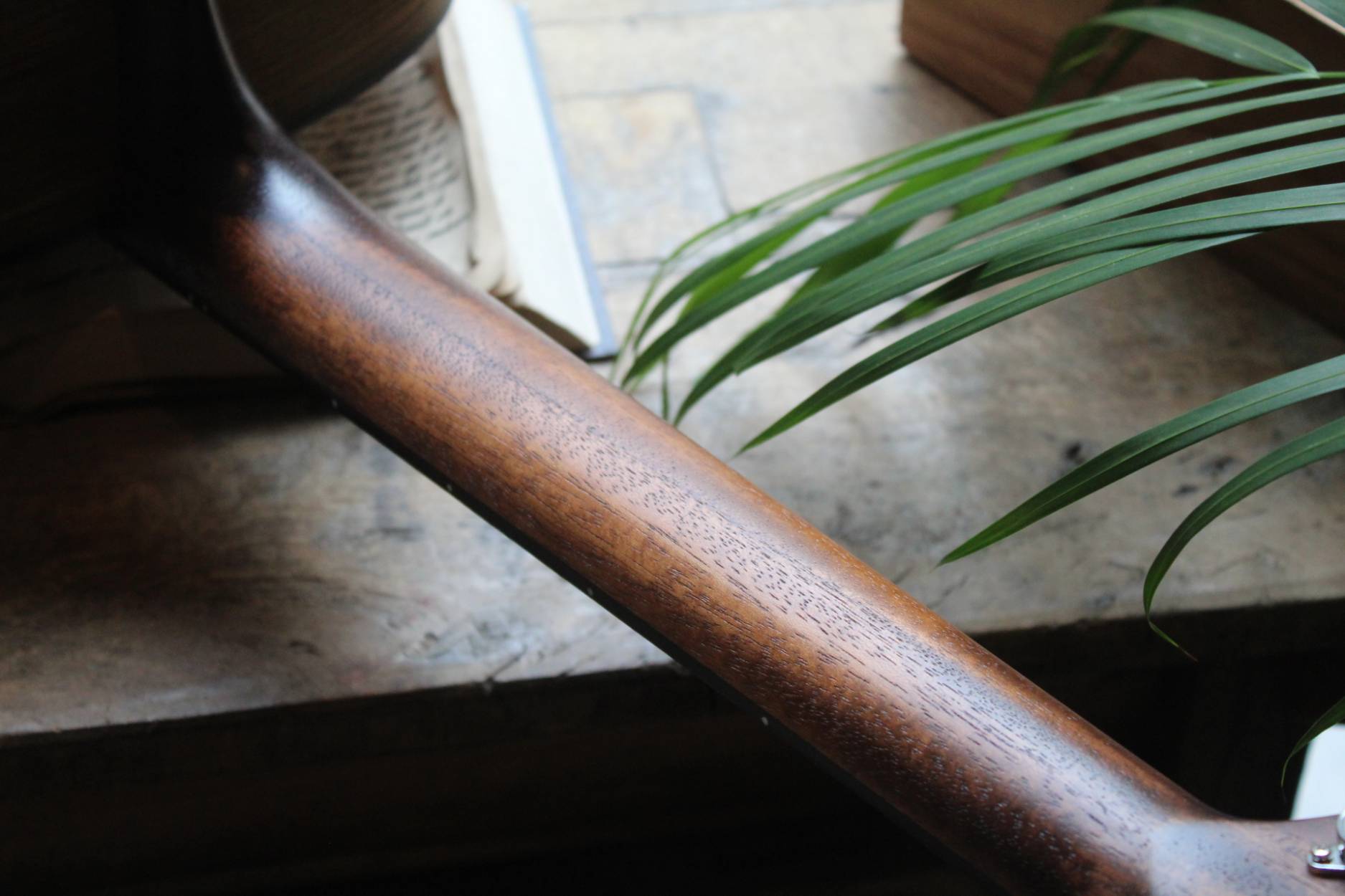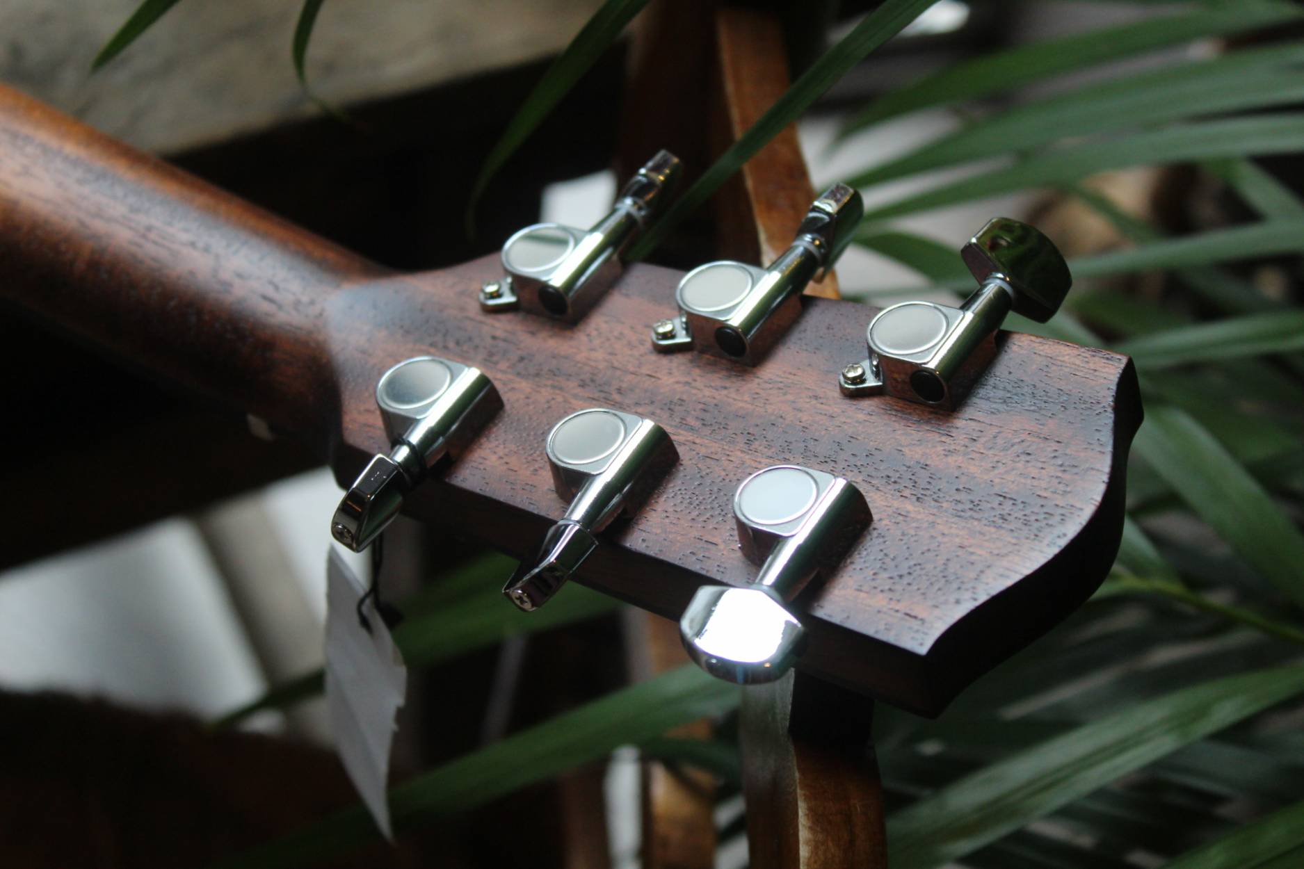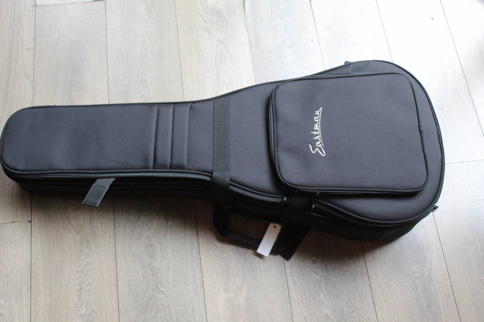 Neck Material:Mahogany Fingerboard:Ebony Fingerboard Radius:12" Neck Profile:Traditional Even "C" Nut:Bone 1 11/16" Scale Length:23.5 Body Dimensions:14 3/8" x 3 13/16" Bracings:Hand Scalloped X Body Top:Solid Sitka Spruce Body Back/Sides:Solid Ovangkol Bridge/Saddle:Ebony/Bone, 2-5/32" Spacing Rosette:Classic Truss Rod:Dual Acting Binding:Top/Back Binding Material:Tortoise Logo:Pearl Headstock Inlay:Pearl Dots Side Dot Color:White Bridge Pins:White Plastic w/ Black Dots Body Top Finish:Truetone Satin Back/Sides Finish:Truetone Satin Hardware Color:Nickel Tuners:PingWell RM 1171-CVR 3+4 Electronics:Fishman Sonitone Strings:D'Addario XS Coated Phosphor Bronze Light (.012 - .053) Action Height:12th fret 3/32" on the bass side and 2/32" on the treble side Case:Deluxe Padded Eastman Gig Bag Truss Rod Wrench:4mm