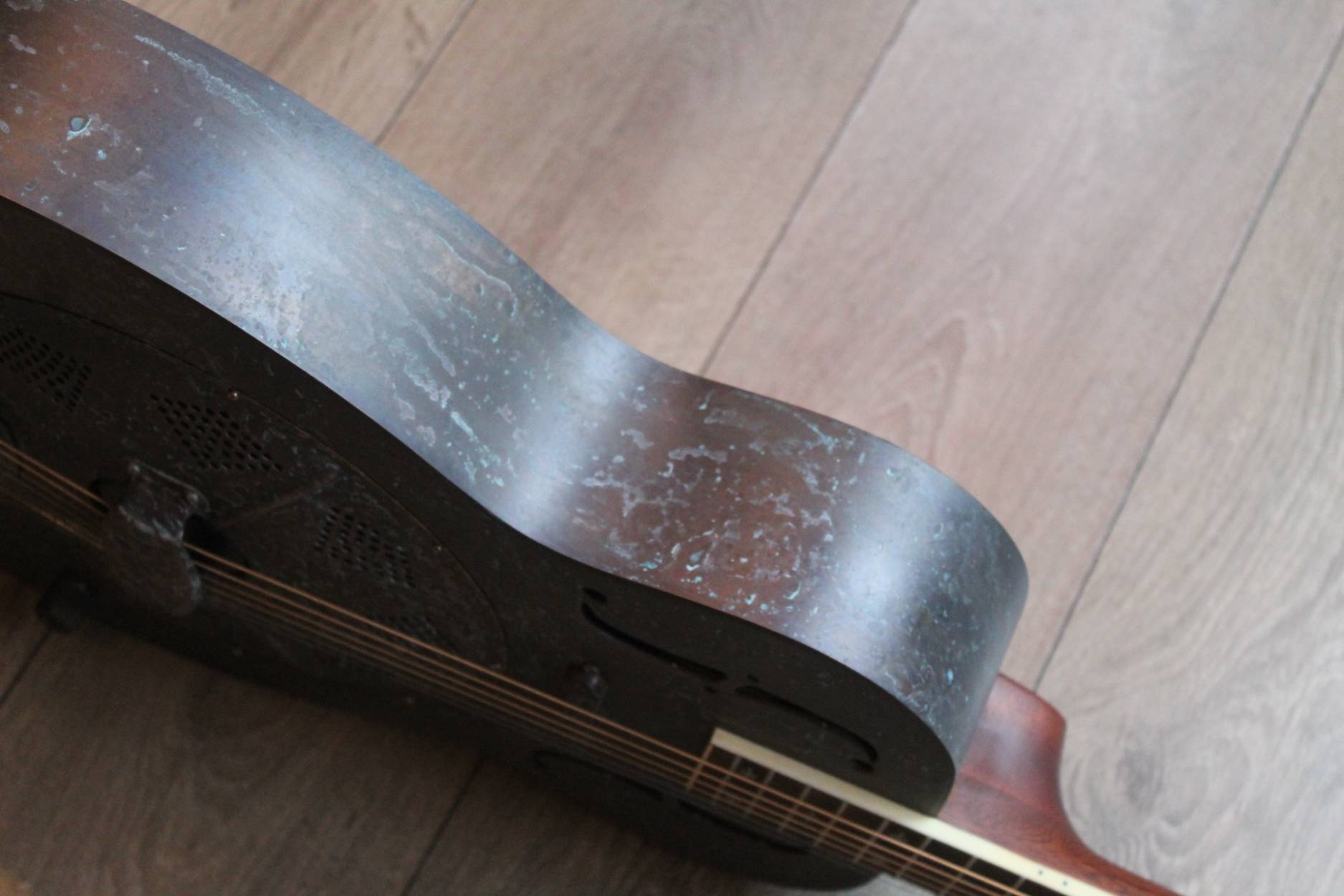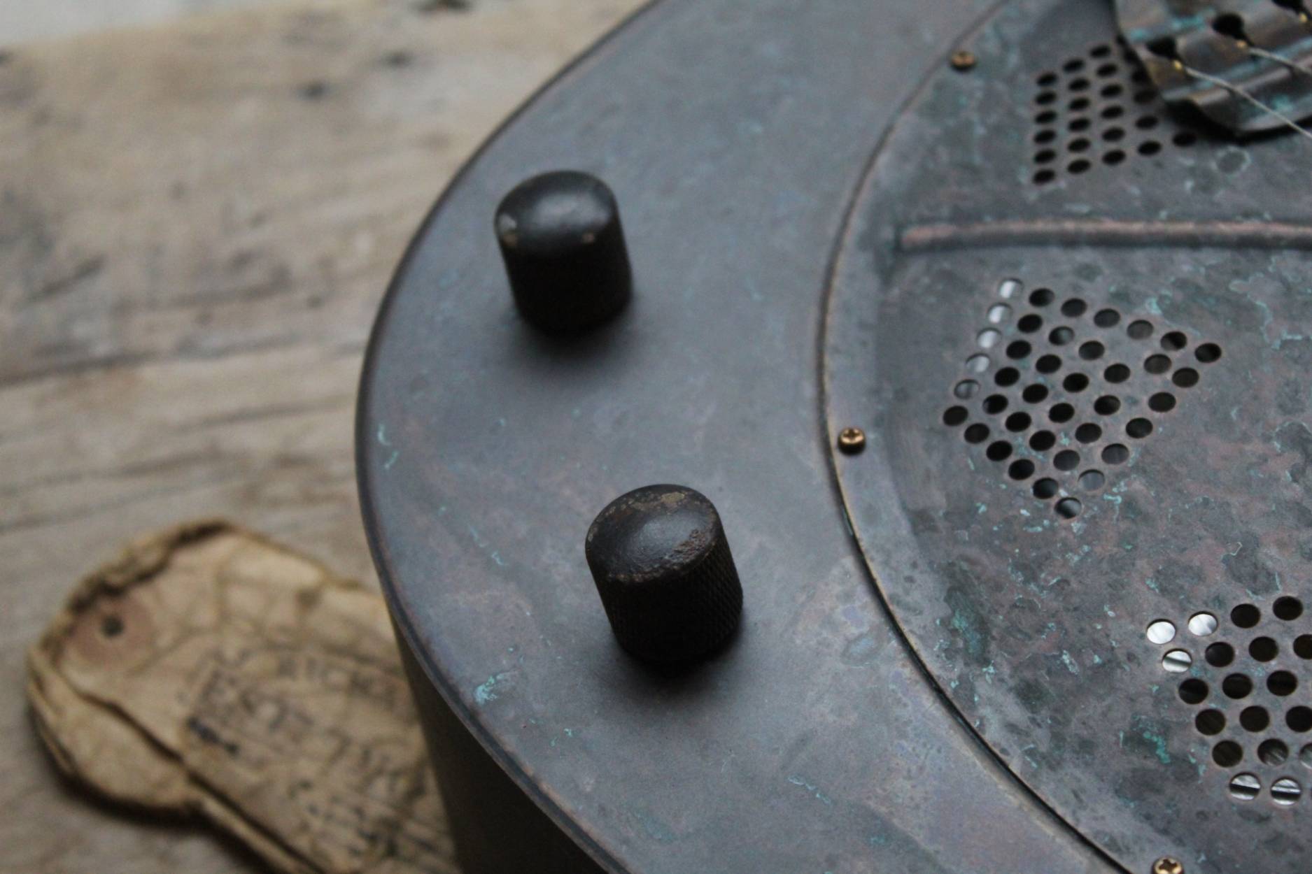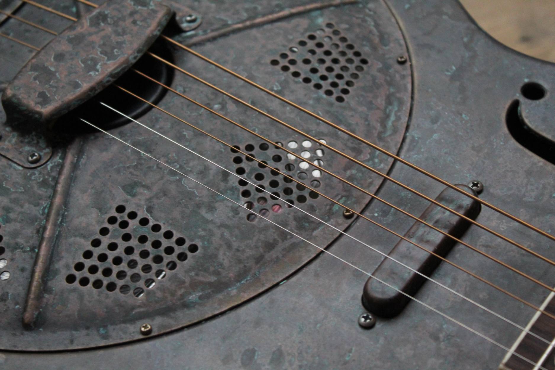 Description This is the Royall Blues Hound model, a 14 fret Brass bodied resonator in our new resonator line. Based on the original 1930’s classic National Duolian. The full size brass body has all of the depth you want, with a pronounced “bluesy” midrange, due to the single cone construction. If that 30’s sound is what you after, you found it. Royall FB Blues Hound Distressed Relic Brass Finish 14 Fret Single Cone Resonator • Brass body single cone resonator • Relic distressed brass finish • Distressed relic brass classic diamond hole resonator cover • 14 fret mahogany neck with slotted headstock • Rosewood fingerboard • Traditional slotted diamond Pearloid inlays • Formed arched back • Rolled edge F-holes • B&G Tele style bridge pickup • Relic brass pickup cover • Relic brass volume & tone controls • Hand polished frets • Single action truss rod • Etched Royall truss rod cover • Removable hand guard for easy access • Custom designed vintage style tailpiece • 0.5″ slot gap at the saddle • 8lb 11oz • 13-56 D’Addario Jazz Medium strings • 1 7/8″ bone nut • 25.5″ scale • 20″ body length • 10.25″ upper bout • 14.25″ lower bout • 3.5″ body depth • Hand spun aluminum Continental cone • Vintage Waverly style “Butterbean” tuners • Rosewood biscuit bridge with maple saddl