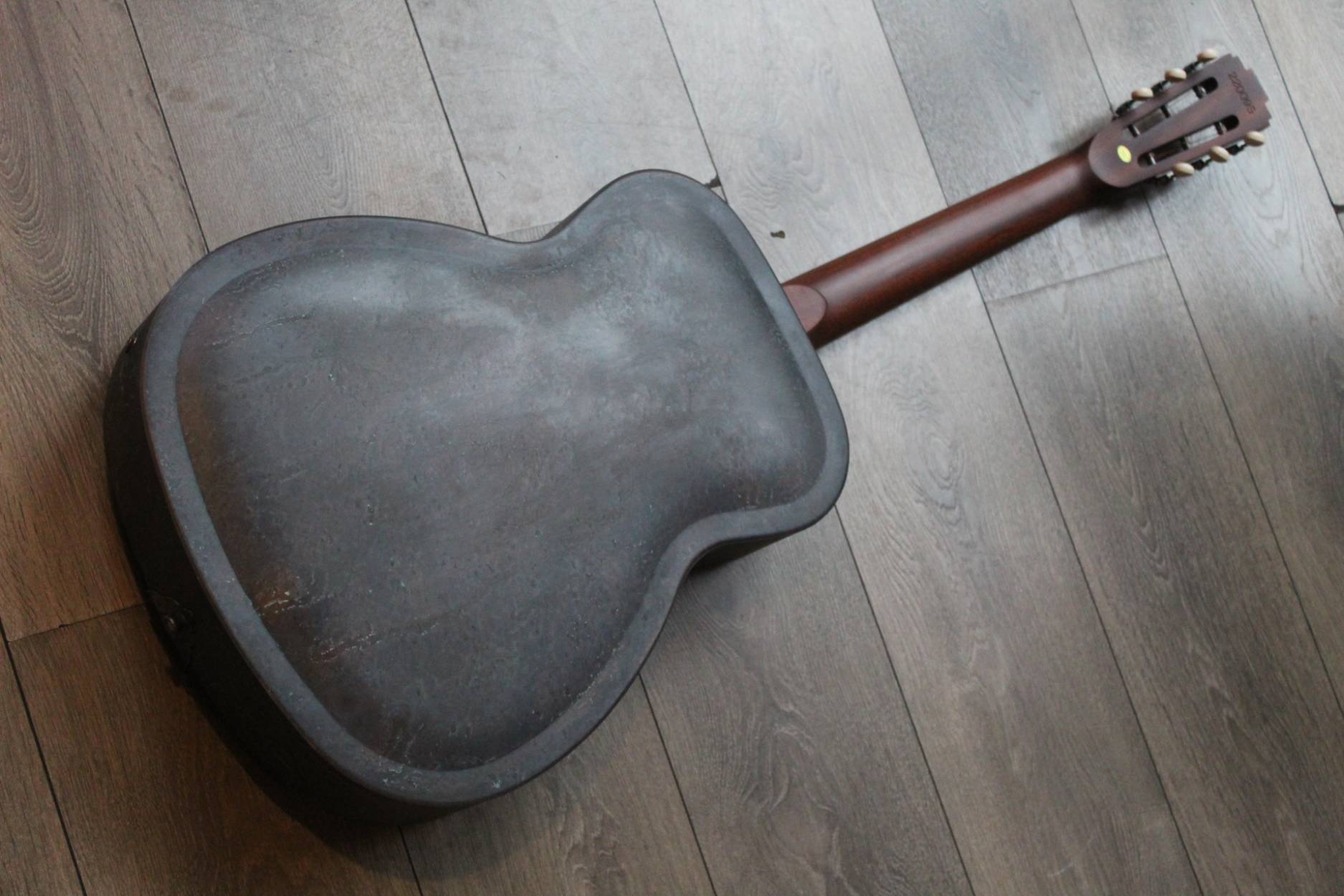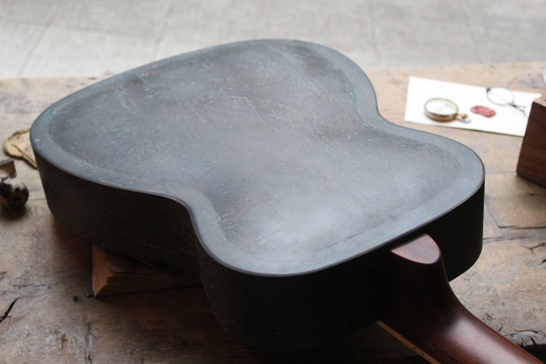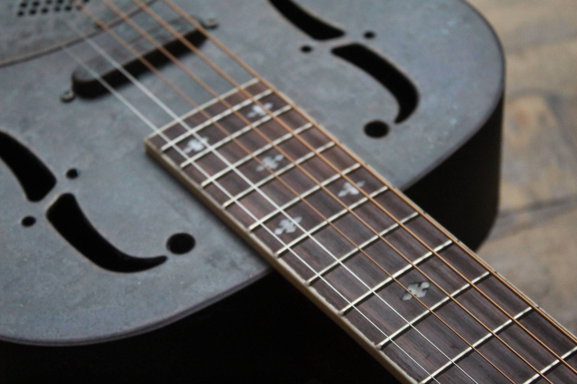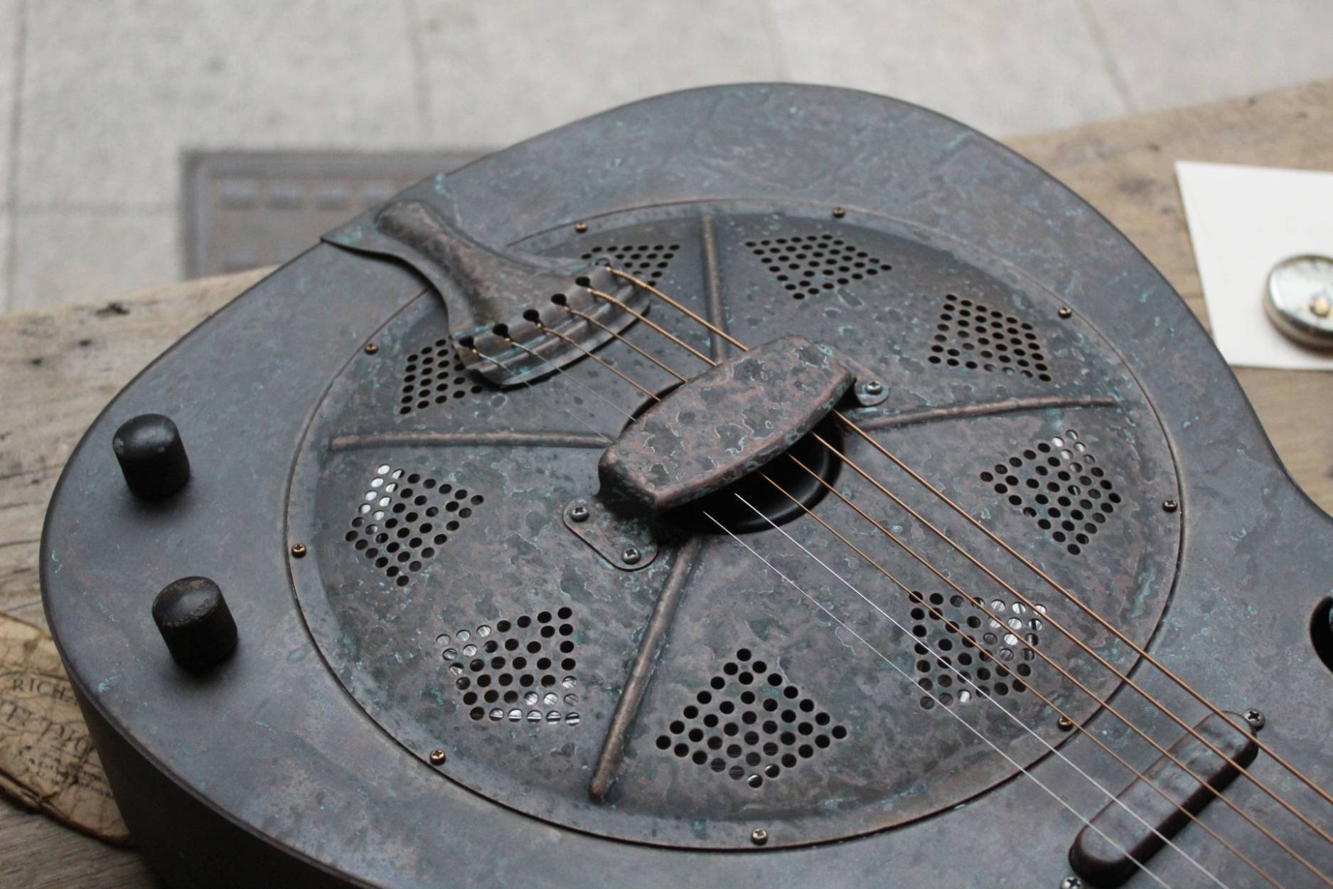 Description This is the Royall Blues Hound model, a 14 fret Brass bodied resonator in our new resonator line. Based on the original 1930’s classic National Duolian. The full size brass body has all of the depth you want, with a pronounced “bluesy” midrange, due to the single cone construction. If that 30’s sound is what you after, you found it. Royall FB Blues Hound Distressed Relic Brass Finish 14 Fret Single Cone Resonator • Brass body single cone resonator • Relic distressed brass finish • Distressed relic brass classic diamond hole resonator cover • 14 fret mahogany neck with slotted headstock • Rosewood fingerboard • Traditional slotted diamond Pearloid inlays • Formed arched back • Rolled edge F-holes • B&G Tele style bridge pickup • Relic brass pickup cover • Relic brass volume & tone controls • Hand polished frets • Single action truss rod • Etched Royall truss rod cover • Removable hand guard for easy access • Custom designed vintage style tailpiece • 0.5″ slot gap at the saddle • 8lb 11oz • 13-56 D’Addario Jazz Medium strings • 1 7/8″ bone nut • 25.5″ scale • 20″ body length • 10.25″ upper bout • 14.25″ lower bout • 3.5″ body depth • Hand spun aluminum Continental cone • Vintage Waverly style “Butterbean” tuners • Rosewood biscuit bridge with maple saddl