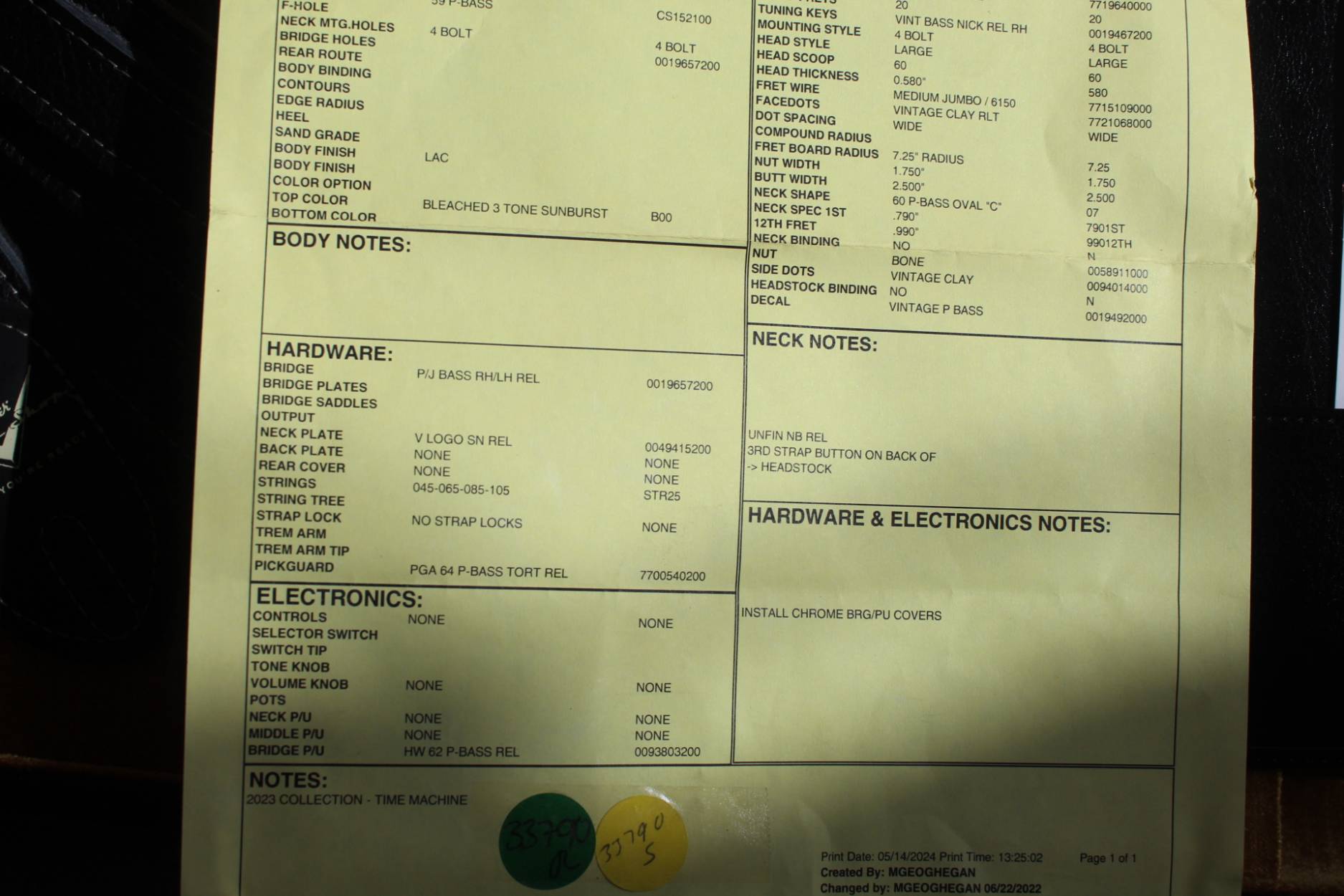 LOOK THE SHOP FLOOR PHOTOS FOR FULL SPEC, THANKS Body: 2-Piece Alder Body Finish: Nitro Lacquer Control Knobs: Knurled Chrome Fingerboard: AAA Rosewood (Flat Lam) Hardware Finish: Nickel/Chrome Neck Finish: Relic'd Lacquer Pickguard: Tortoise Position Inlays: Vintage Clay Dots Neck Material: Quartersawn Maple Neck Shape: 60 P-Bass Oval "C" (.790"-.990") Scale Length: 34" Fingerboard Radius: 7.25" Number of Frets: 20 Fret Size: Medium Jumbo String Nut: Bone Nut Width: 1.750" Truss Rod: Vintage Style Bridge Pickup: Hand-wound 62 P-Bass Bridge: Vintage P-Bass Style Tuning Machines: Vintage Style Tuner Case/Gig Bag: Hardshell Case