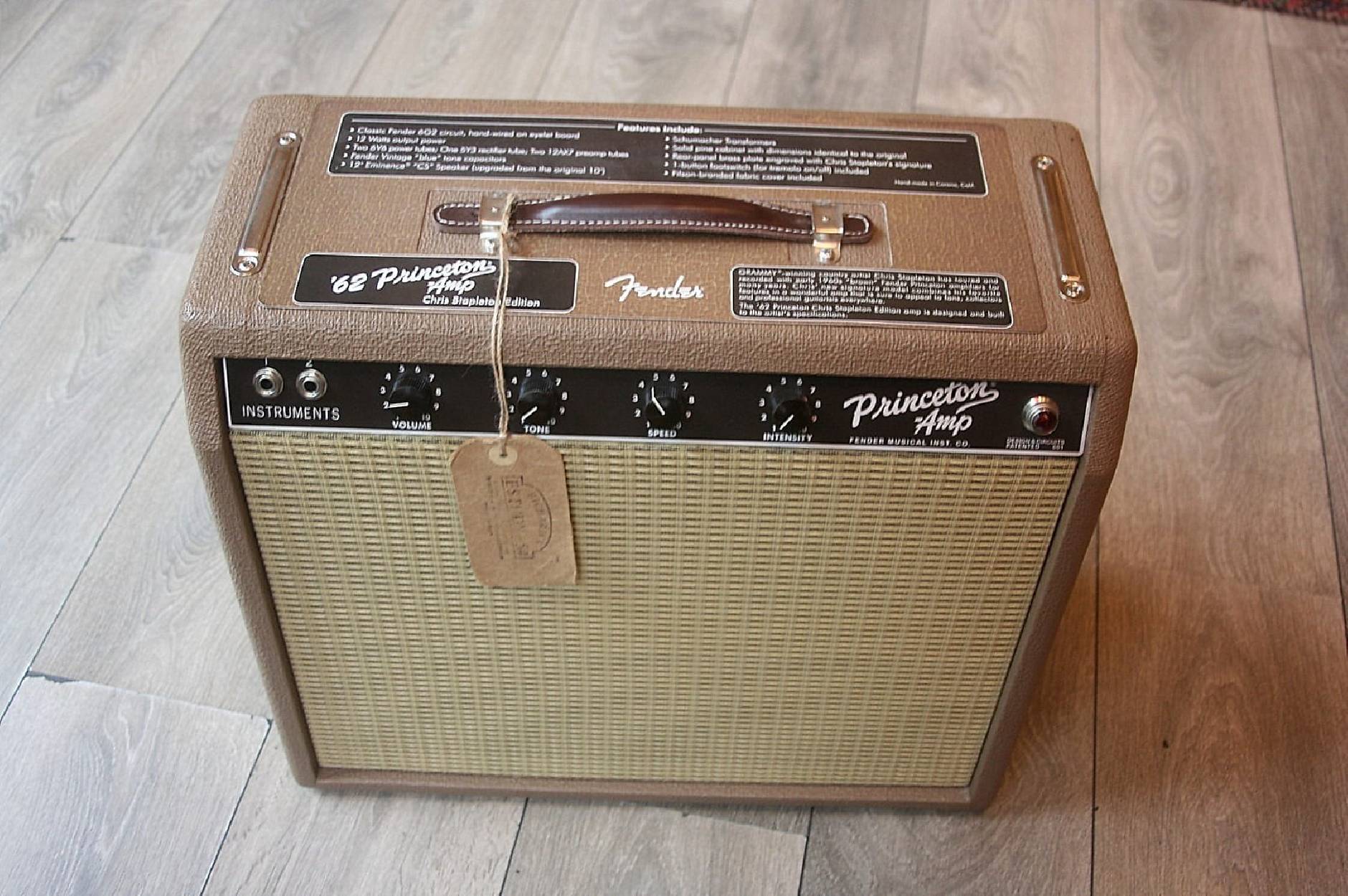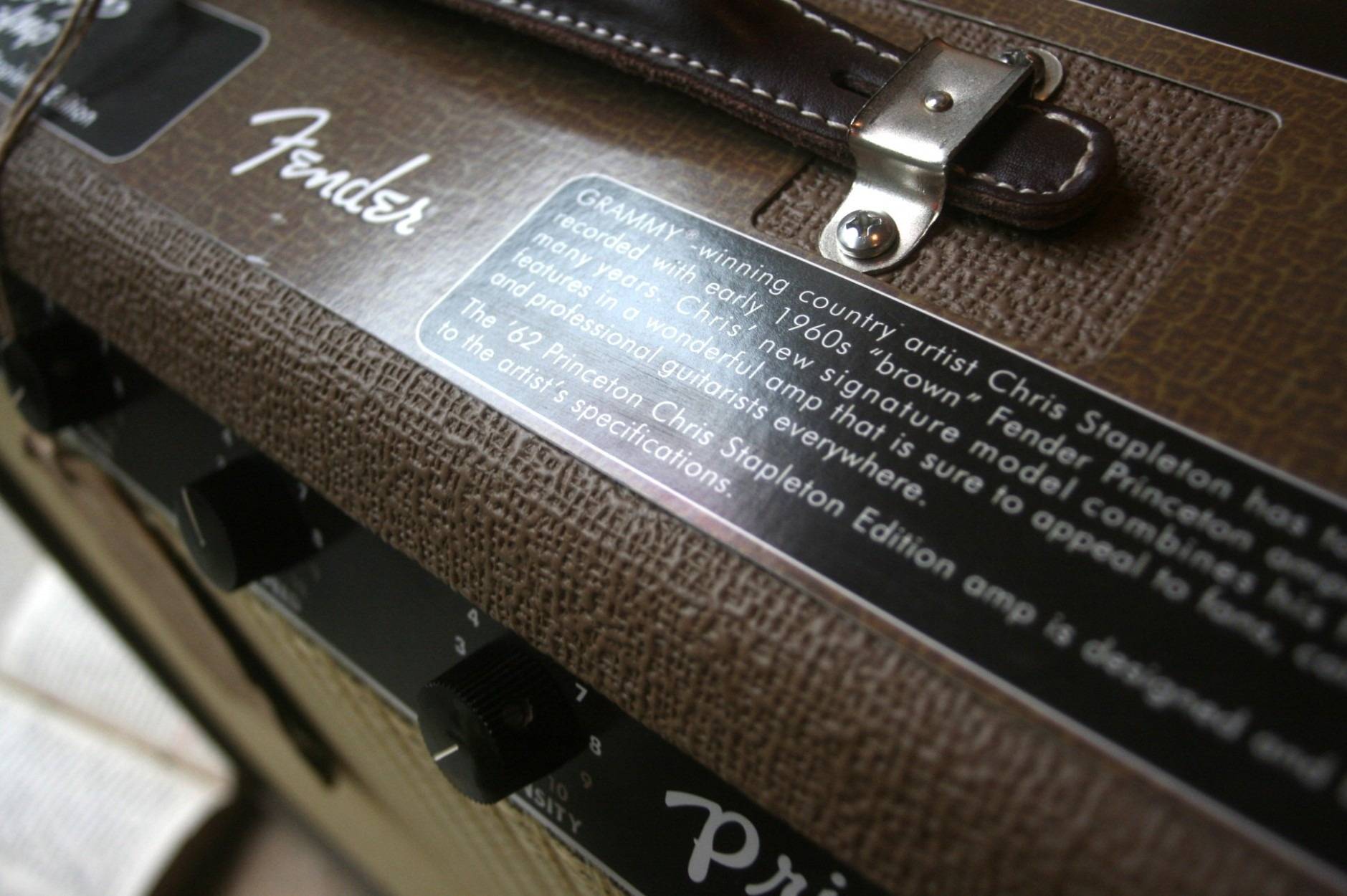 The brown ’62 Princeton amp’s sensitivity and smooth organic tremolo made it a longtime studio favorite and the ideal partner for Grammy®-winning country artist, Chris Stapleton. The hand-wired ’62 Princeton Chris Stapleton Edition combines the classic 6G2 circuit with Stapleton’s favorite features and personally chosen aesthetic touches. This 12W combo features Fender Vintage “Blue” tone caps, Schumacher™ transformers, an upgraded Eminence® 12” Special Design “CS” speaker, and an output tube-biased tremolo circuit. The acoustically resonant solid pine cabinet wears rough brown textured vinyl covering, wheat grille cloth and thick dark brown leather handle, while the dark brown control panel sports dark brown “radio” knobs and the rear panel features an engraved brass plate with Chris Stapleton artwork. Includes 1-button switch for tremolo and retro-styled Filson™ Rugged Twill fabric cover. CARACTERÍSTICAS 12W combo amplifier Eminence 12” Special Design “CS” speaker Two 12AX7 preamp tubes; two 6V6 power tubes; single 5Y3 rectifier tube Fender Vintage “Blue” tone caps; Schumacher transformers Includes 1-button tremolo footswitch and Filson Rugged Twill fabric cover