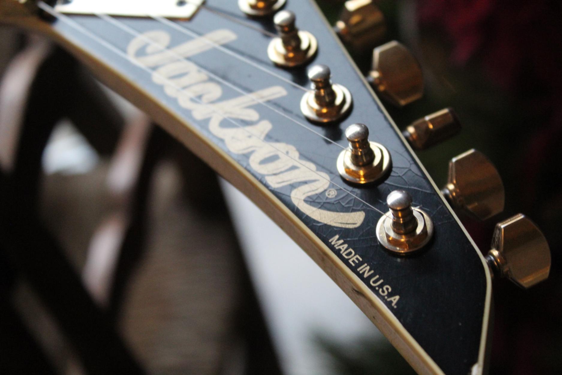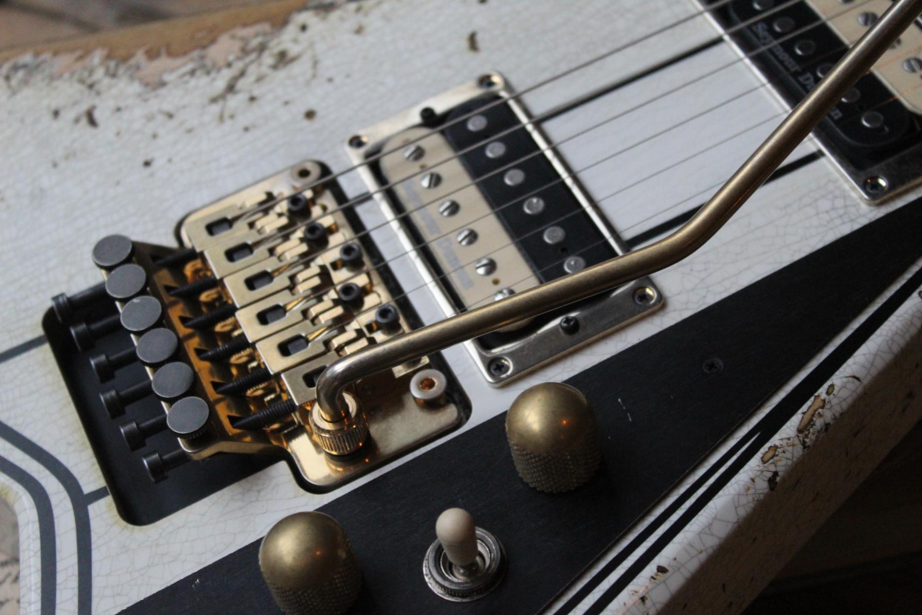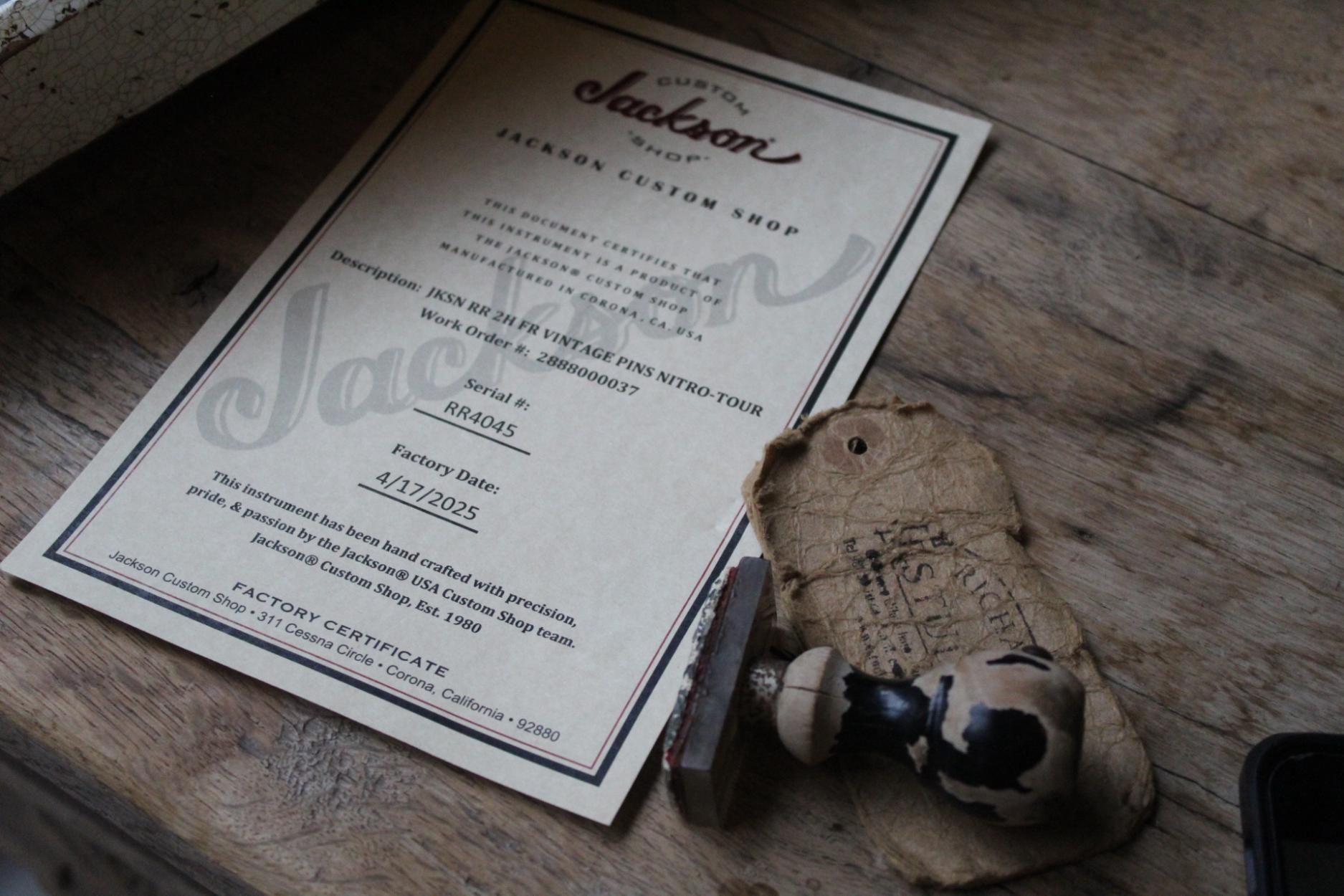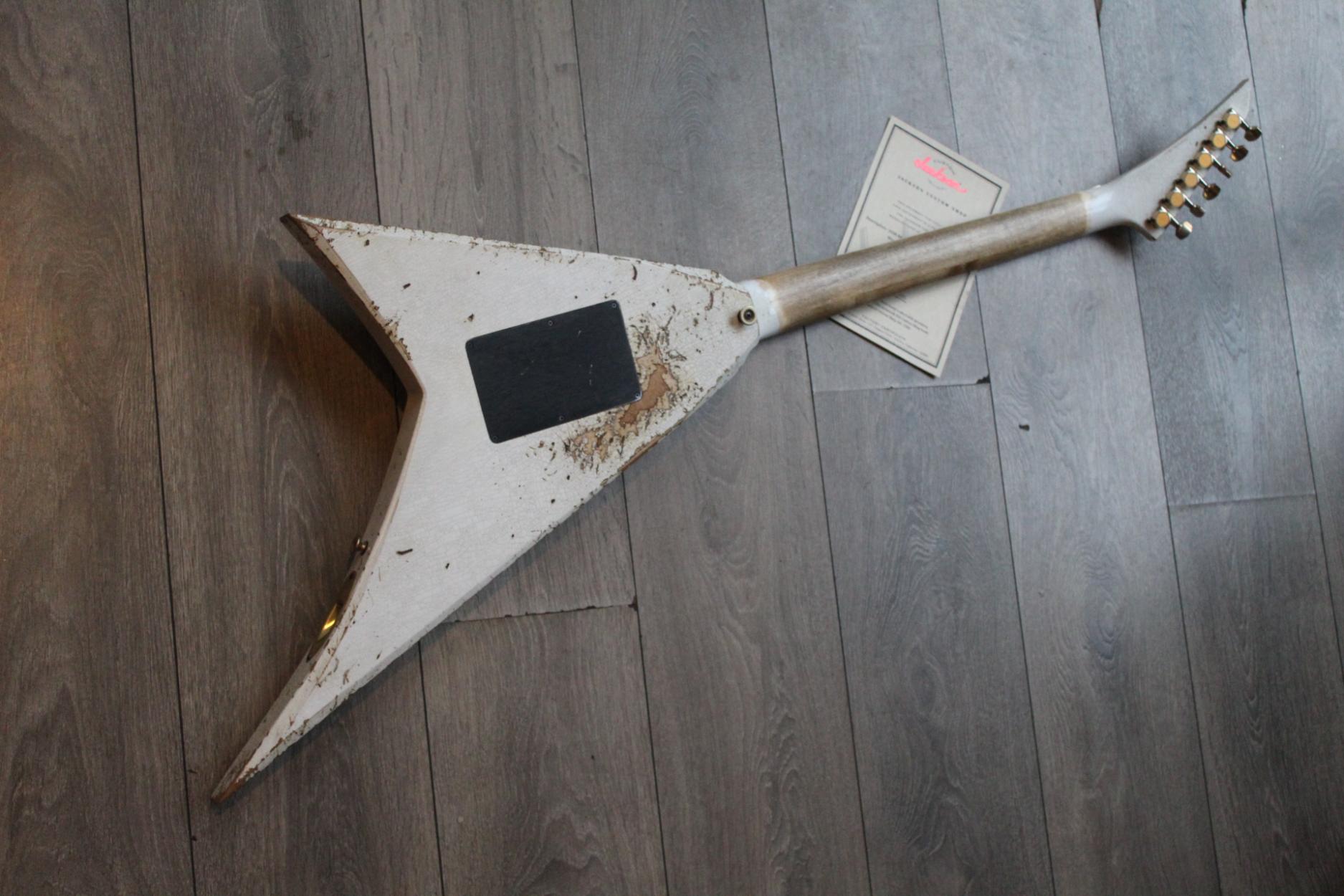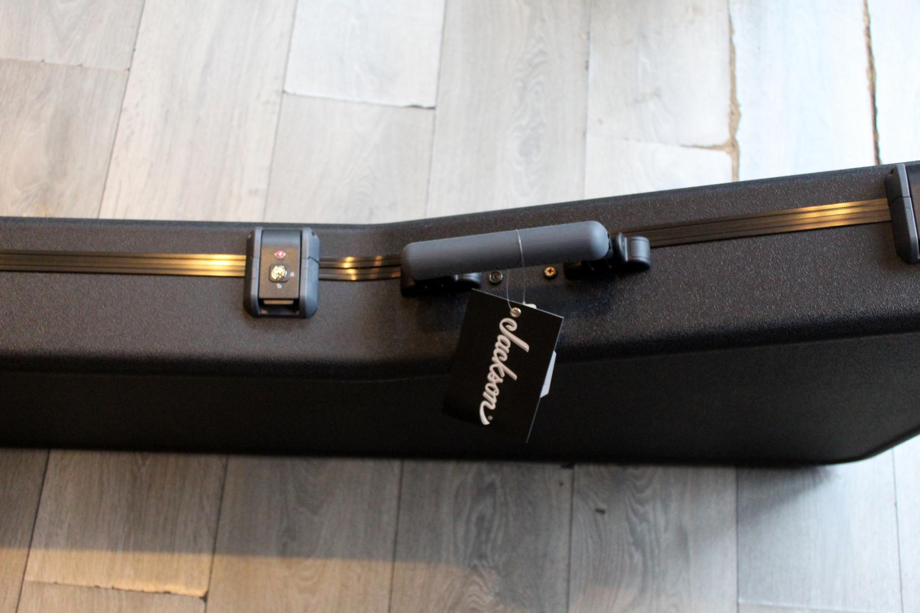 288-8000-037 Nitro-Relic® Tour Finish; Premium Alder Body Wood; Matching Painted Laminated 3-Piece Maple Neck-Thru Design; Ebony Fingerboard; 6-In-Line Jackson® Headstock; Ivoroid Binding on Neck and Headstock; Mother-Of-Pearl Sharkfin Fingerboard Inlays; Dual-Action Truss Rod; 22 - Jumbo Frets; Black Position Markers; .790" at 3rd Fret and .850" at 12th Fret Neck Carve; Floyd Rose® Locking Nut; Gold Floyd Rose® Recessed Double-Locking Tremolo System Bridge; Big Brass Tremolo Block; Double Humbucker Pickup Rout; Gold Pickup Ring(s); Seymour Duncan® JB Model™ Zebra Creme/Black Bobbins Bridge Pickup; Seymour Duncan® Jazz Zebra Creme/Black Bobbins Neck Pickup; Gold Gotoh Tuning Keys; DiMarzio® DP-1201 Master Volume Pot; DiMarzio® DP-1201 Tone Pot; Brass Knurled Metal Dome Knob(s); Switchcraft® 3-Way Toggle Switch; Brass 17mm Strap Buttons; .009" to .042" Strings; 80's Style Gold Logo; Molded Hardshell Case; Certificate of Authenticity.