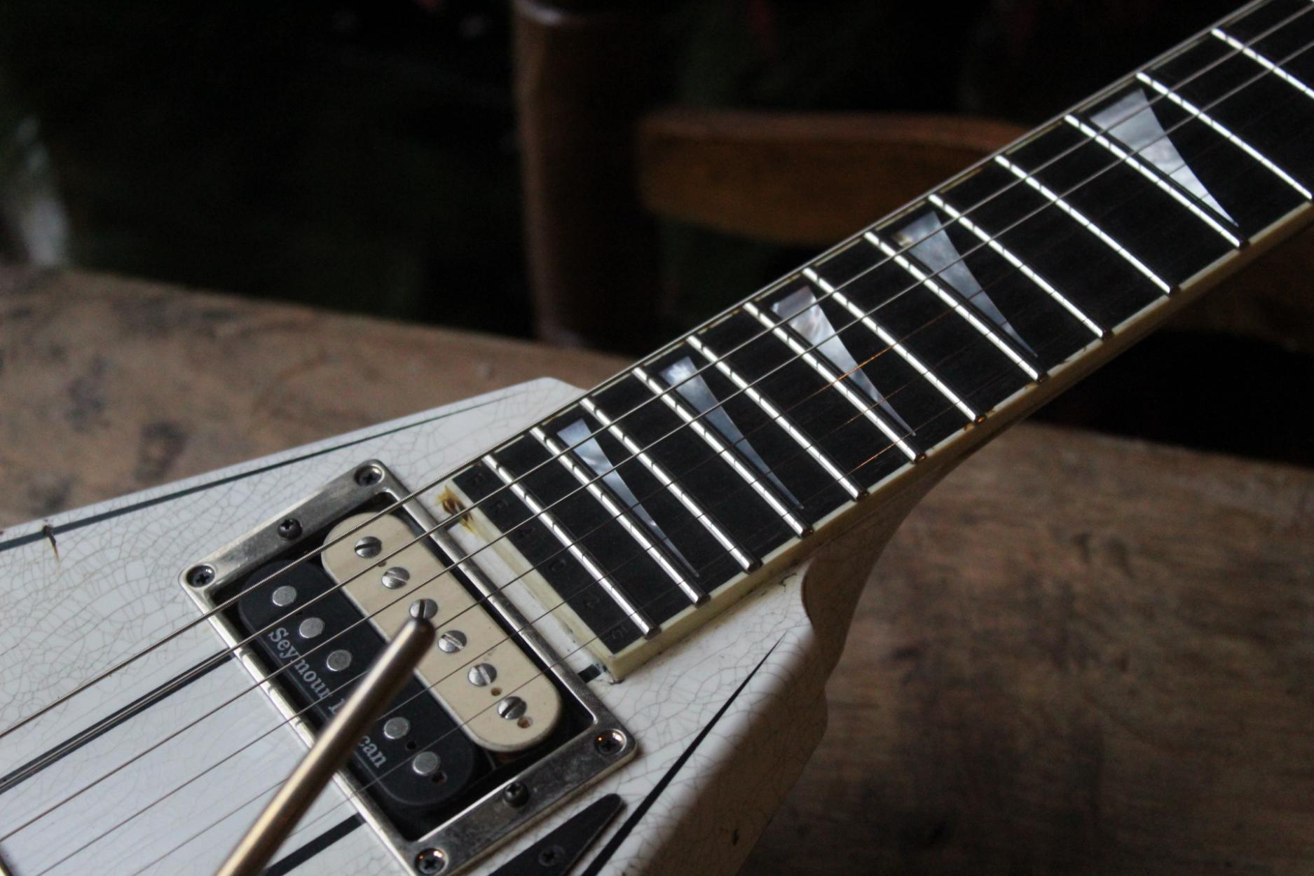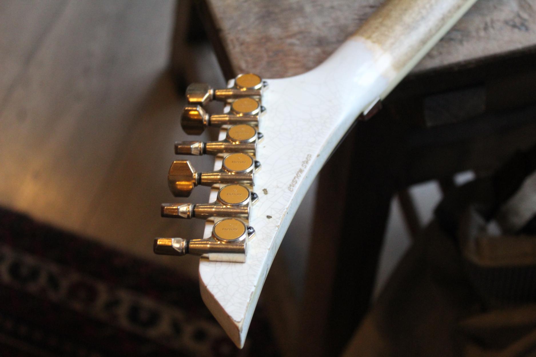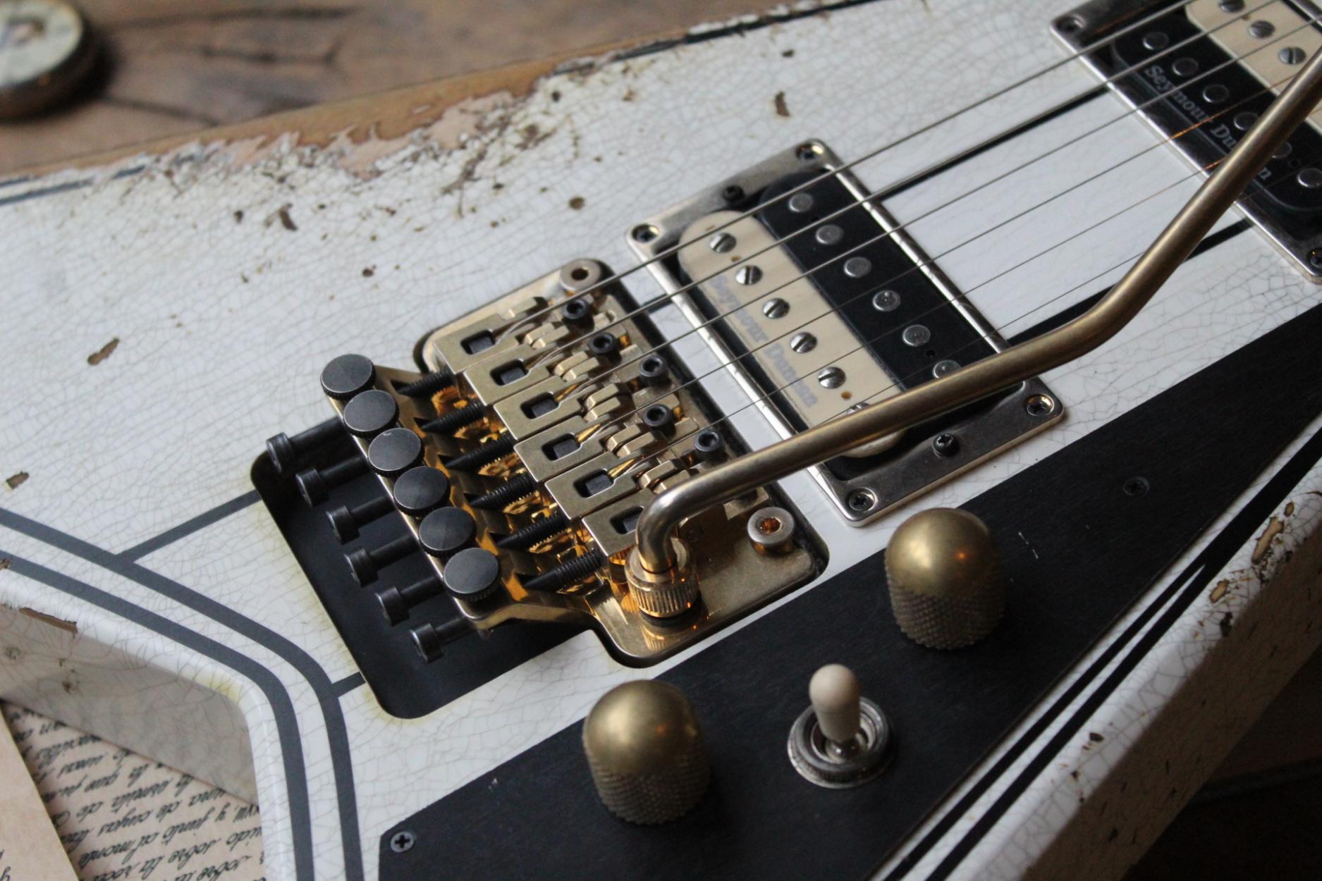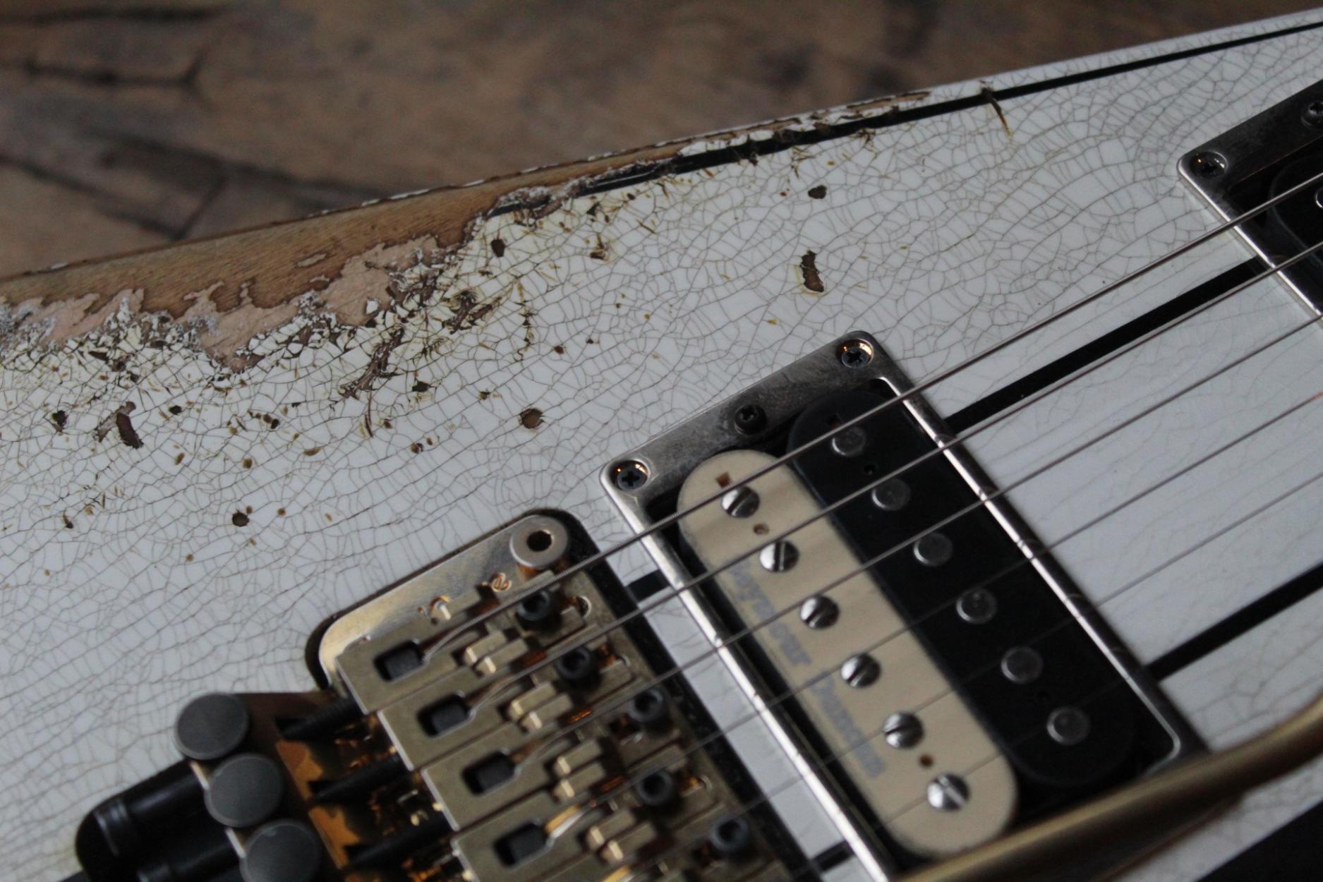 288-8000-037 Nitro-Relic® Tour Finish; Premium Alder Body Wood; Matching Painted Laminated 3-Piece Maple Neck-Thru Design; Ebony Fingerboard; 6-In-Line Jackson® Headstock; Ivoroid Binding on Neck and Headstock; Mother-Of-Pearl Sharkfin Fingerboard Inlays; Dual-Action Truss Rod; 22 - Jumbo Frets; Black Position Markers; .790" at 3rd Fret and .850" at 12th Fret Neck Carve; Floyd Rose® Locking Nut; Gold Floyd Rose® Recessed Double-Locking Tremolo System Bridge; Big Brass Tremolo Block; Double Humbucker Pickup Rout; Gold Pickup Ring(s); Seymour Duncan® JB Model™ Zebra Creme/Black Bobbins Bridge Pickup; Seymour Duncan® Jazz Zebra Creme/Black Bobbins Neck Pickup; Gold Gotoh Tuning Keys; DiMarzio® DP-1201 Master Volume Pot; DiMarzio® DP-1201 Tone Pot; Brass Knurled Metal Dome Knob(s); Switchcraft® 3-Way Toggle Switch; Brass 17mm Strap Buttons; .009" to .042" Strings; 80's Style Gold Logo; Molded Hardshell Case; Certificate of Authenticity.