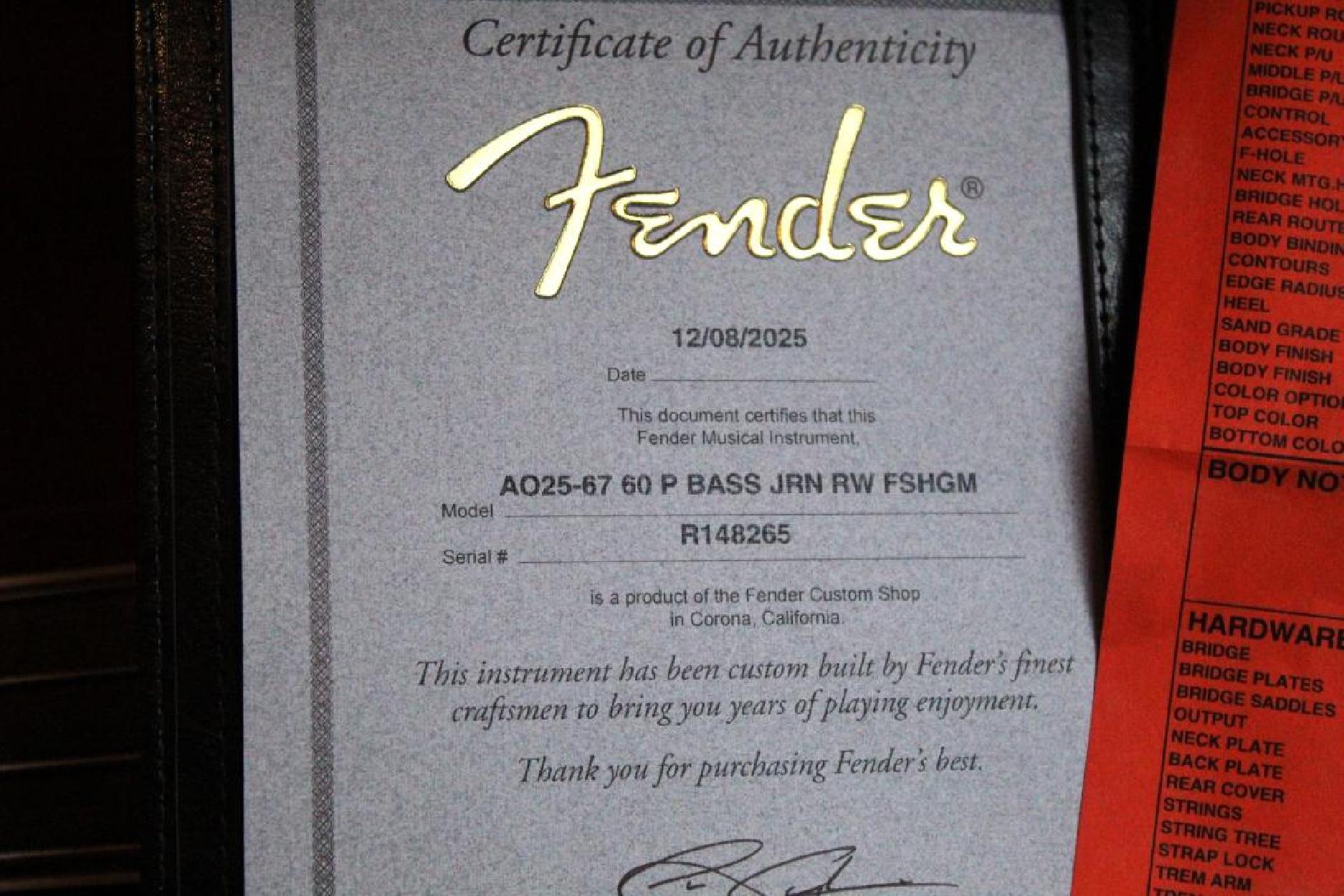 4, 12 KG Combining the best elements of the Precision Bass® and the Jazz Bass®, the Limited Edition Precision Bass Special is a bass player’s dream come true. The two-piece hand-selected Precision bass body is routed for both Precision and Jazz bass pickups and wears a Journeyman Relic® lacquer finish. The quartersawn maple Jazz Bass neck features a comfortable ’60 Jazz Bass “U” profile, 7.25”-radius rosewood fretboard, pearl block inlays and 20 medium jumbo (6150) frets. A hand-wound ’75 Jazz Bass bridge pickup and hand-wound ’65-’70 Precision Bass neck pickup provide a perfect combination of thump and articulation, with individual master volume controls and one master tone control. Additional features include a four-ply brown shell pickguard, RSD deluxe bass bridge, oval “lollipop” tuning machines, bone nut and disc string tree. Includes deluxe hardshell case, strap and certificate of authenticity. Other specifications include: Model Number: 9235001527 Body Shape: Precision Bass® Body Material: 2-Piece Select Alder Body Finish: Journeyman Nitro Lacquer Control Knobs: Knurled Chrome Fingerboard: AAA Rosewood (Round Lam) Hardware Finish: Nickel Relic Neck Finish: Relic Lacquer Pickguard: 64 P-Bass Tortoise Position Inlays: Pearloid Blocks Neck Material: Maple Neck Neck Shape: 60 J-Bass Oval “U” (.790-.990″) Scale Length: 34″ Fingerboard Radius: 7.25″ Number of Frets: 21 Fret Size: Medium Jumbo 6150 String Nut: Bone Nut Width: 1.50″ Truss Rod: Vintage Style Bridge Pickup: Hand-wound 75 J-Bass Neck Pickup: Hand-wound 65-70 P-Bass Pickup Configuration: SS Bridge: RSD Deluxe Tuning Machines: Vintage Style Lollipop Included Accessories: Deluxe Hardshell Case, Strap and Certificate of Authenticity