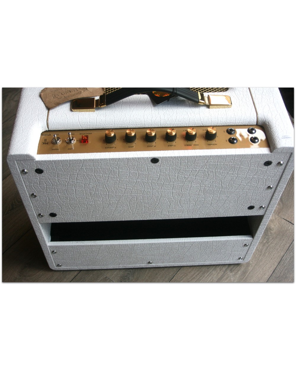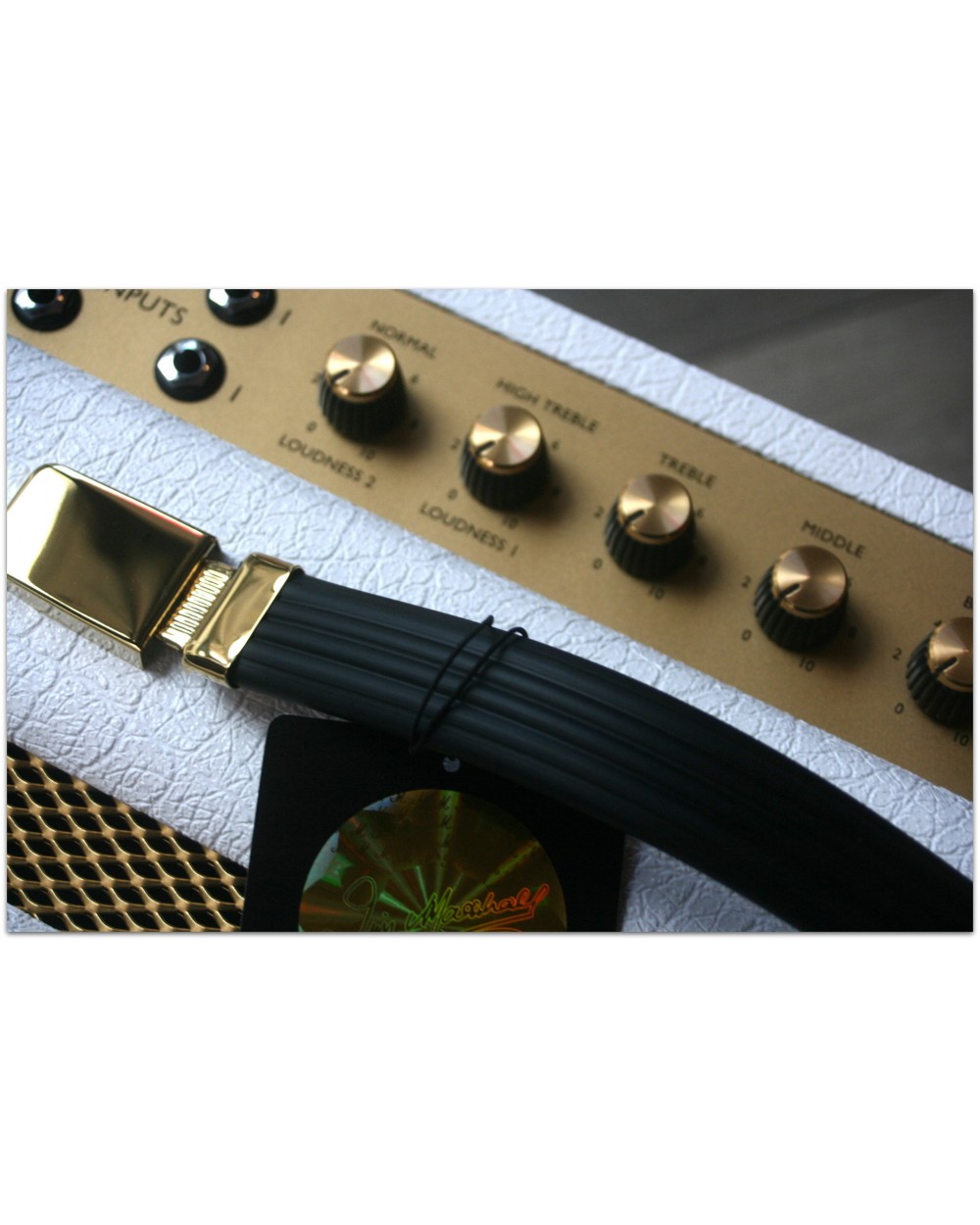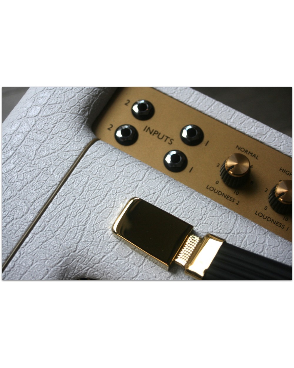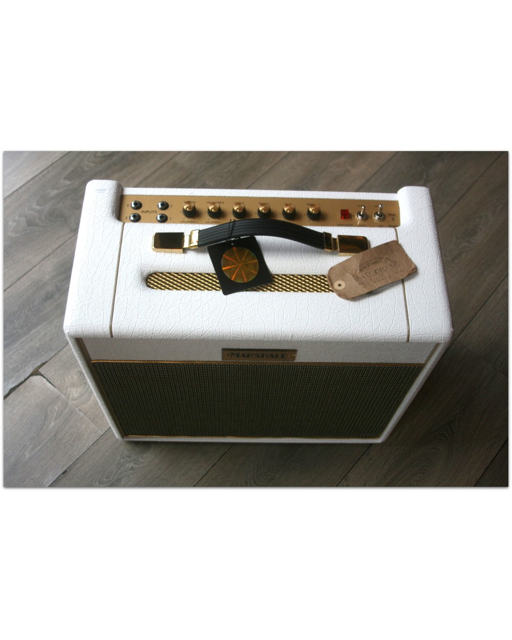 Description & Specs From Marshall: This elegant white and gold design features vintage-style “salt’n’pepper” grille cloth and a plexi-style logo. Based on an amp that inspired generations of iconic guitarists, the 1959SLP. Marshall Studio Vintage amps deliver the unmistakeable tone shaping and harmonics that are expected from the 1959SLP in a portable format. You can play anything from saturated blues tones to biting leads for classic rock. Studio Vintage amps provide four separate inputs for you to blend your sound, distinctive EQ settings including presence control, a DI output and power reduction. VALVES: 2 x ECC83, 1 x ECC83 (phase splitter) and 2x EL34 CHANNELS: Single channel with four separate inputs. High and low sensitivity loudness controls POWER CONTROL: 20W or 5W SPEAKERS: 1 x 10”Celestion V-type 10” EQUALIZATION: Treble, middle, bass and presence SPEAKER OUTPUT: S5 x 1/4” jack sockets, (16Ω load / 8Ω load / 4Ω load) OUTPUTS: DI Output