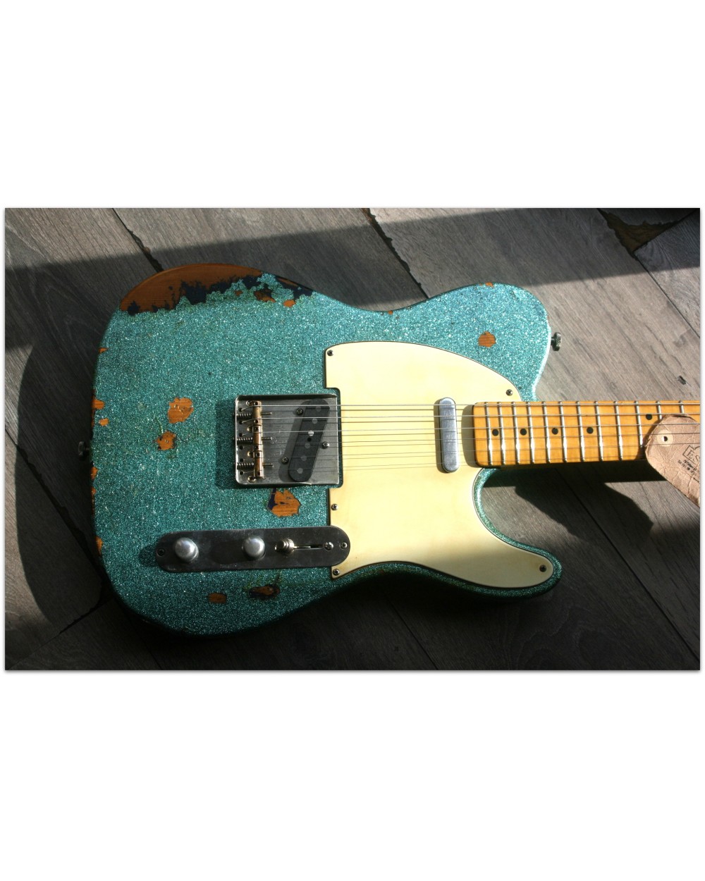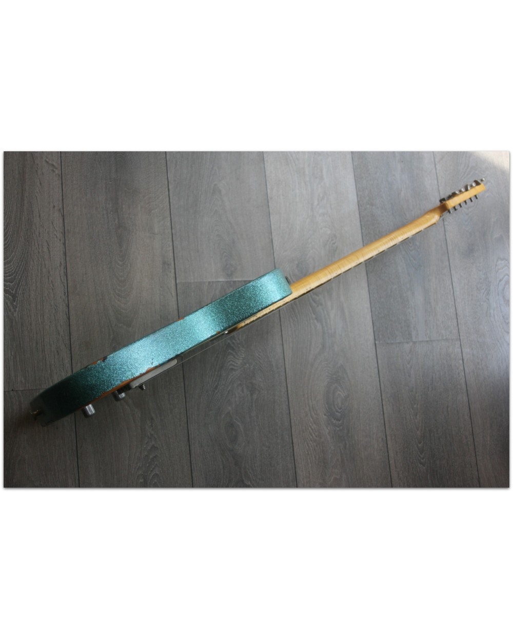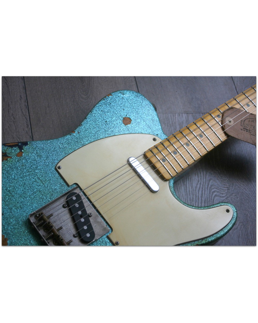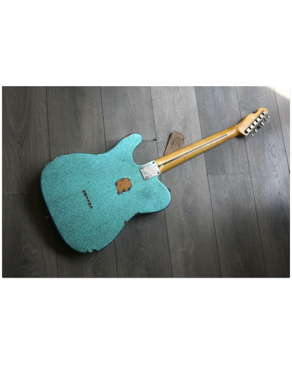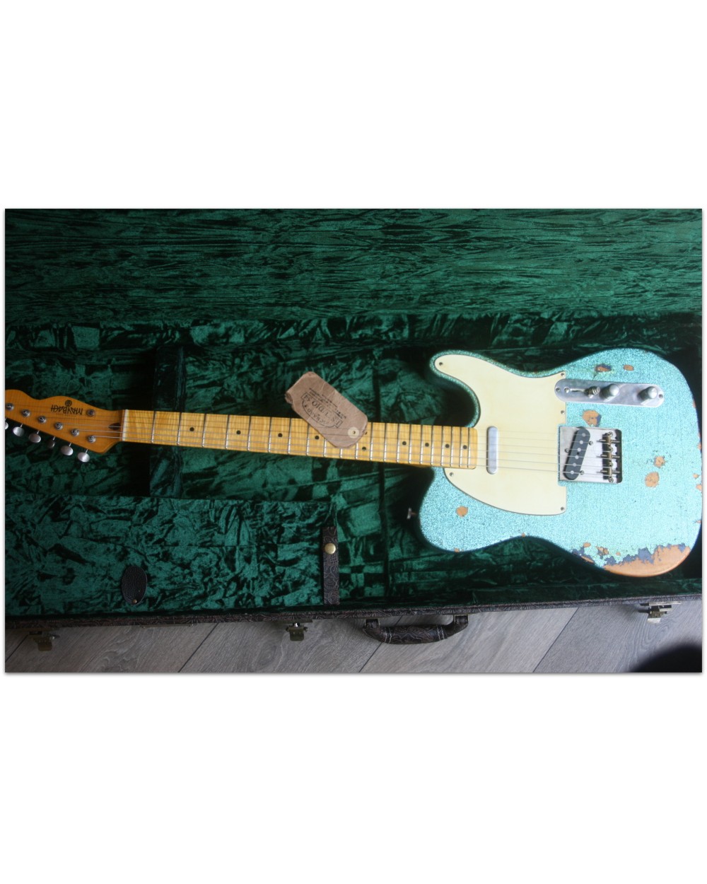 Brand: Nick Page Guitars Model: Maybach Custom Shop by Nick Page: Teleman „Mermaid Turquoise Sparkle“ Serial No.: 3 of 4 pieces made worldwide Type: Single Cutaway, Solidbody, T-Style Body: Wood: Spruce (Fichte) Pickguard: Vintage White Pearloid - aged Neck: Wood: Roasted Flamed Maple (bolt-on) Scale length: 648 mm / 25,5“ Shape: Strong but handy C Radius: 9,5“ Inlays: Dot Black Frets: 6105 Nut: Bone Finish: Oiled Colour/Finish: Colour: Mermaid Turquoise Sparkle Finish: Nitro - heavily aged Pick Ups / Electrics: Neck: Van Zandt True Vintage Bridge: Van Zandt True Vintage Hardware finish: Aged Hardware: Tuners: Gotoh Vintage Style Bridge: Maybach T-Style Other: Weight: Angabe folgt Case: Branded Case with Paisley-style embossings