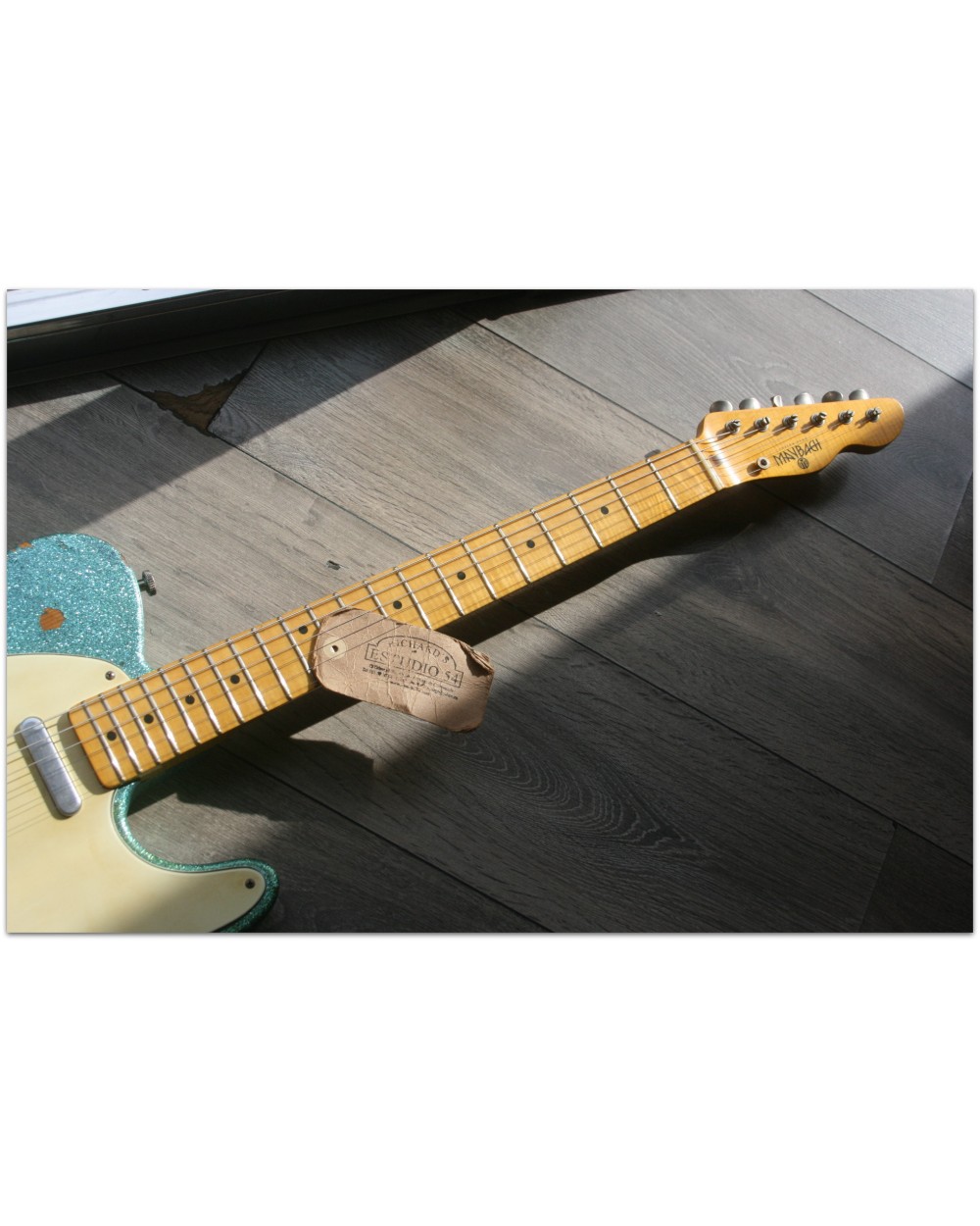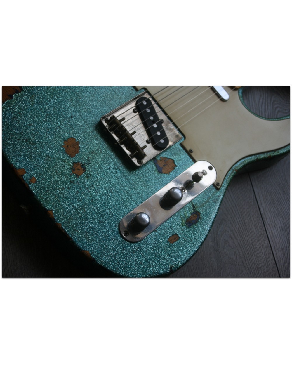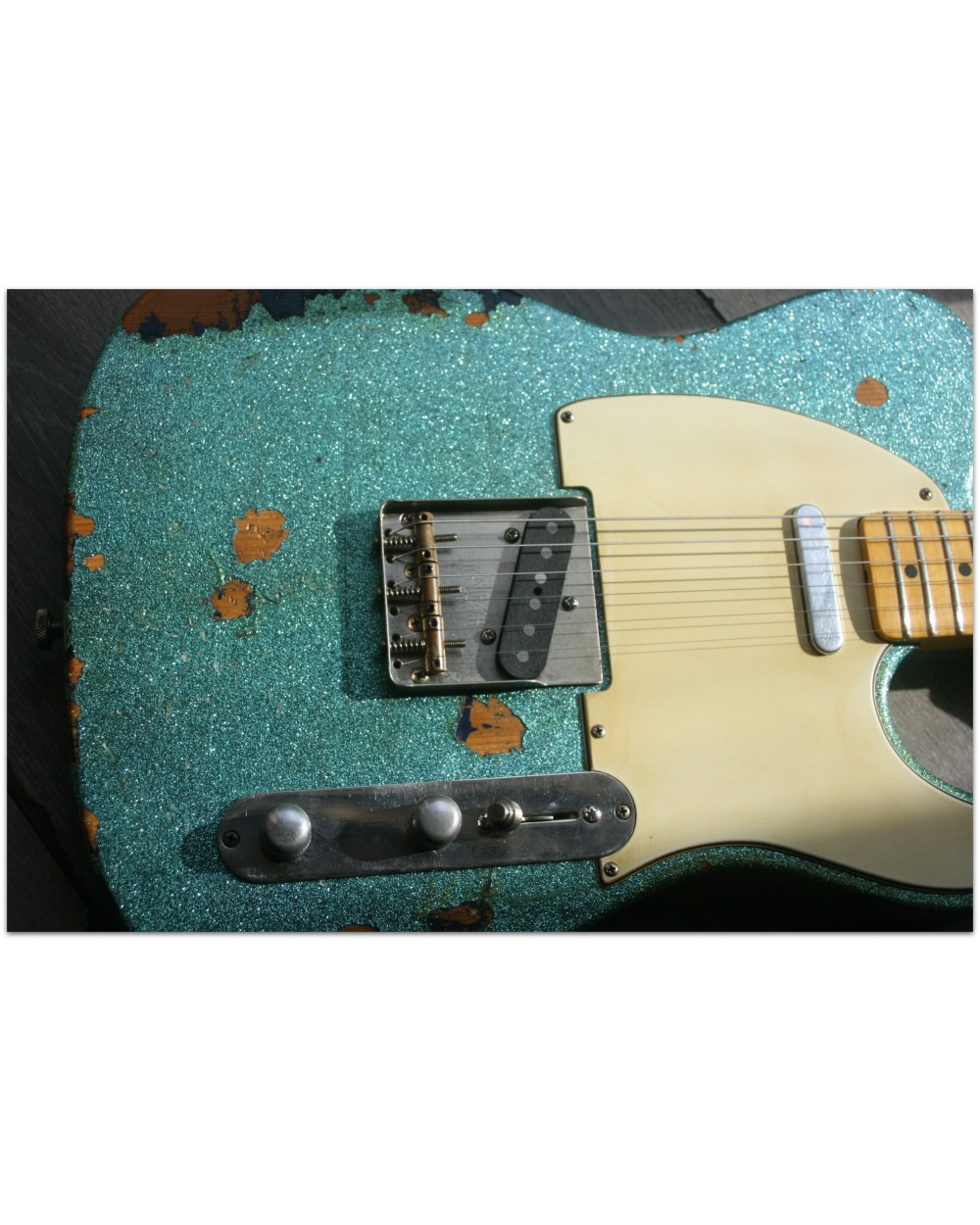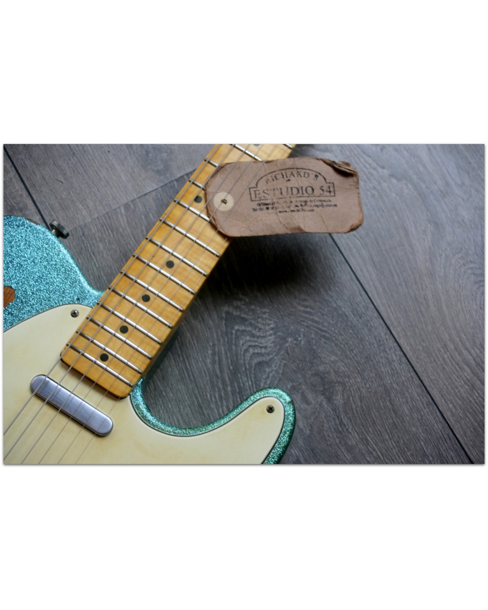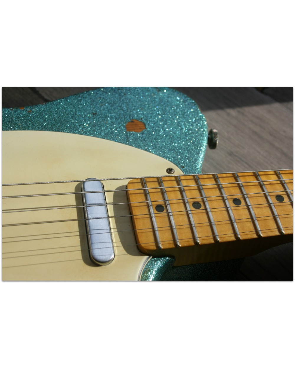 Brand: Nick Page Guitars Model: Maybach Custom Shop by Nick Page: Teleman „Mermaid Turquoise Sparkle“ Serial No.: 3 of 4 pieces made worldwide Type: Single Cutaway, Solidbody, T-Style Body: Wood: Spruce (Fichte) Pickguard: Vintage White Pearloid - aged Neck: Wood: Roasted Flamed Maple (bolt-on) Scale length: 648 mm / 25,5“ Shape: Strong but handy C Radius: 9,5“ Inlays: Dot Black Frets: 6105 Nut: Bone Finish: Oiled Colour/Finish: Colour: Mermaid Turquoise Sparkle Finish: Nitro - heavily aged Pick Ups / Electrics: Neck: Van Zandt True Vintage Bridge: Van Zandt True Vintage Hardware finish: Aged Hardware: Tuners: Gotoh Vintage Style Bridge: Maybach T-Style Other: Weight: Angabe folgt Case: Branded Case with Paisley-style embossings
