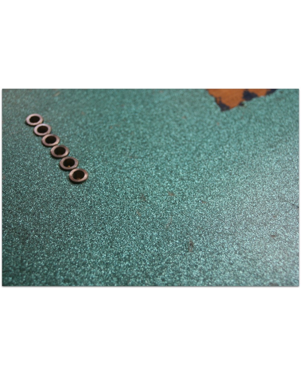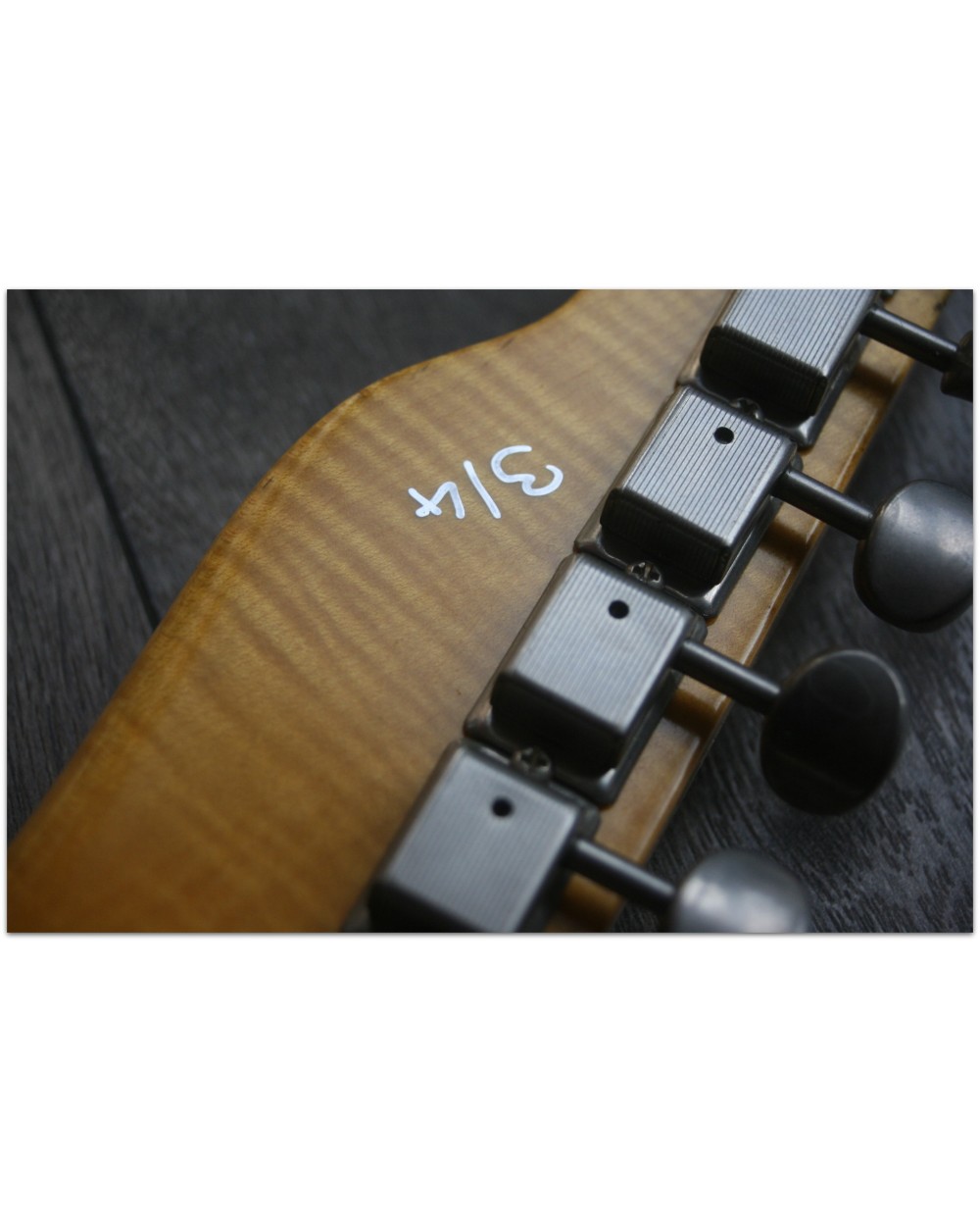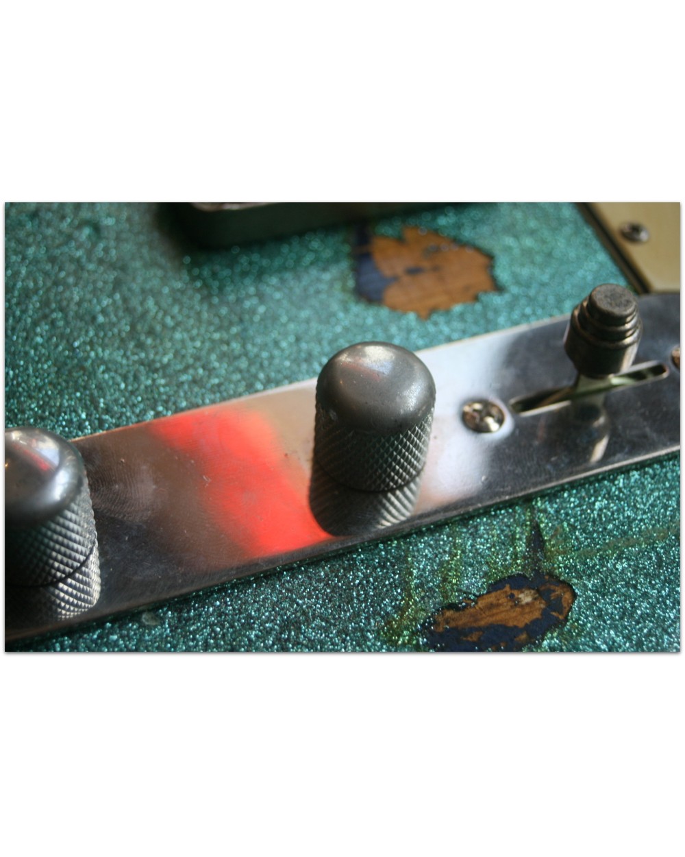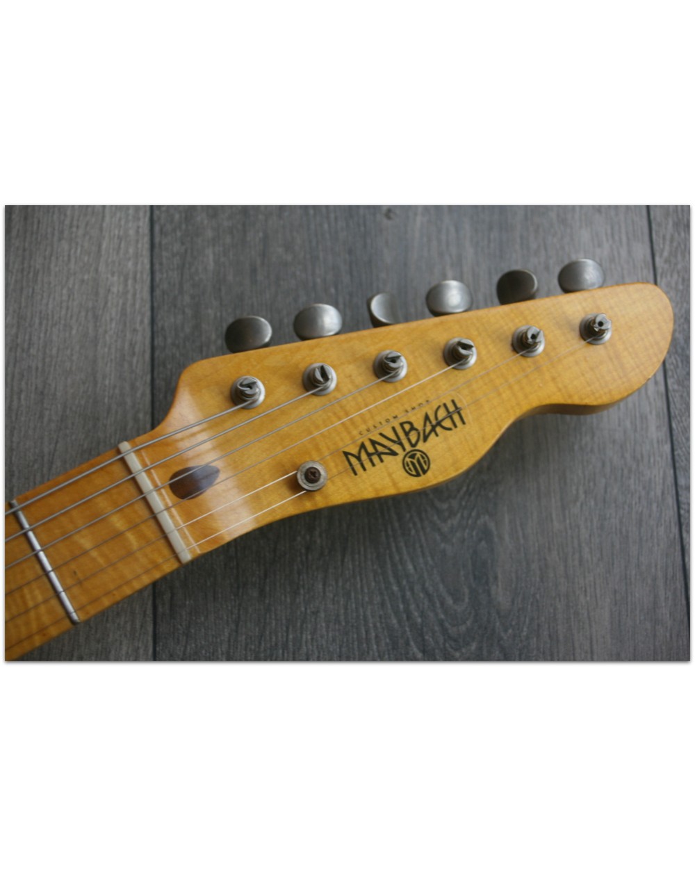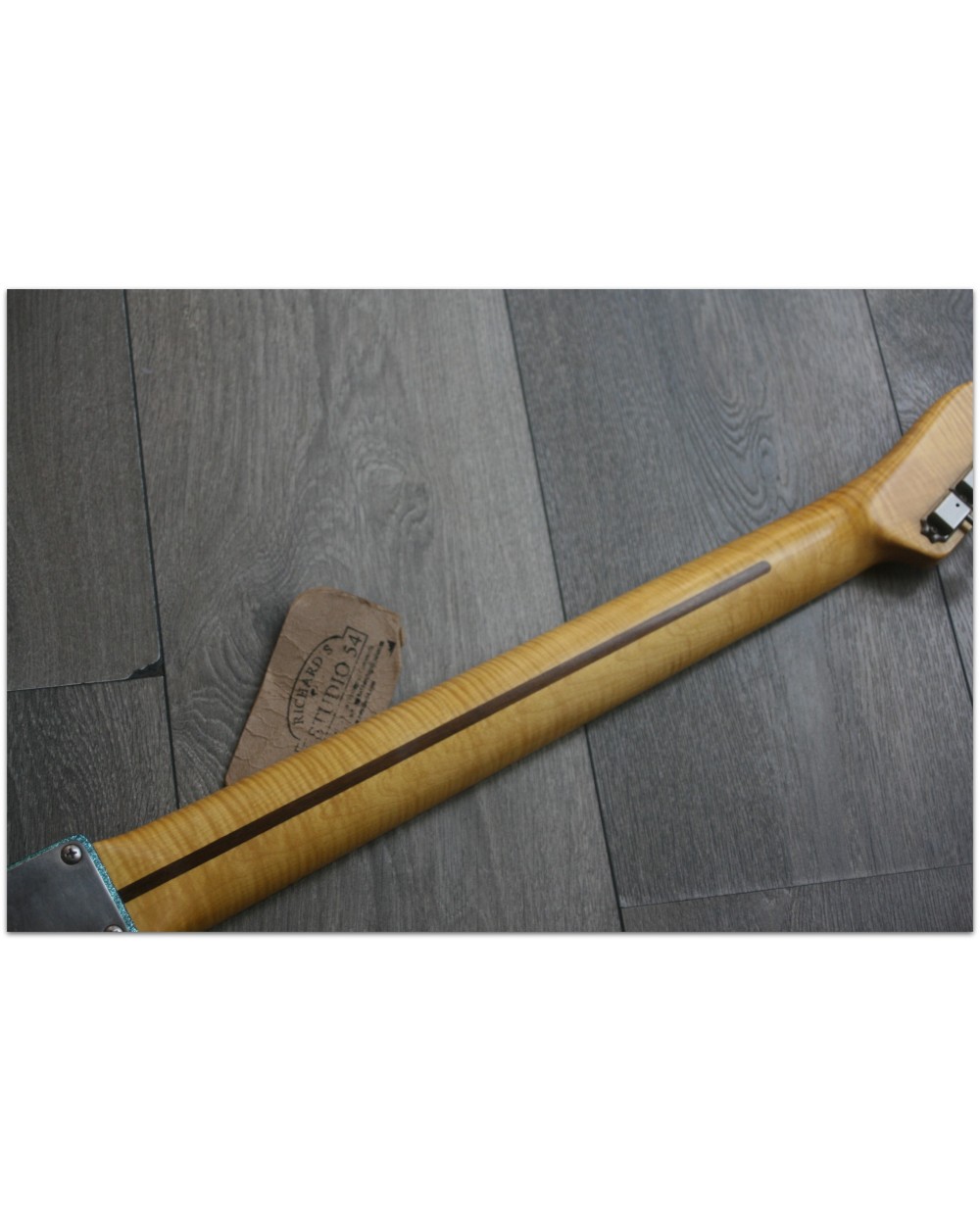 Brand: Nick Page Guitars Model: Maybach Custom Shop by Nick Page: Teleman „Mermaid Turquoise Sparkle“ Serial No.: 3 of 4 pieces made worldwide Type: Single Cutaway, Solidbody, T-Style Body: Wood: Spruce (Fichte) Pickguard: Vintage White Pearloid - aged Neck: Wood: Roasted Flamed Maple (bolt-on) Scale length: 648 mm / 25,5“ Shape: Strong but handy C Radius: 9,5“ Inlays: Dot Black Frets: 6105 Nut: Bone Finish: Oiled Colour/Finish: Colour: Mermaid Turquoise Sparkle Finish: Nitro - heavily aged Pick Ups / Electrics: Neck: Van Zandt True Vintage Bridge: Van Zandt True Vintage Hardware finish: Aged Hardware: Tuners: Gotoh Vintage Style Bridge: Maybach T-Style Other: Weight: Angabe folgt Case: Branded Case with Paisley-style embossings